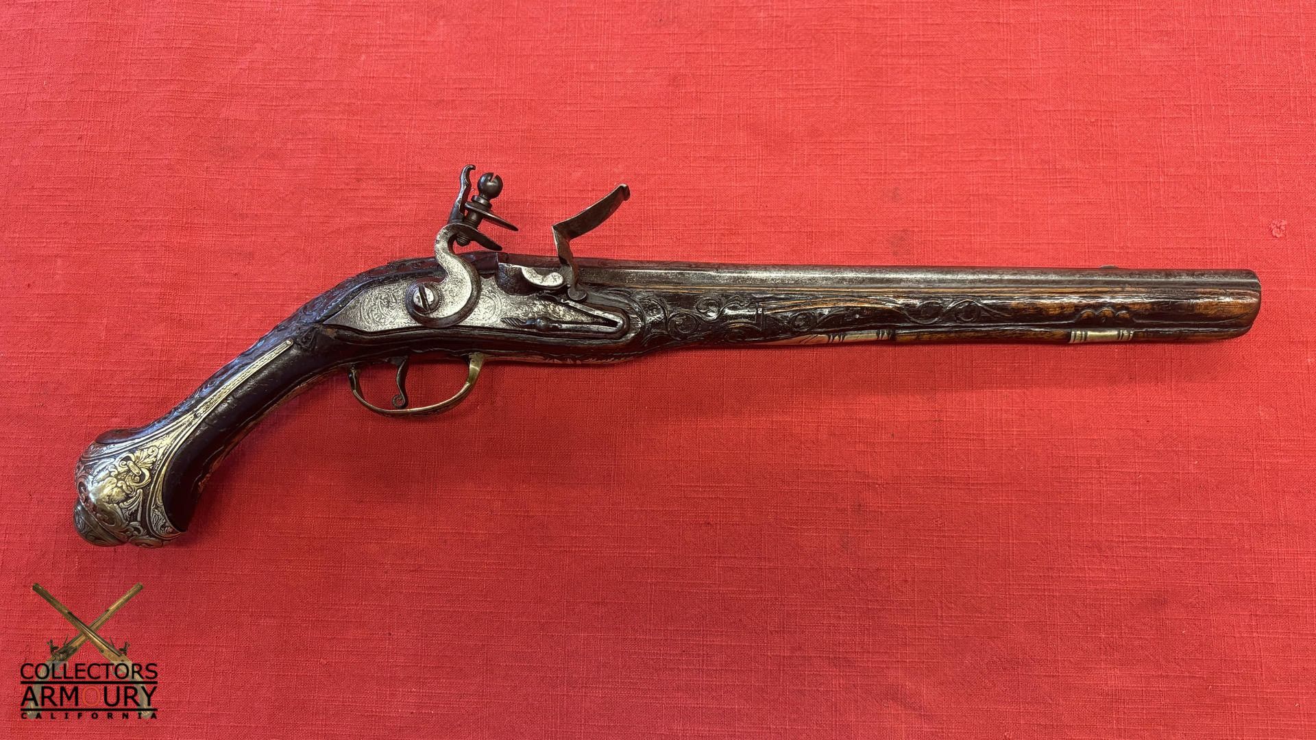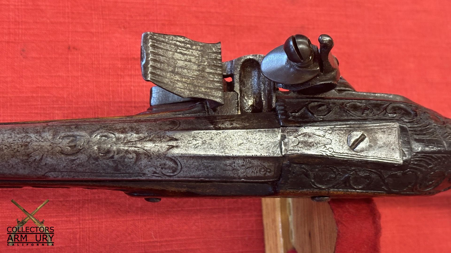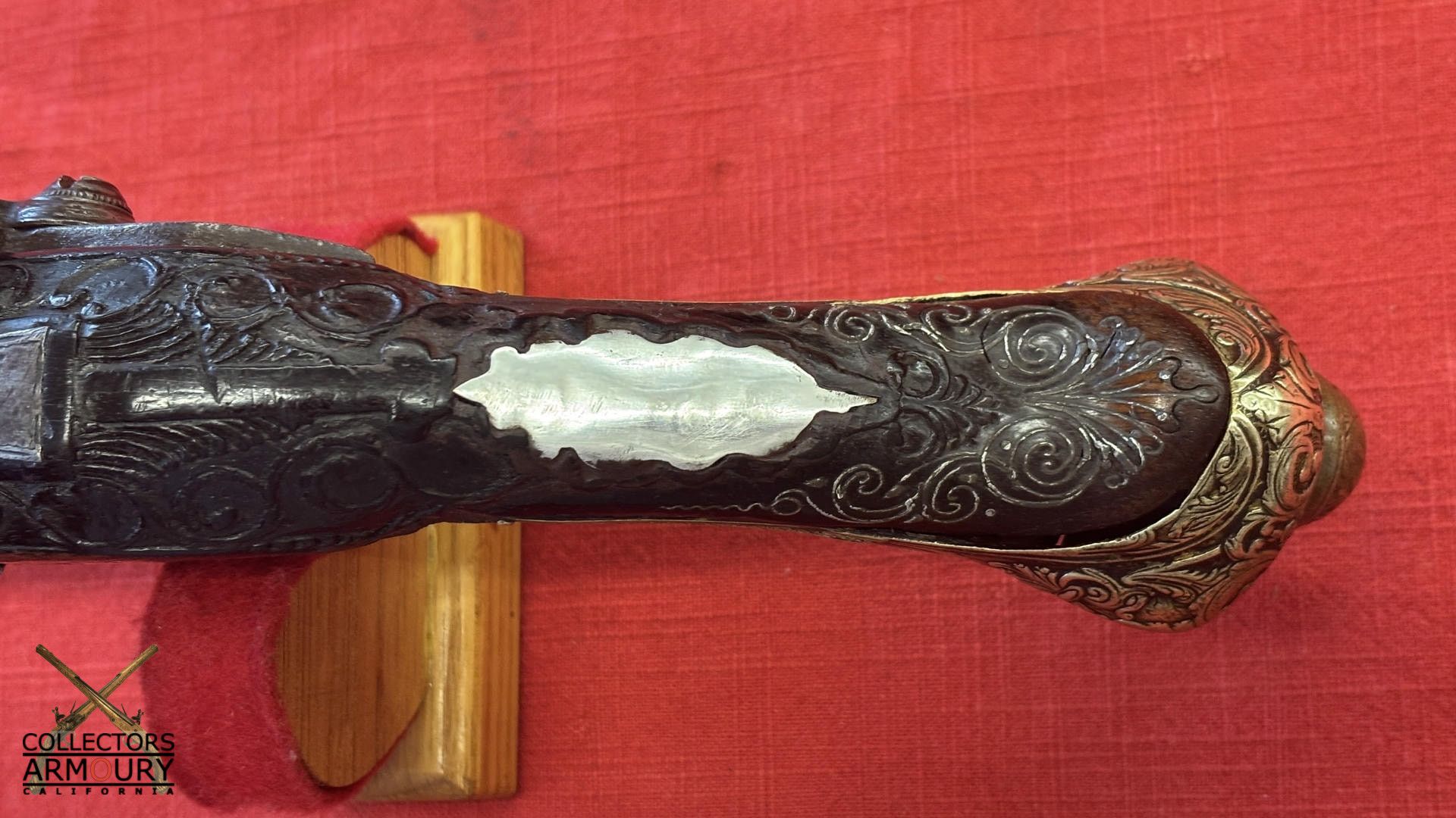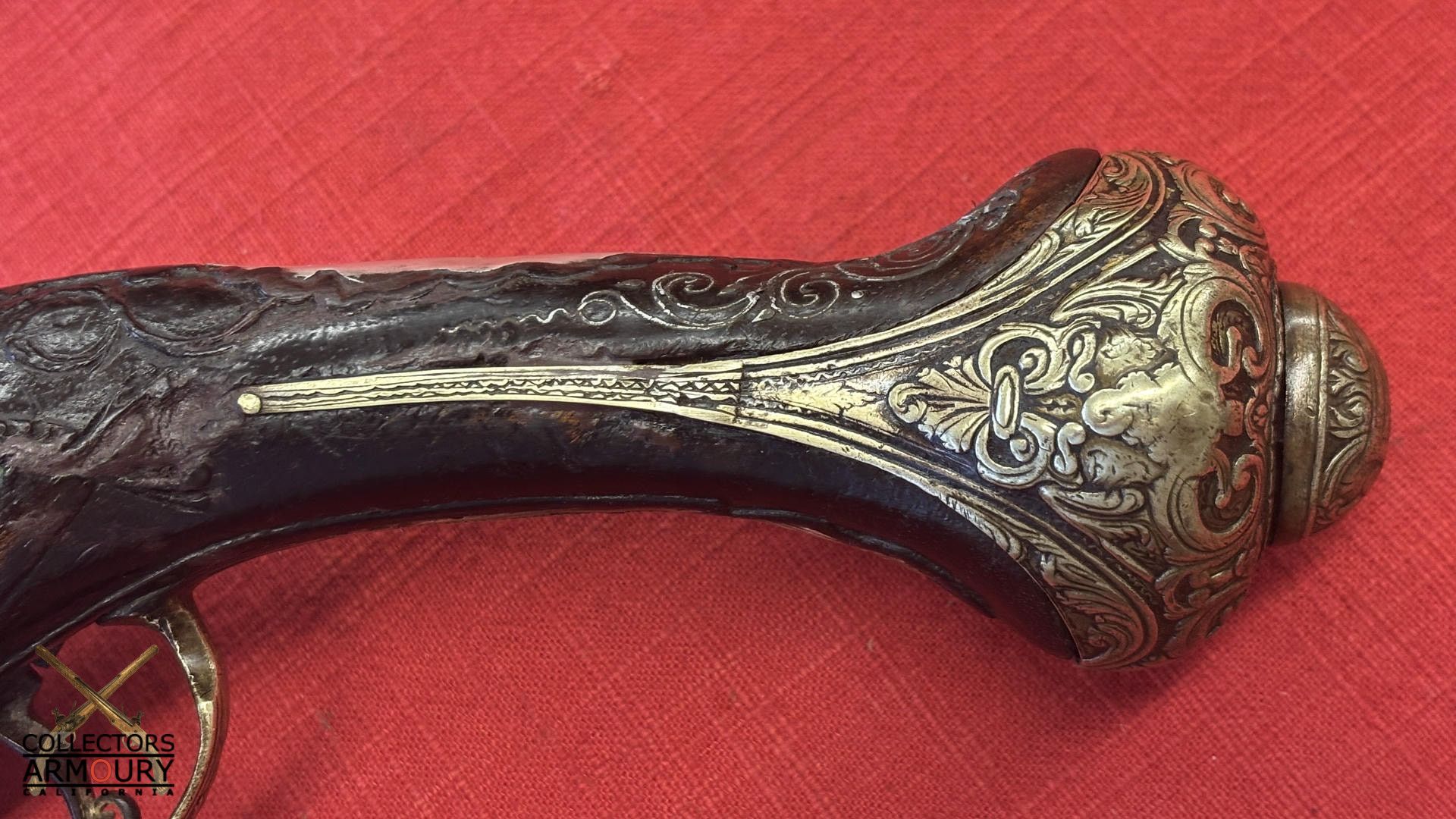 Dark walnut full stock relief carved throughout its length with scrollwork and silver wire inlay at wrist. Condition of pistol shows considerable wear throughout but no severe losses. Silver thumb piece probably a replacement. Mainspring is so strong we were reluctant to cock it.