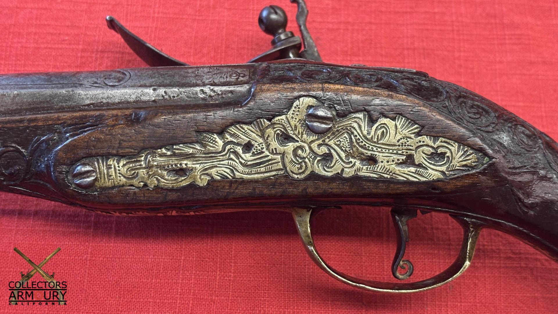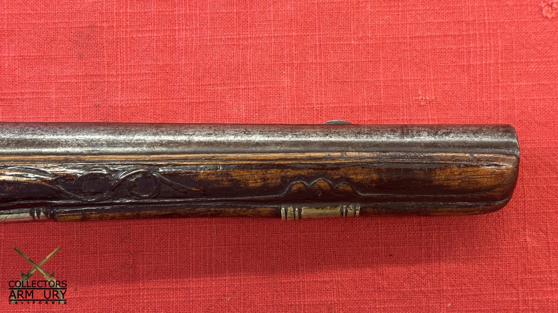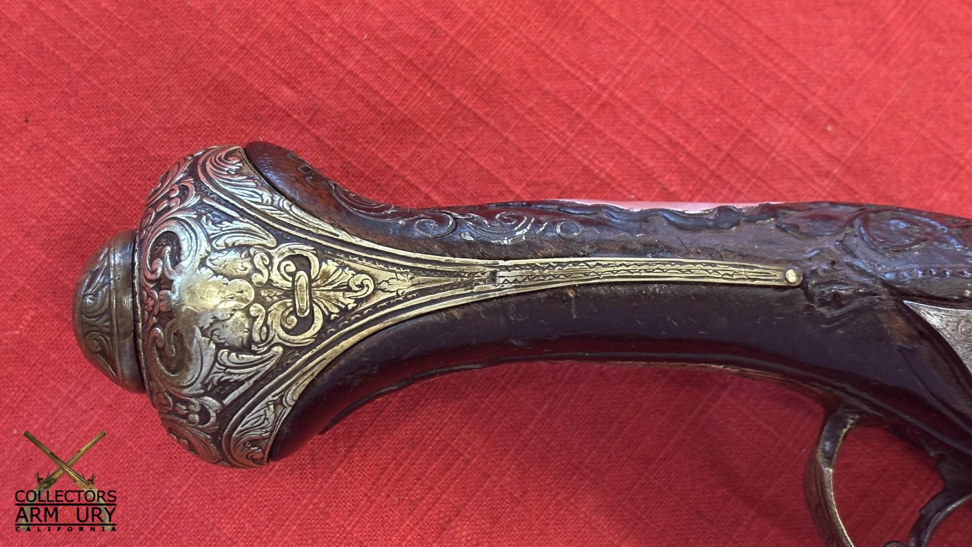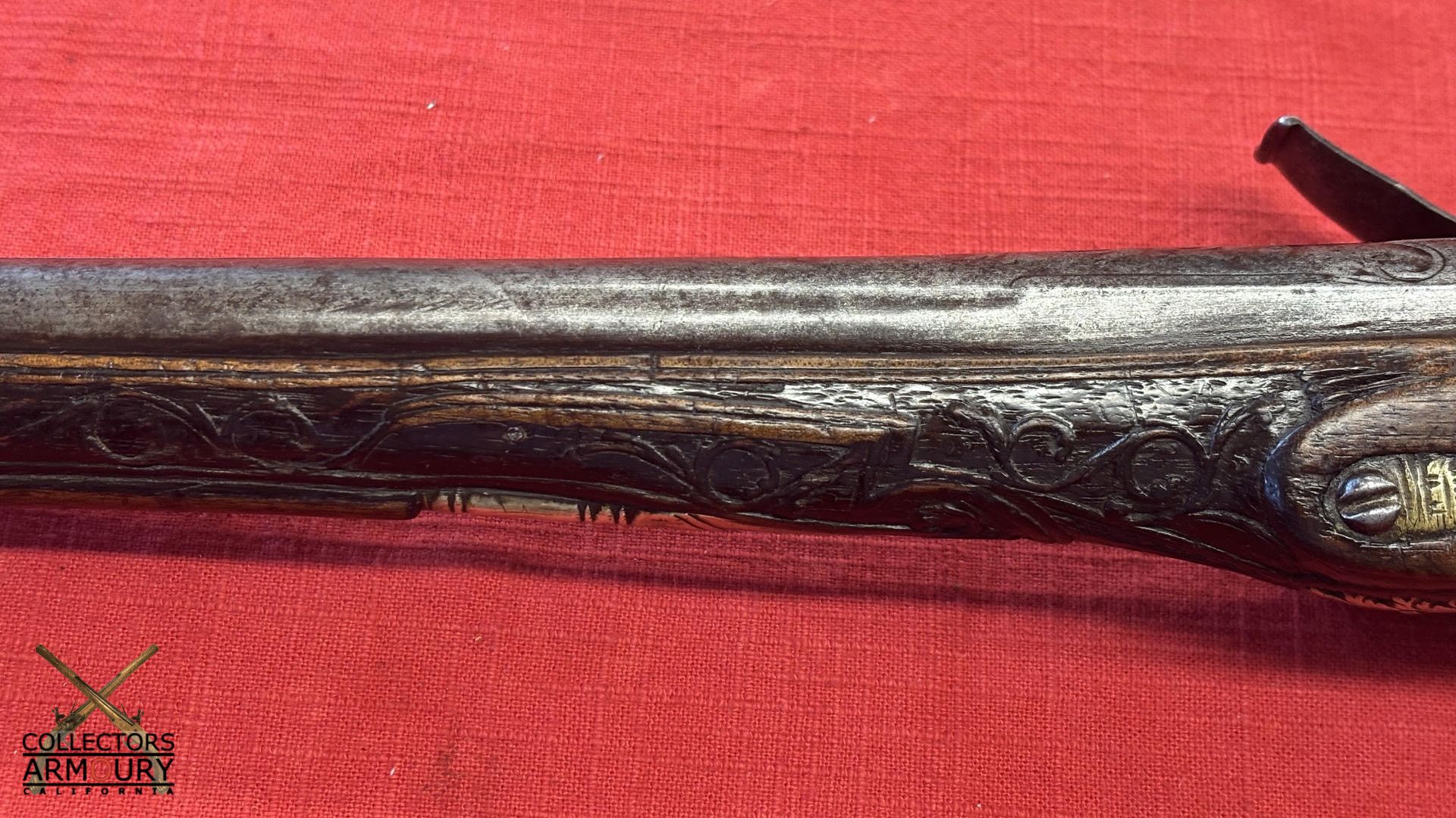 Dark walnut full stock relief carved throughout its length with scrollwork and silver wire inlay at wrist. Condition of pistol shows considerable wear throughout but no severe losses. Silver thumb piece probably a replacement. Mainspring is so strong we were reluctant to cock it.