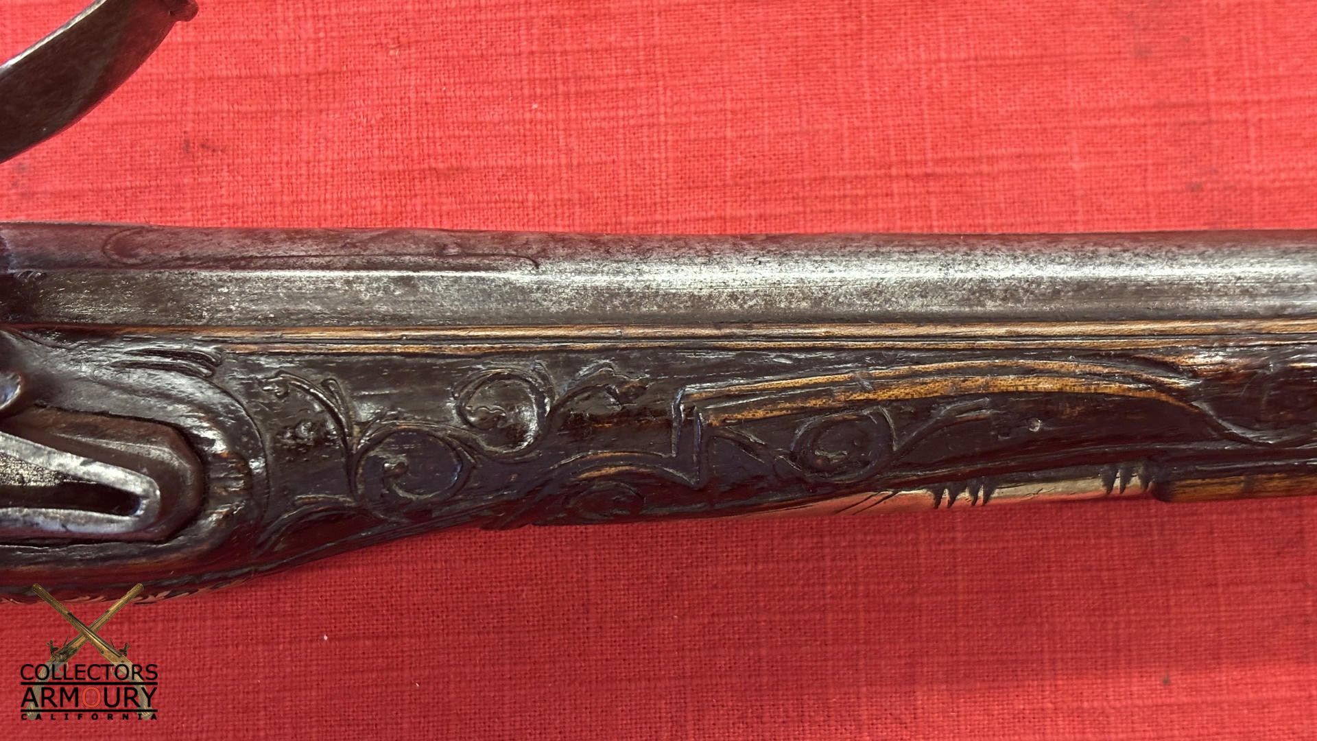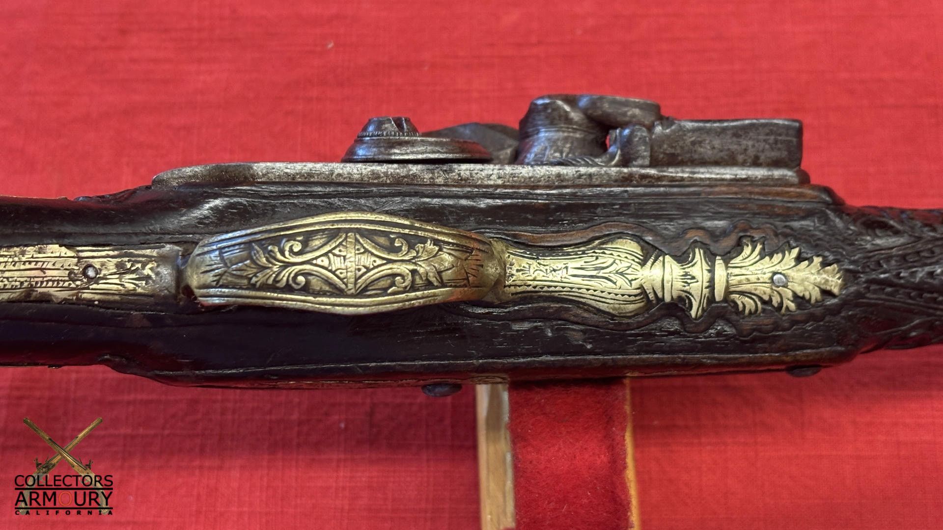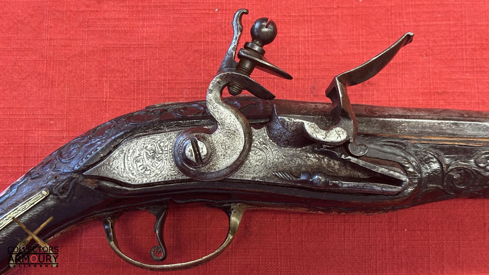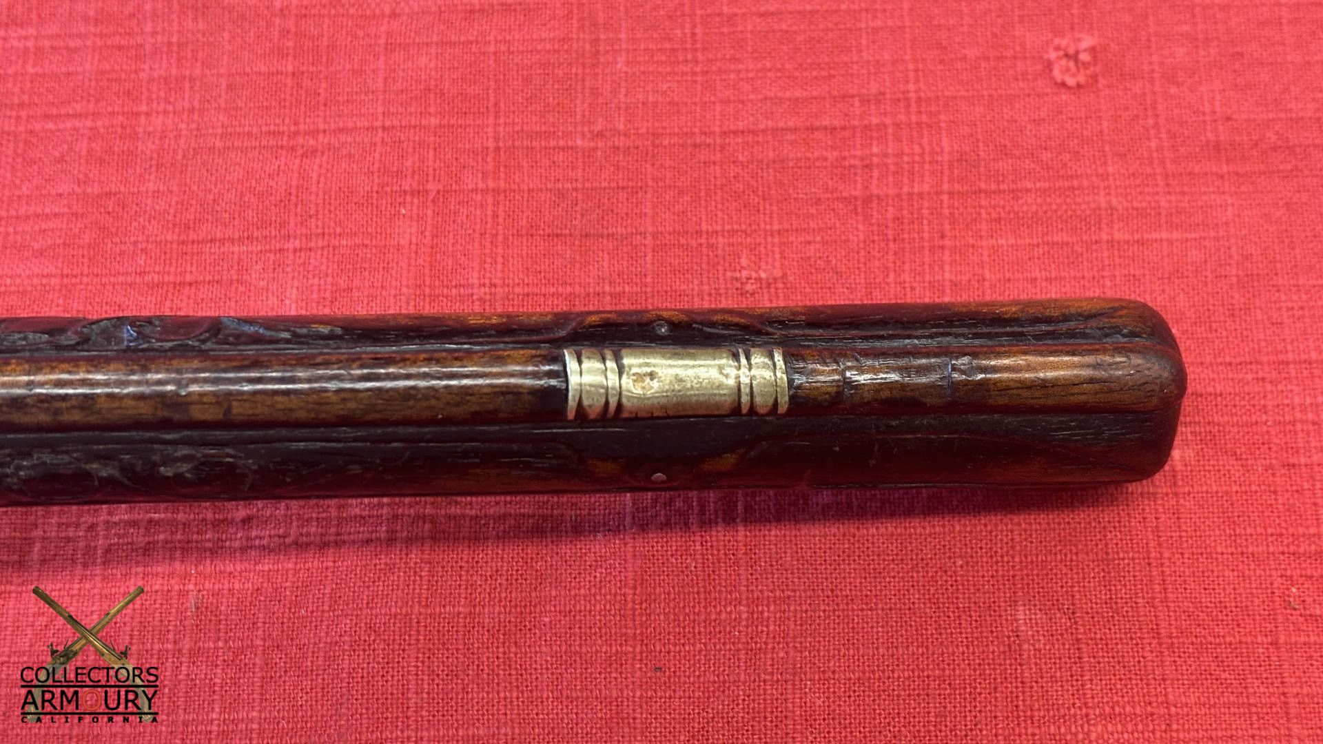 Dark walnut full stock relief carved throughout its length with scrollwork and silver wire inlay at wrist. Condition of pistol shows considerable wear throughout but no severe losses. Silver thumb piece probably a replacement. Mainspring is so strong we were reluctant to cock it.