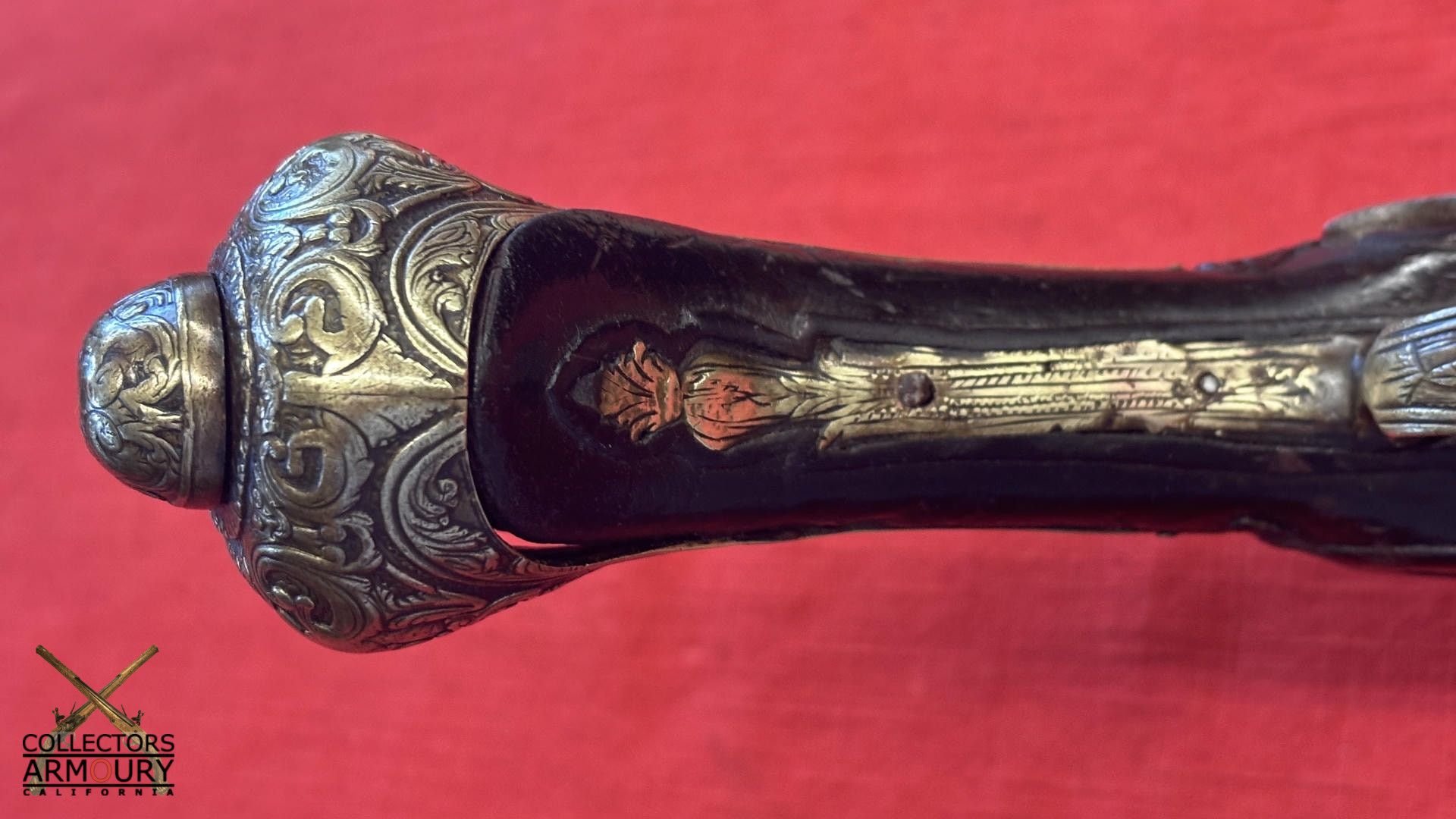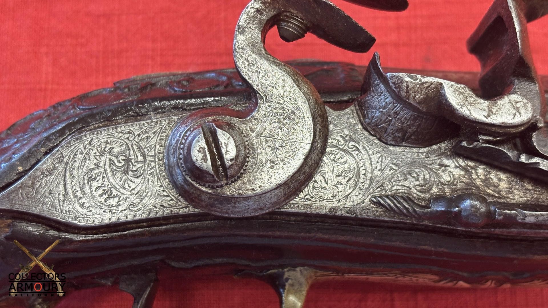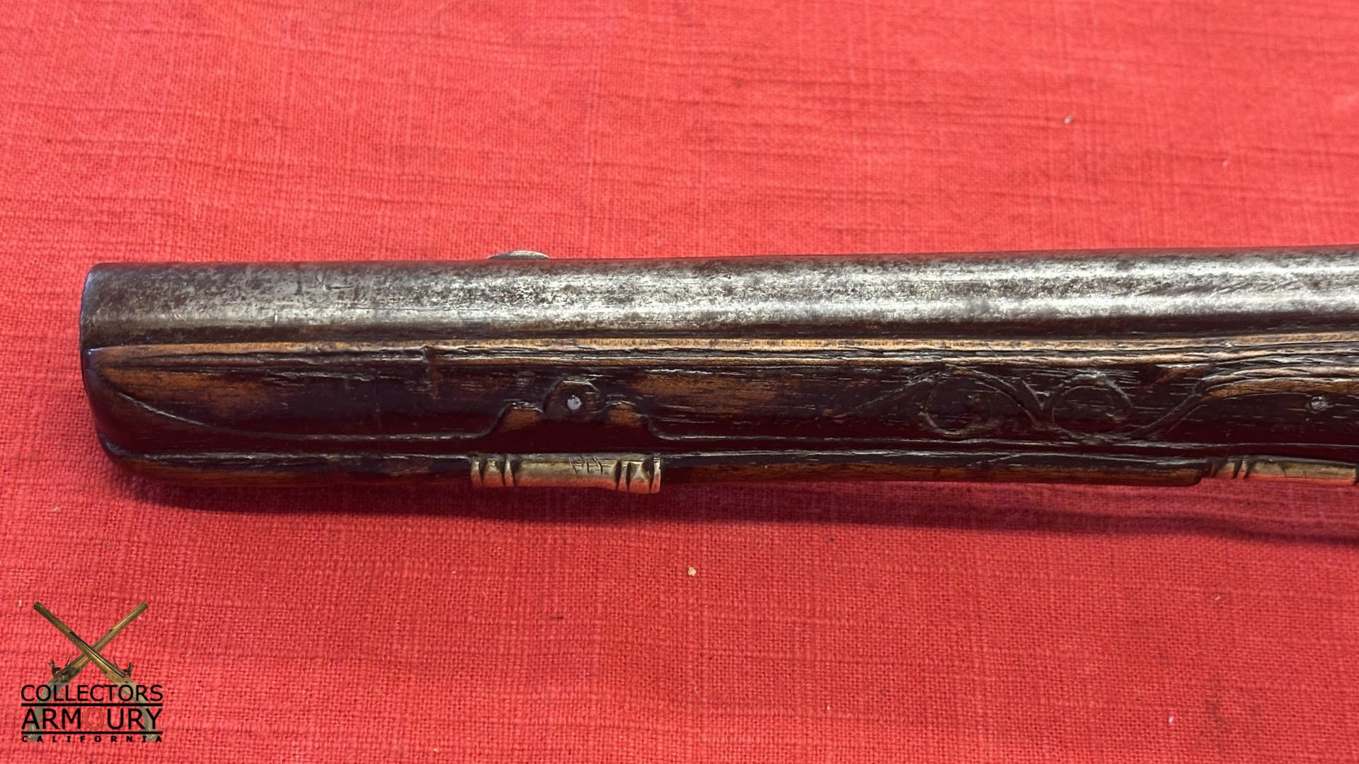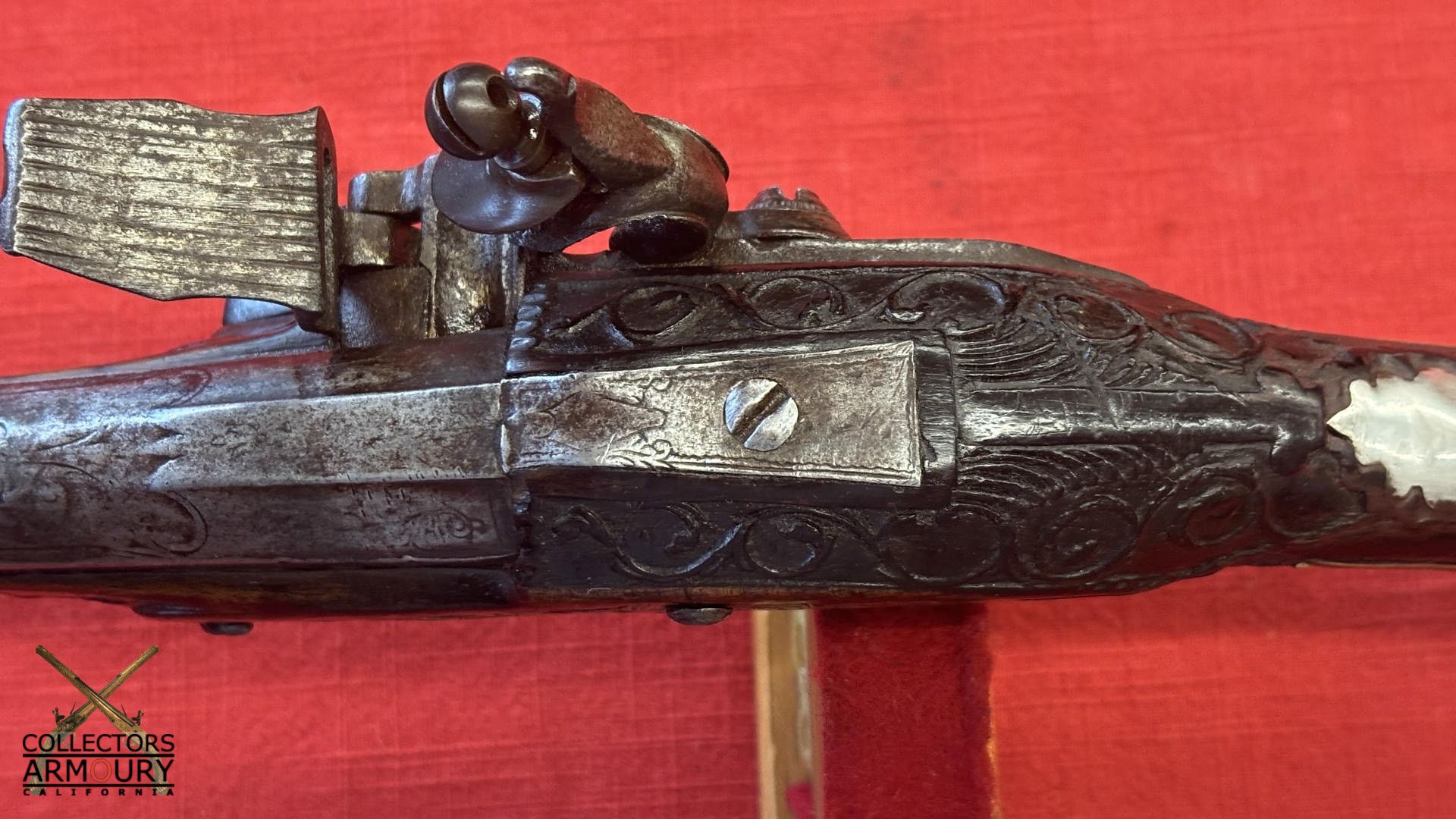 Dark walnut full stock relief carved throughout its length with scrollwork and silver wire inlay at wrist. Condition of pistol shows considerable wear throughout but no severe losses. Silver thumb piece probably a replacement. Mainspring is so strong we were reluctant to cock it.