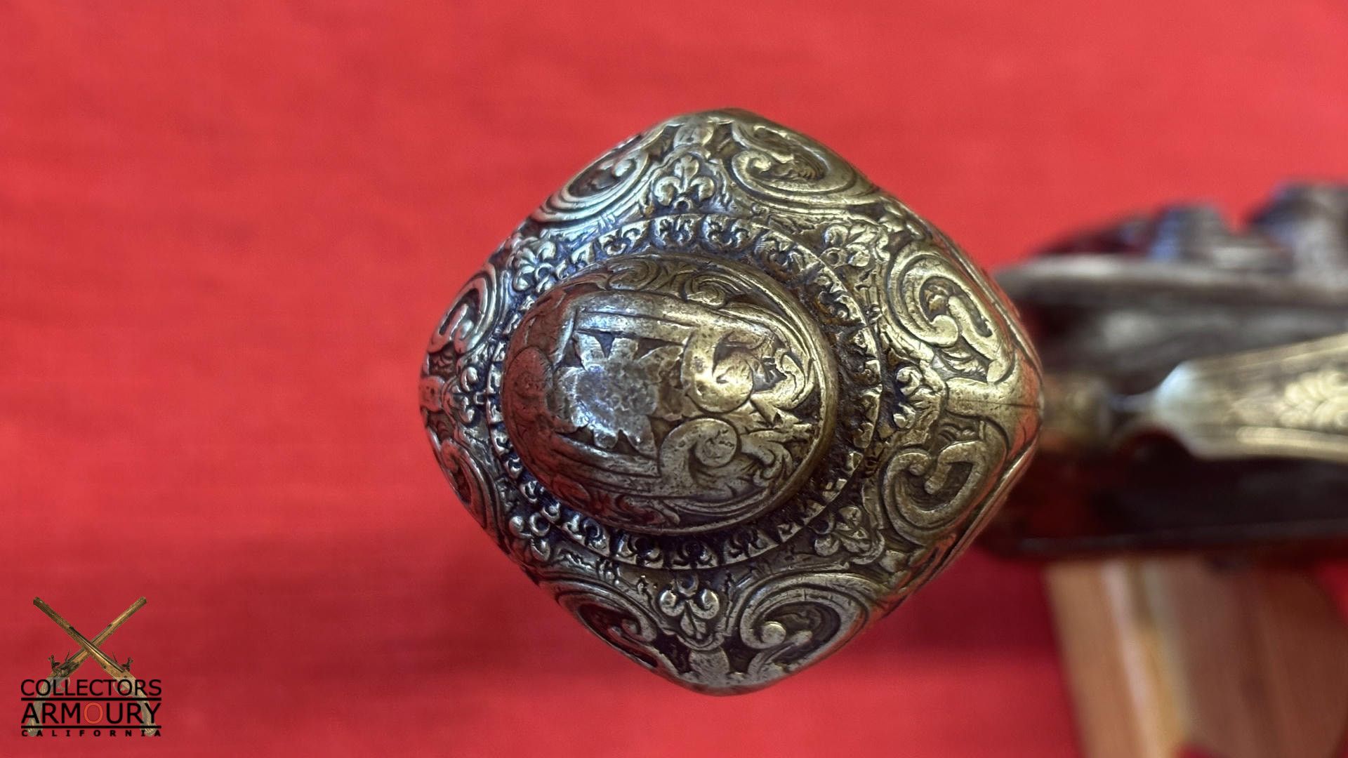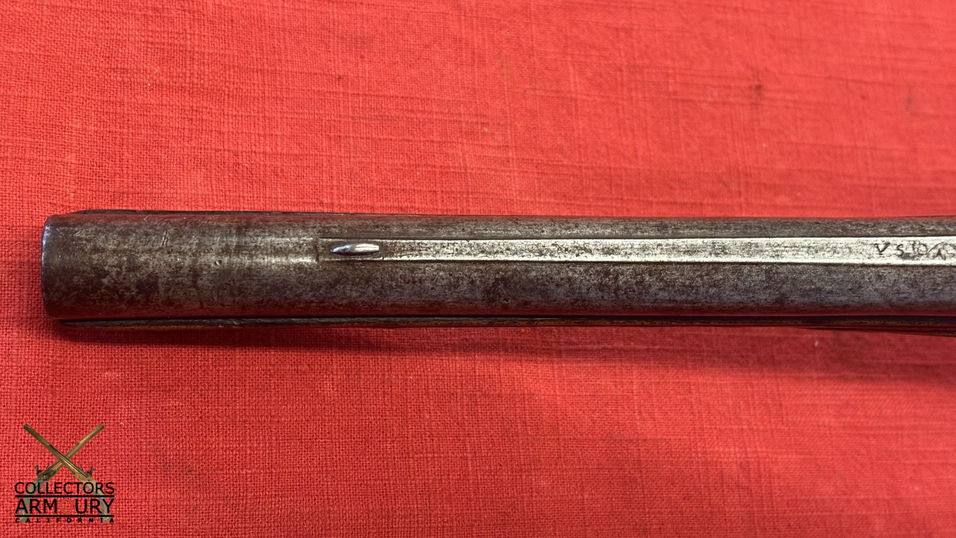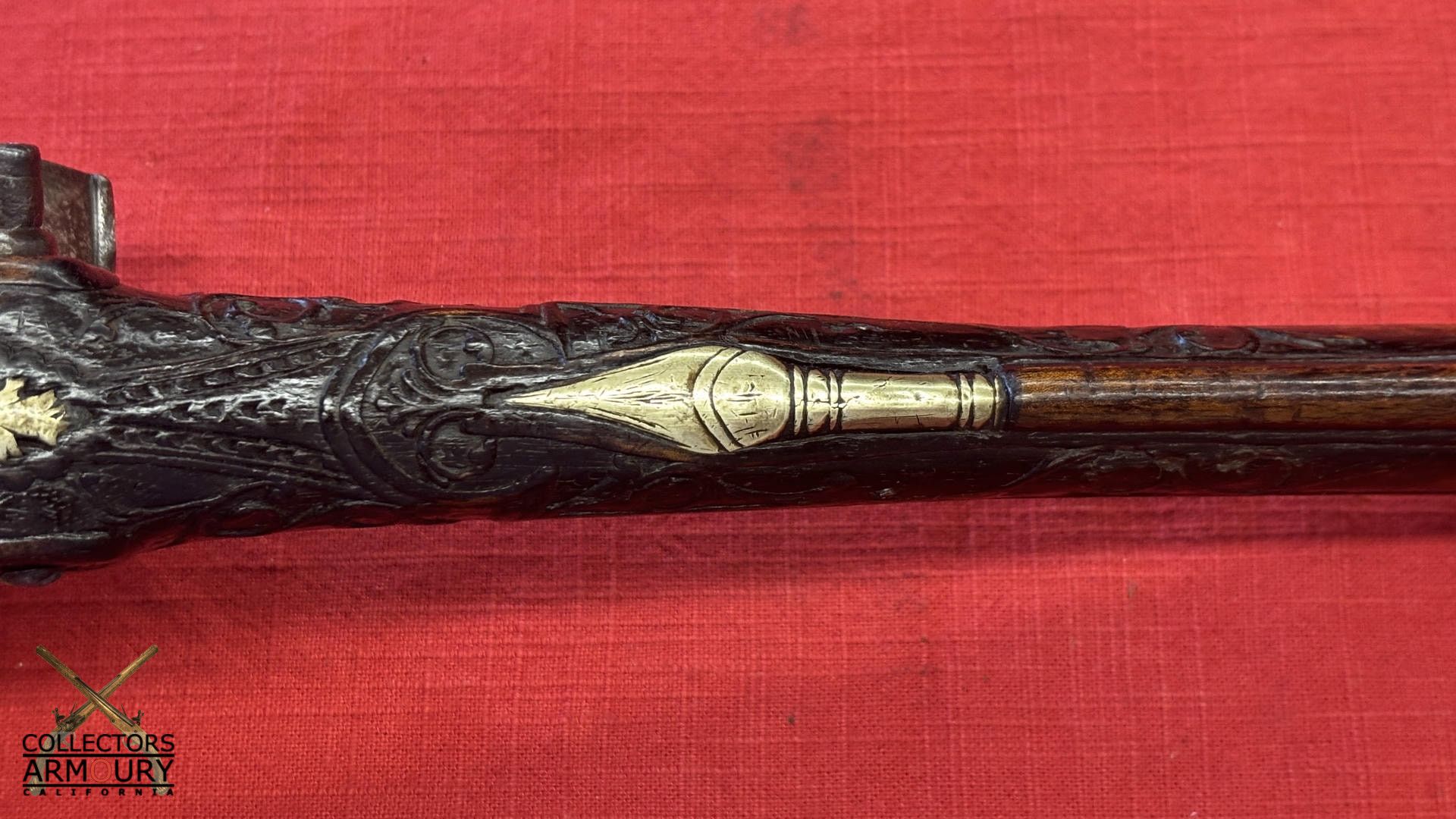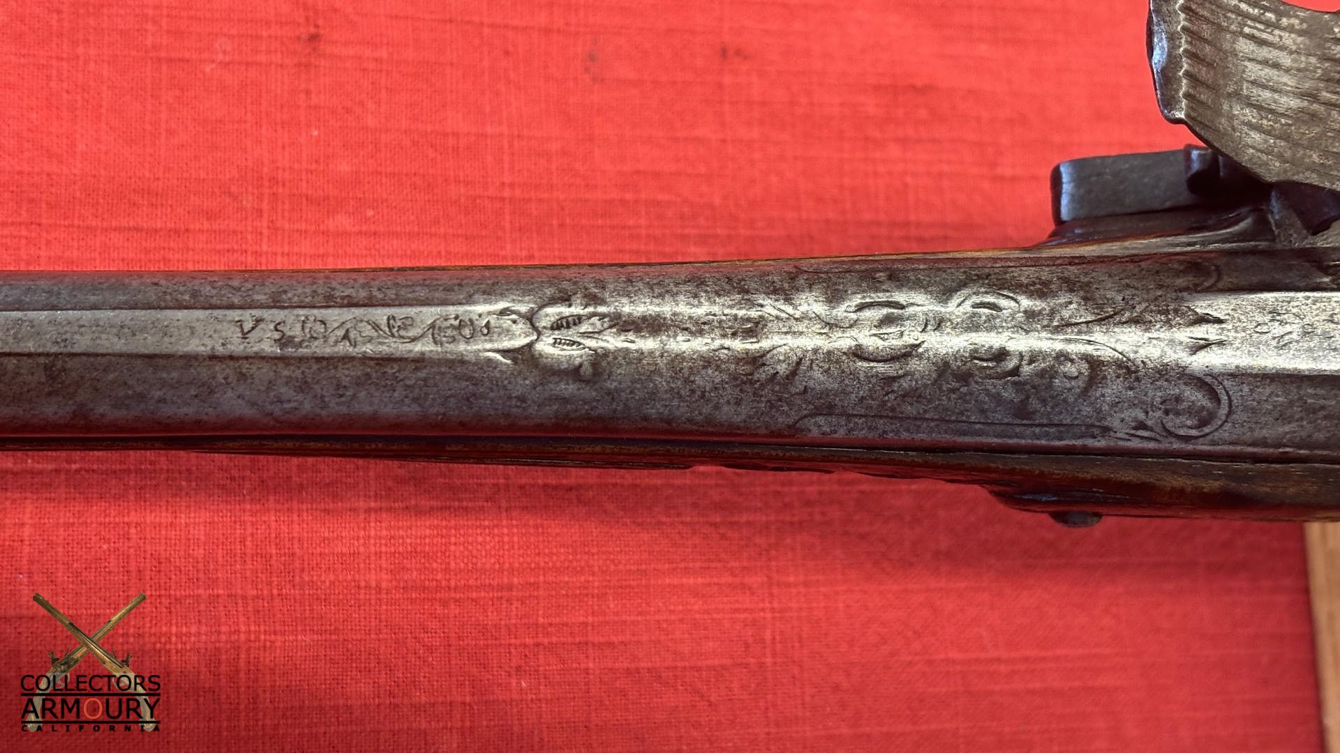 Round barrel with raised central rib and breech section chiseled in low relief with acanthus foliage. The rib with “VS’ initials. The stepped lock with bridled frizzen is engraved with intricate scrollwork. The gooseneck hammer engraved ensuite. Brass mounts are cast and chased with scrollwork. Spurred buttcap with skulcrusher finial.