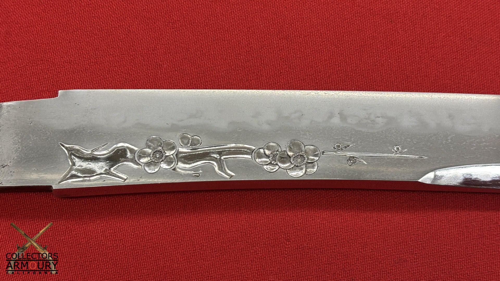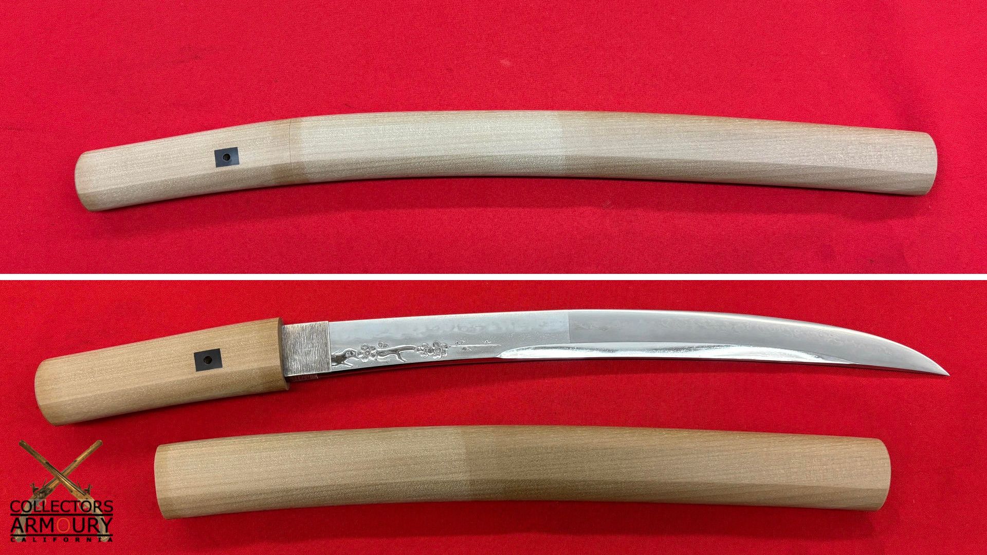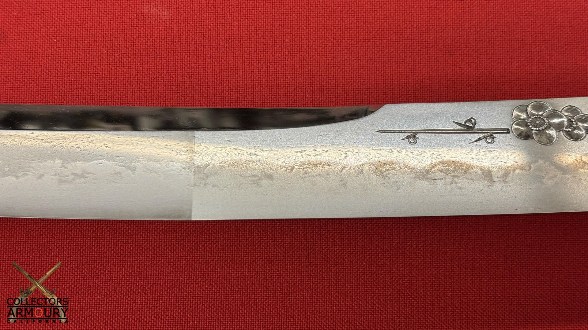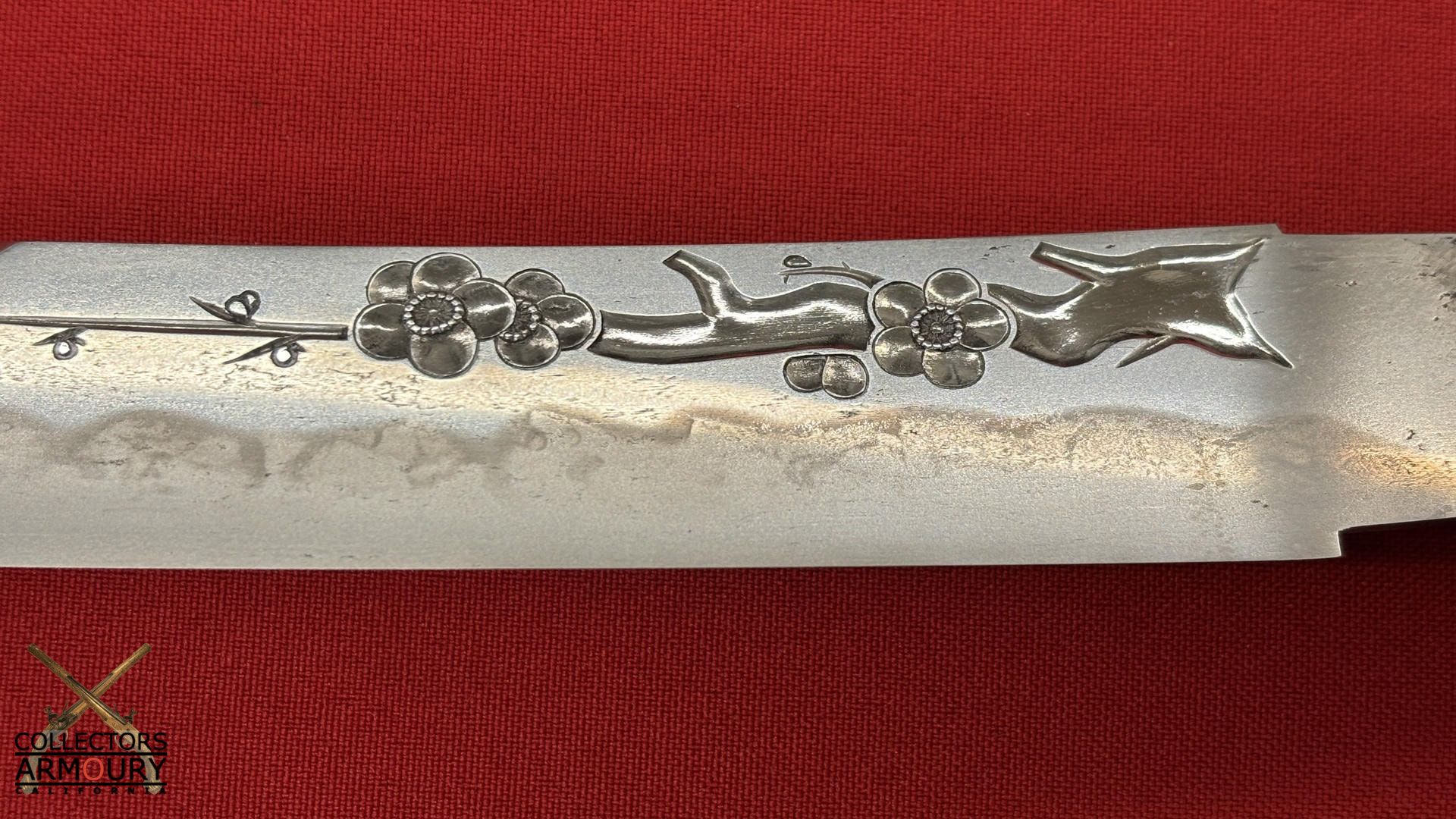 Deeply curved 14 and 1/4 inch blade without ypkote line with superbly carved horimono of a flowering prunus blossom on omote and double bo hi on era. Exuberant and incredibly beautifully rendered choji midare hamon with areas of ashi floating down towards the ha. The hada of extremely fine itame. Solid silver habaki. The nakago is ubu with one mekugi-ana, signed and dated with yoko usuri in mint condition throughout.