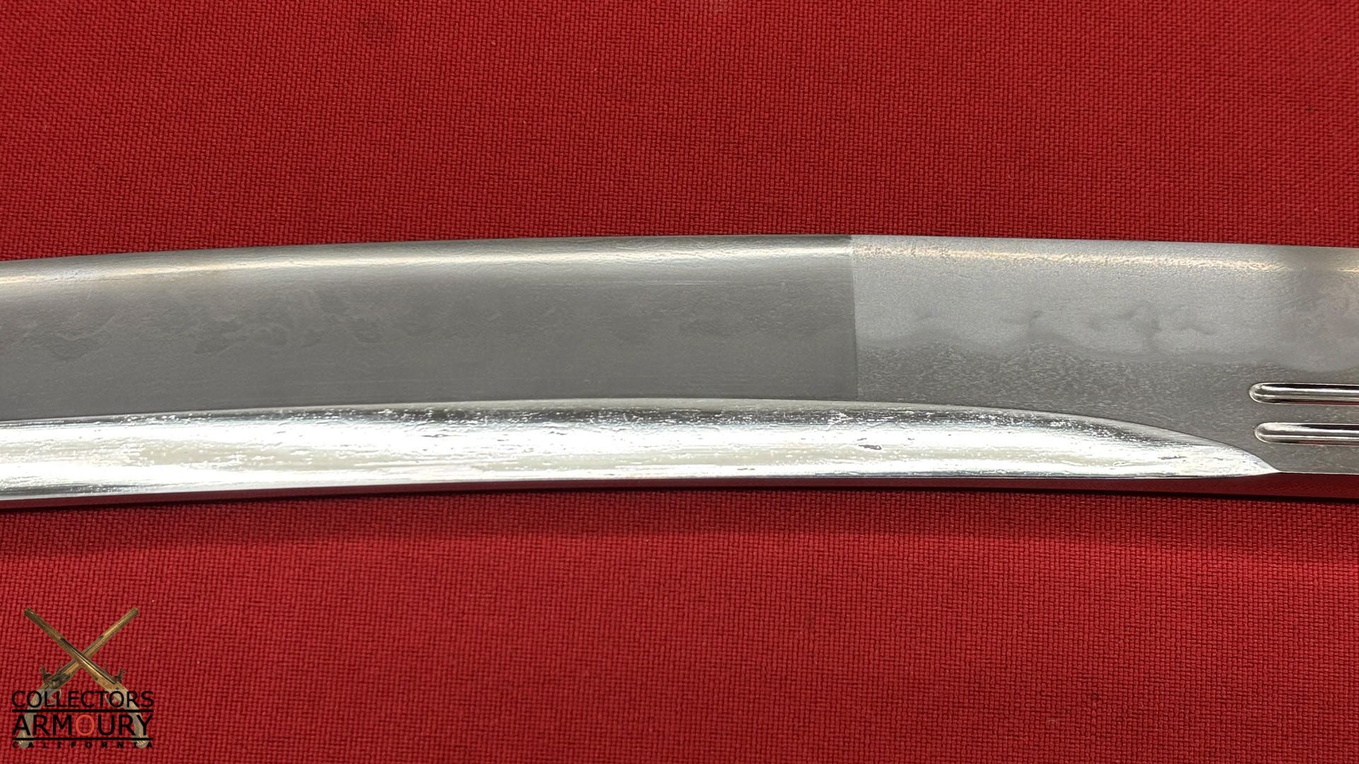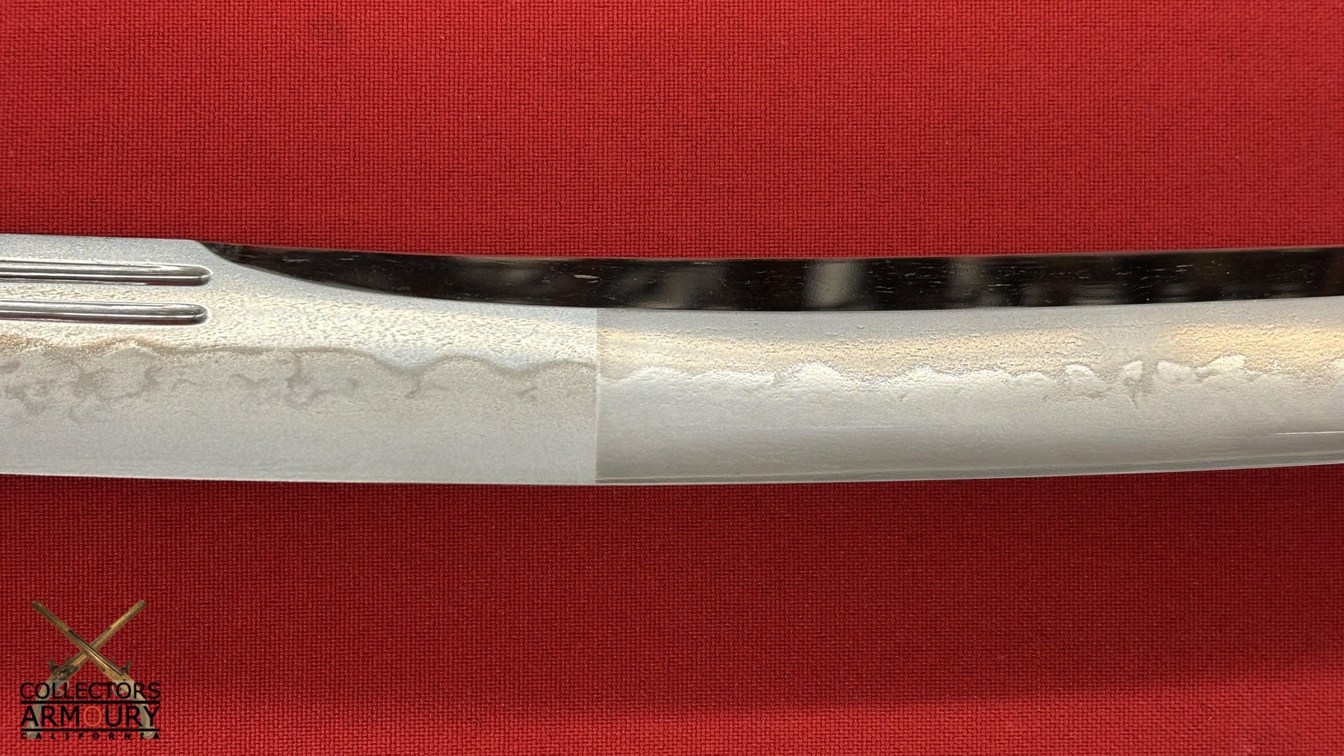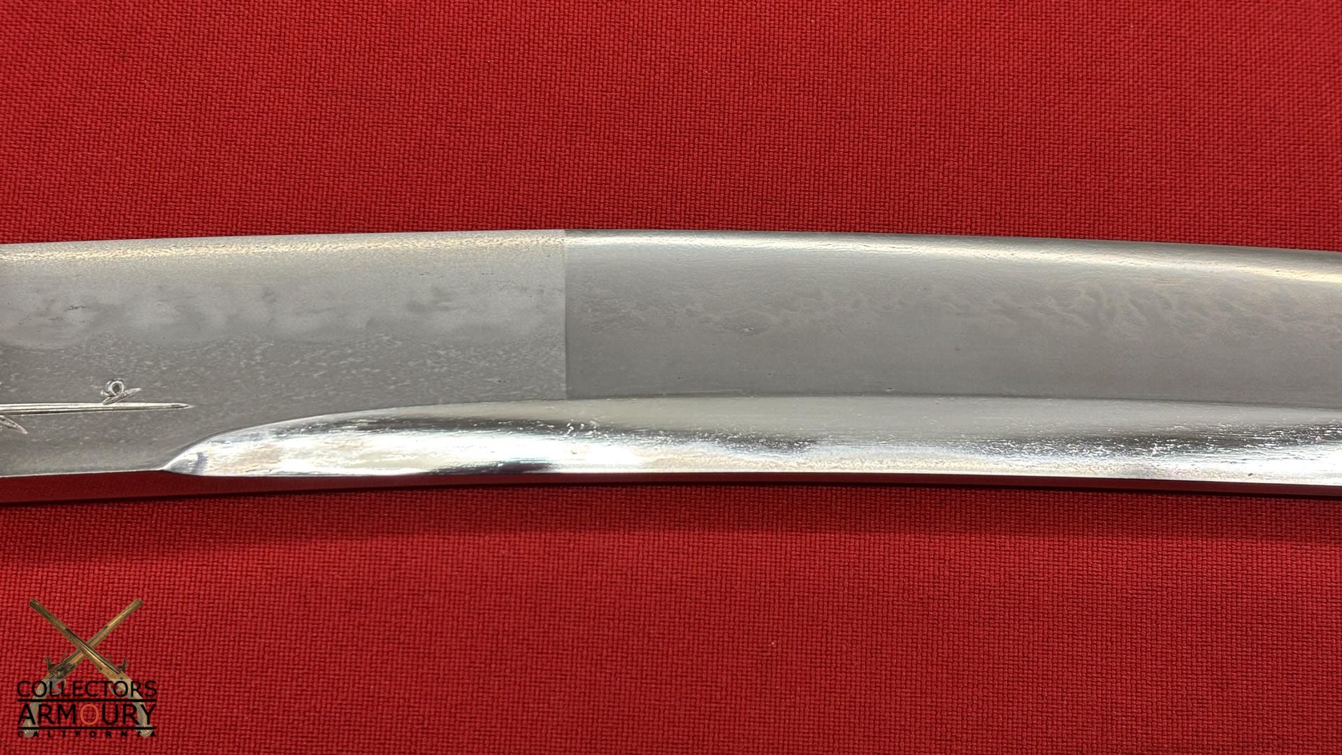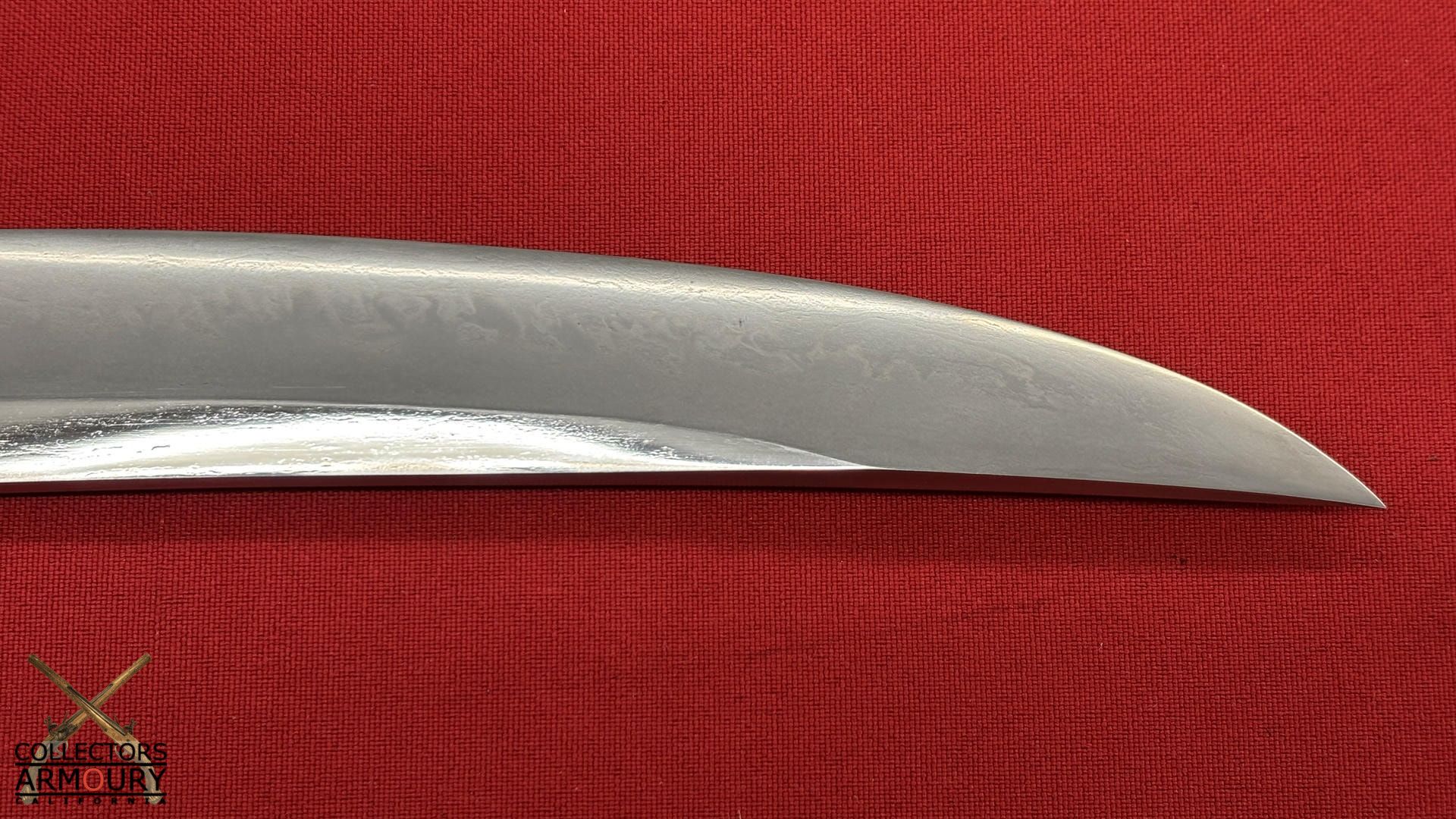 Deeply curved 14 and 1/4 inch blade without ypkote line with superbly carved horimono of a flowering prunus blossom on omote and double bo hi on era. Exuberant and incredibly beautifully rendered choji midare hamon with areas of ashi floating down towards the ha. The hada of extremely fine itame. Solid silver habaki. The nakago is ubu with one mekugi-ana, signed and dated with yoko usuri in mint condition throughout.