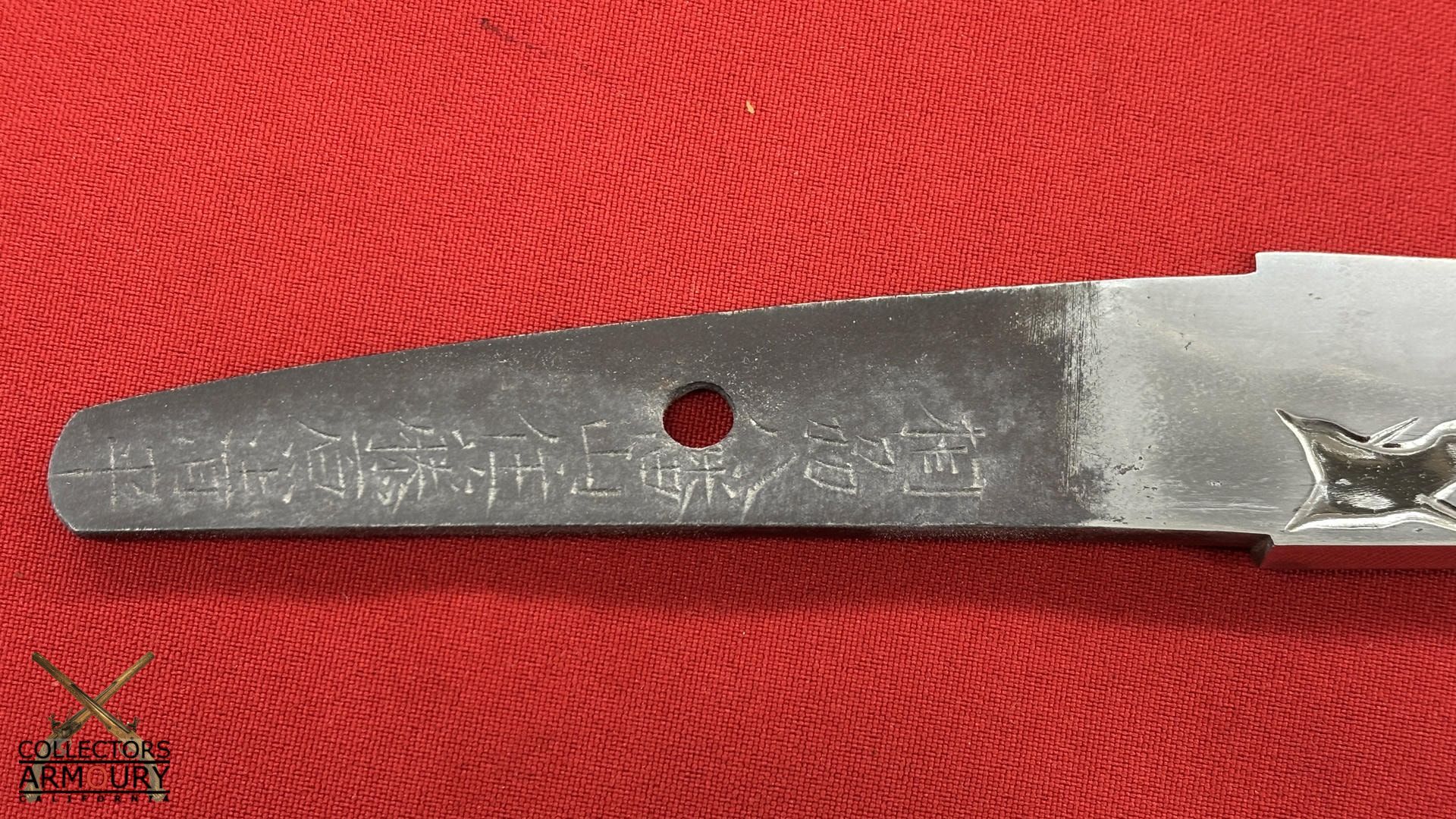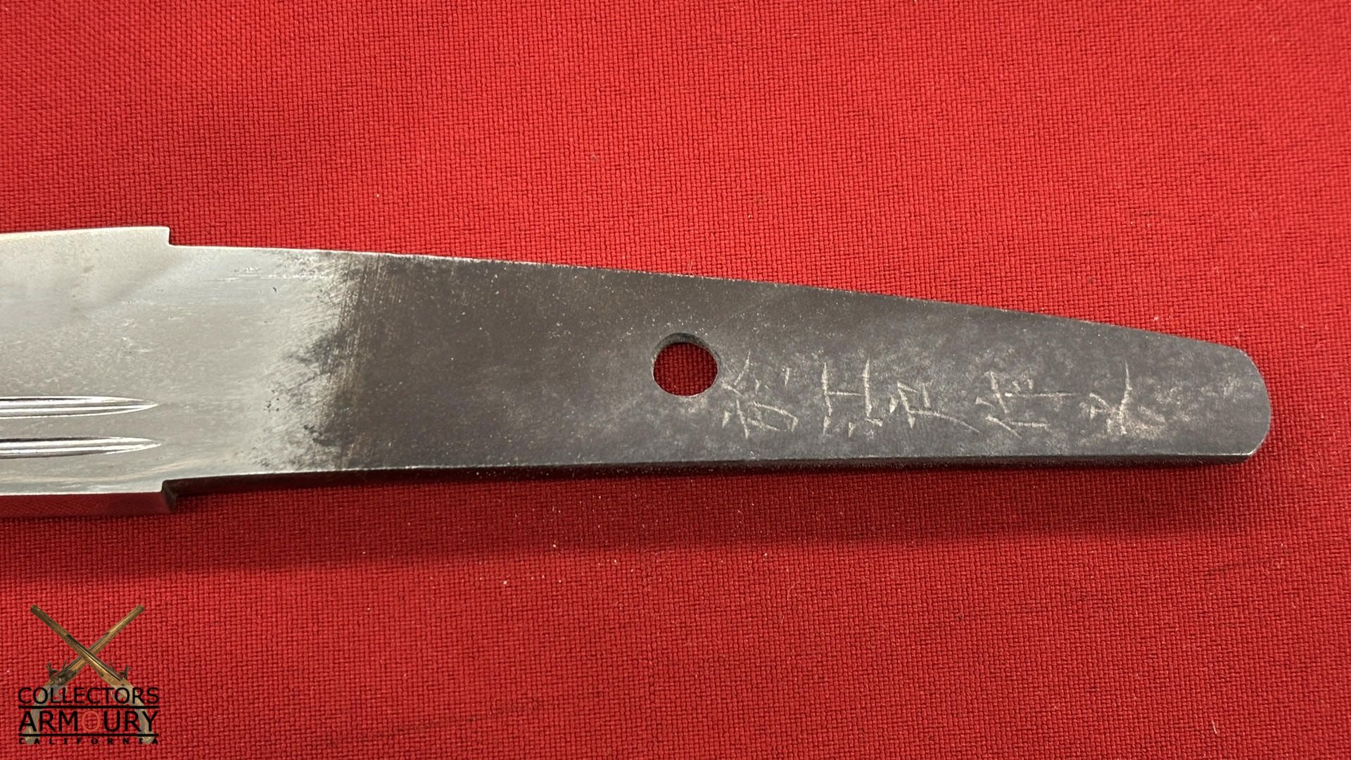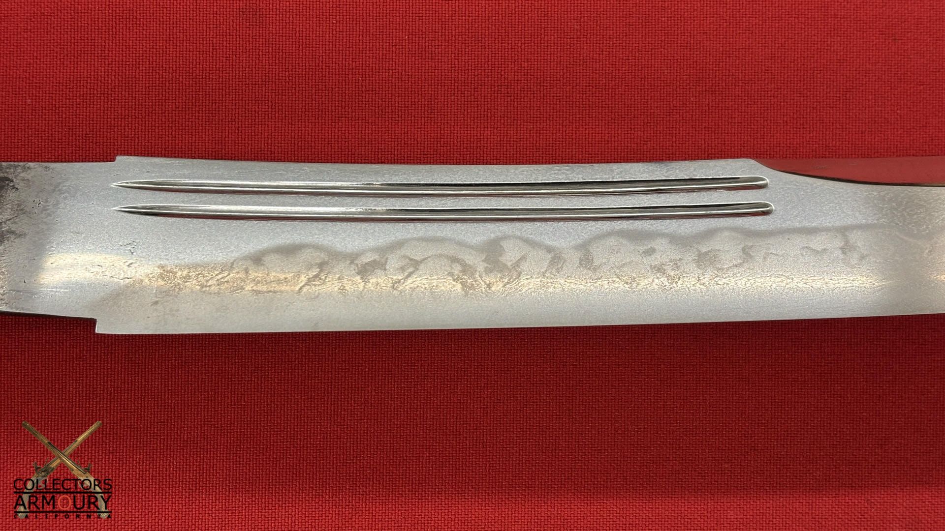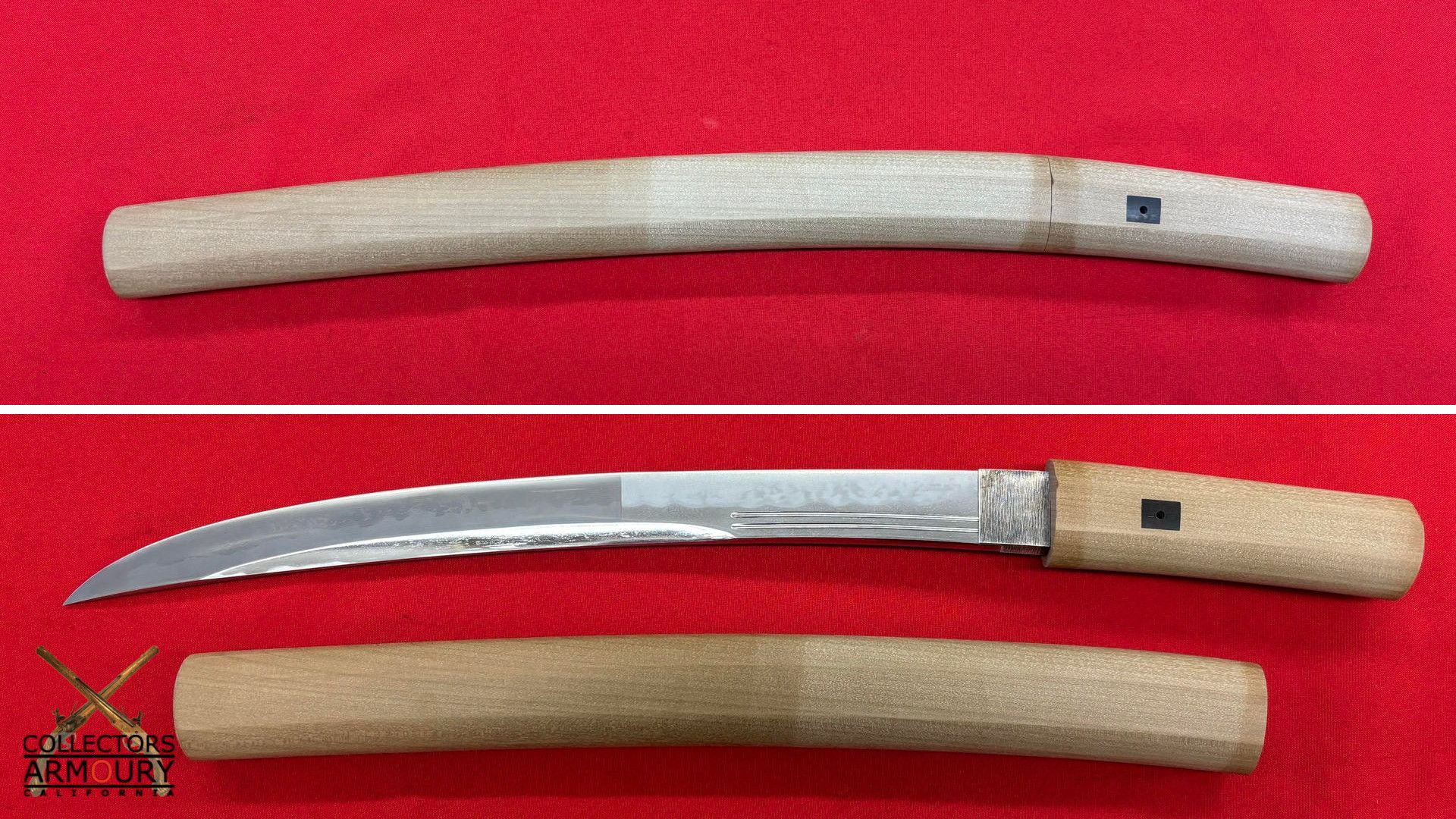 Deeply curved 14 and 1/4 inch blade without ypkote line with superbly carved horimono of a flowering prunus blossom on omote and double bo hi on era. Exuberant and incredibly beautifully rendered choji midare hamon with areas of ashi floating down towards the ha. The hada of extremely fine itame. Solid silver habaki. The nakago is ubu with one mekugi-ana, signed and dated with yoko usuri in mint condition throughout.