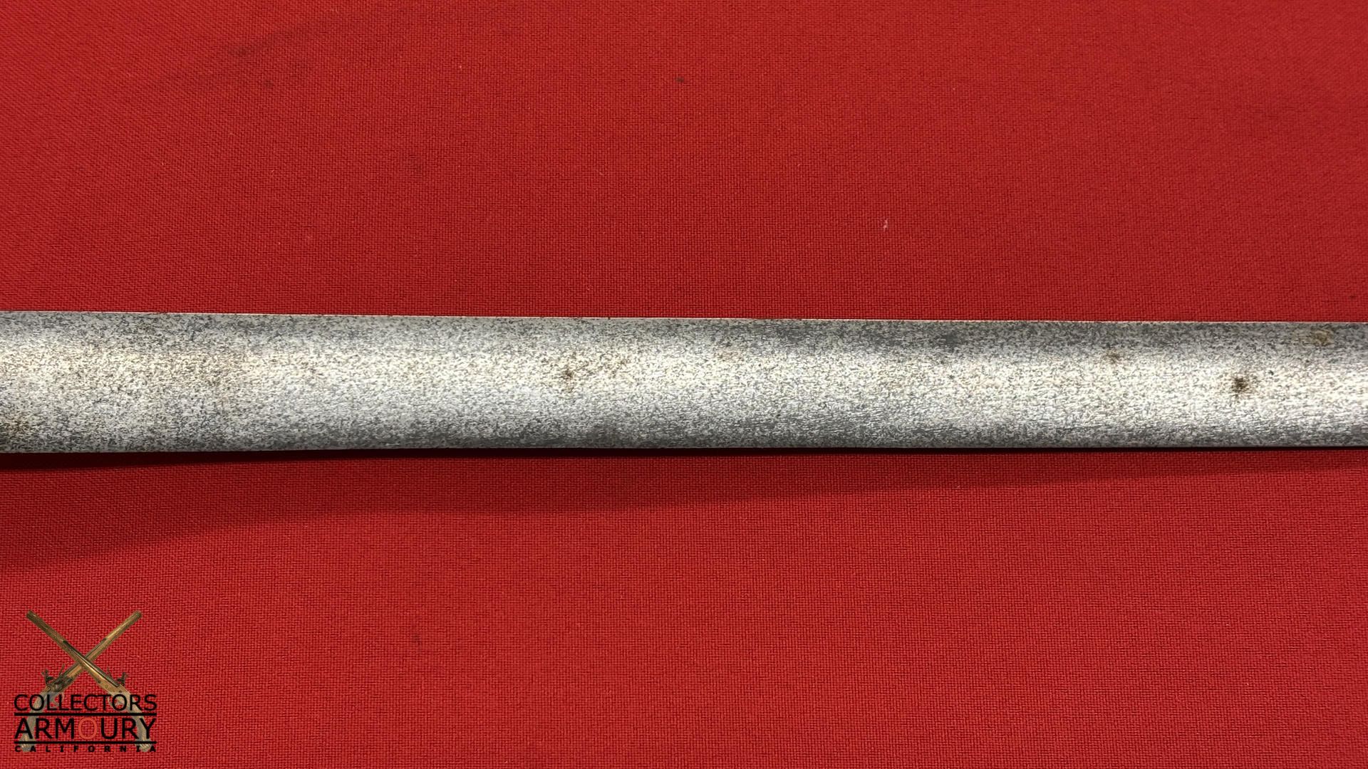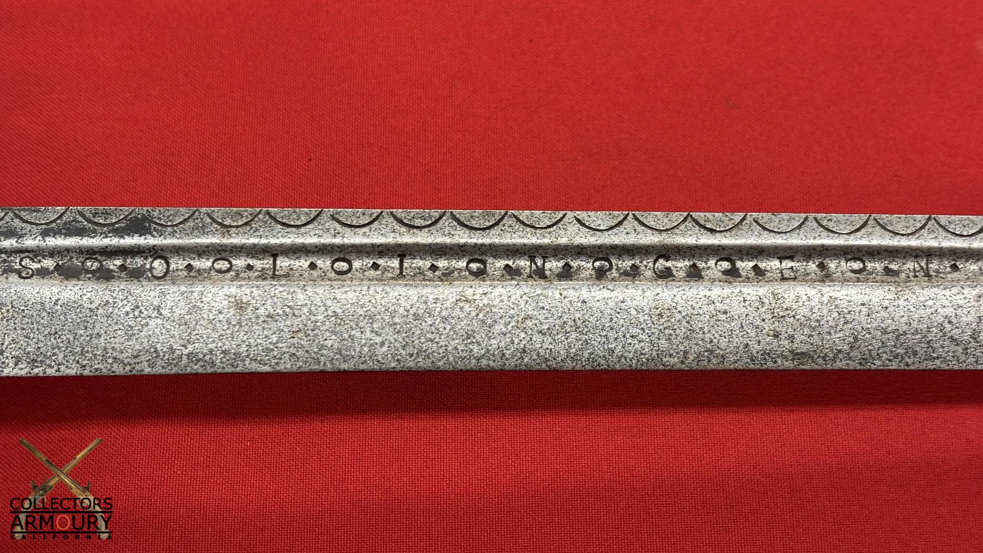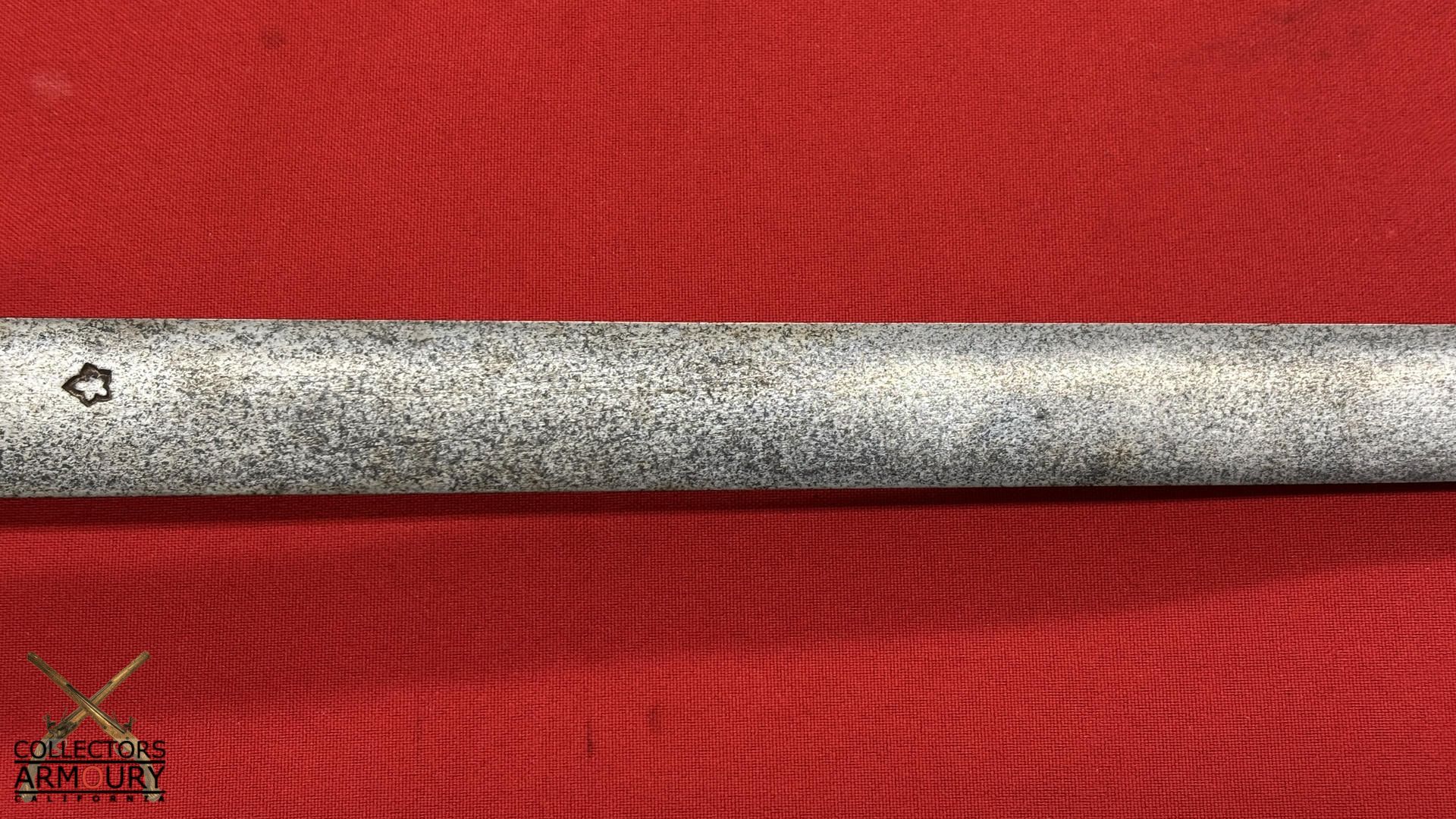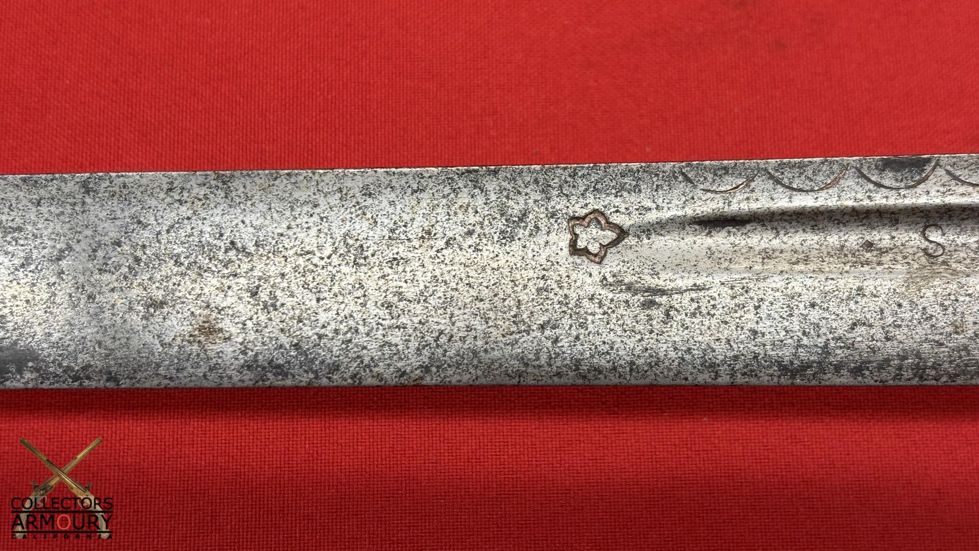 The backsword blade 34 inches in length and 1 and 3/8th inches wide at forte, of exemplary quality and in excellent condition for a mid-17th century Scottish blade. An 8 inch fuller is engraved within “SOOOLOIONOGOEON” sic. Solingen. The hammerman’s stamp of a five pointed star is stamped above the fuller on both sides, A scalloped design enhances the appearance of this extremely rare Scottish survival.