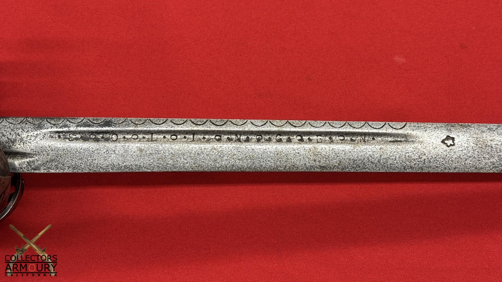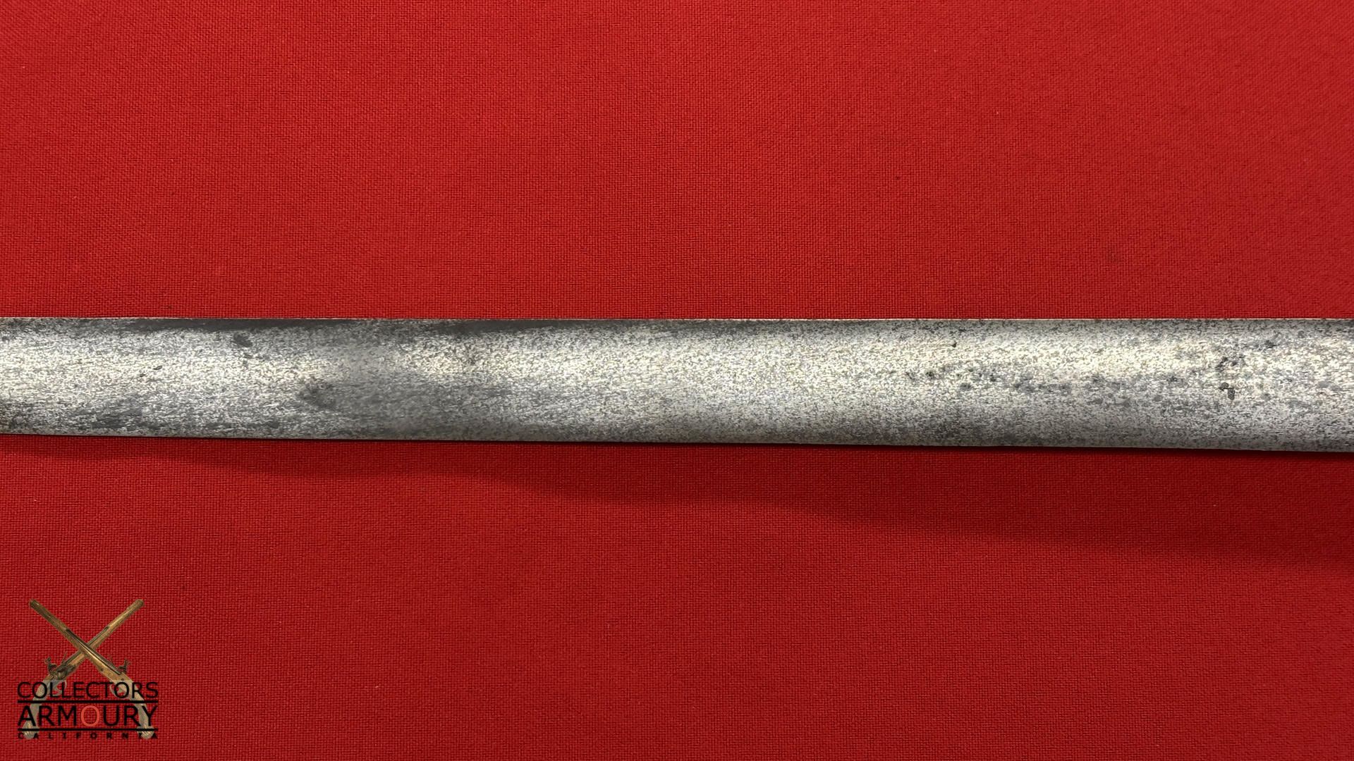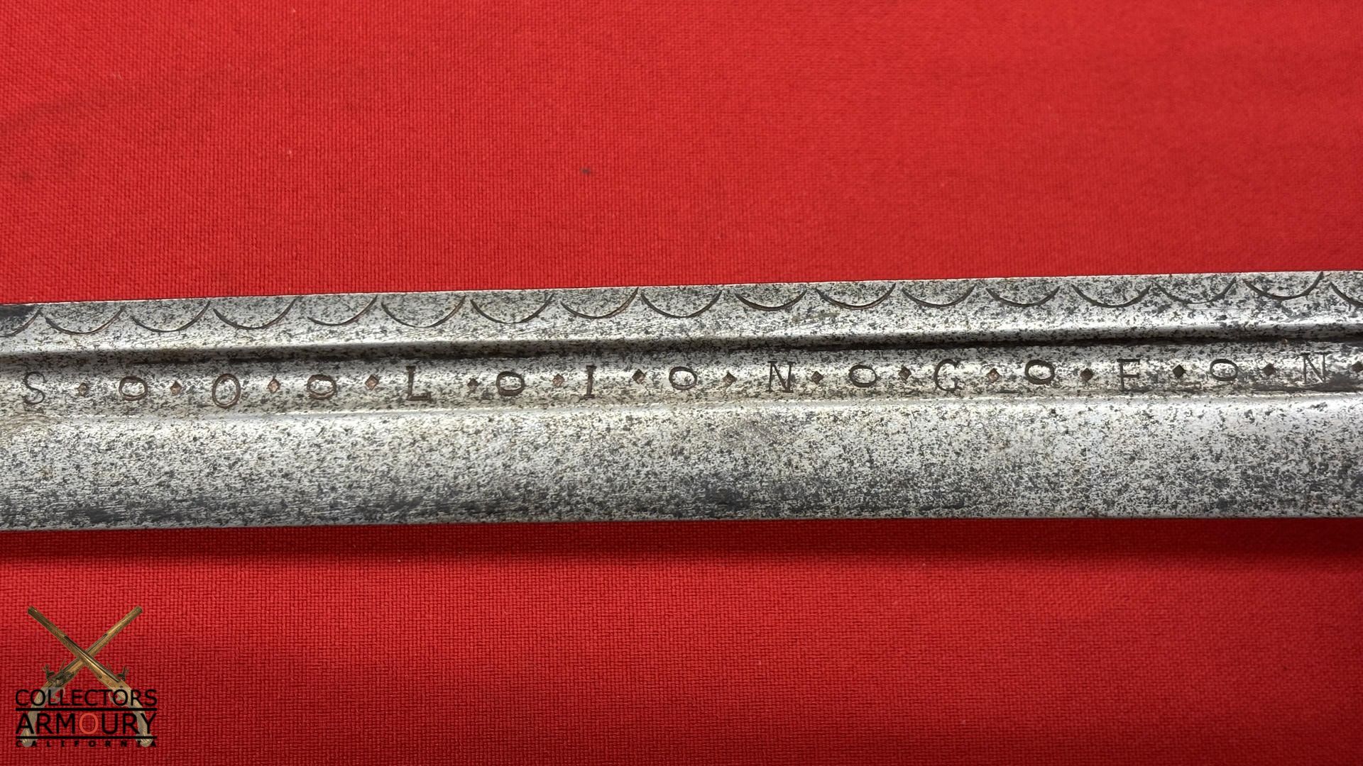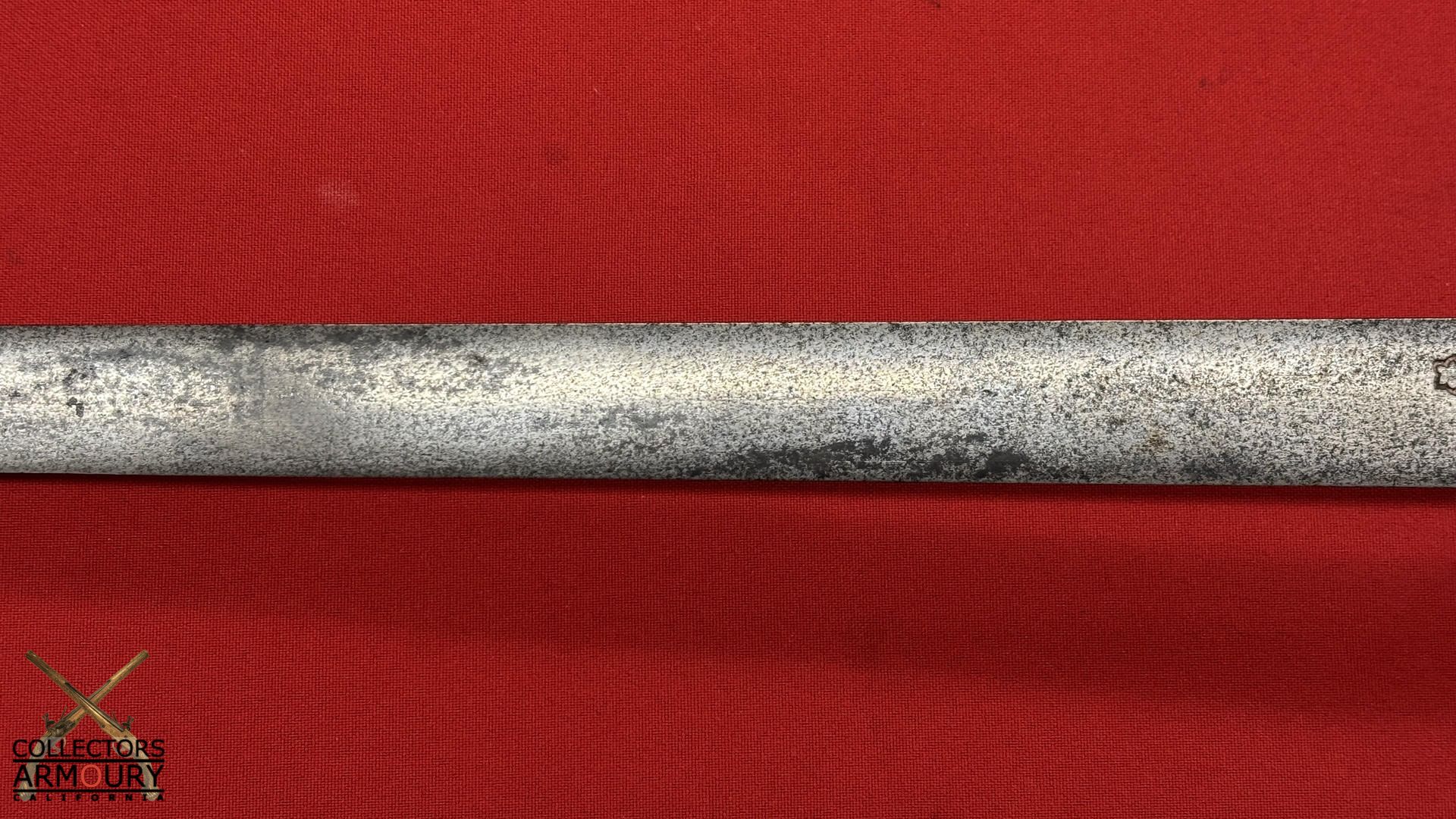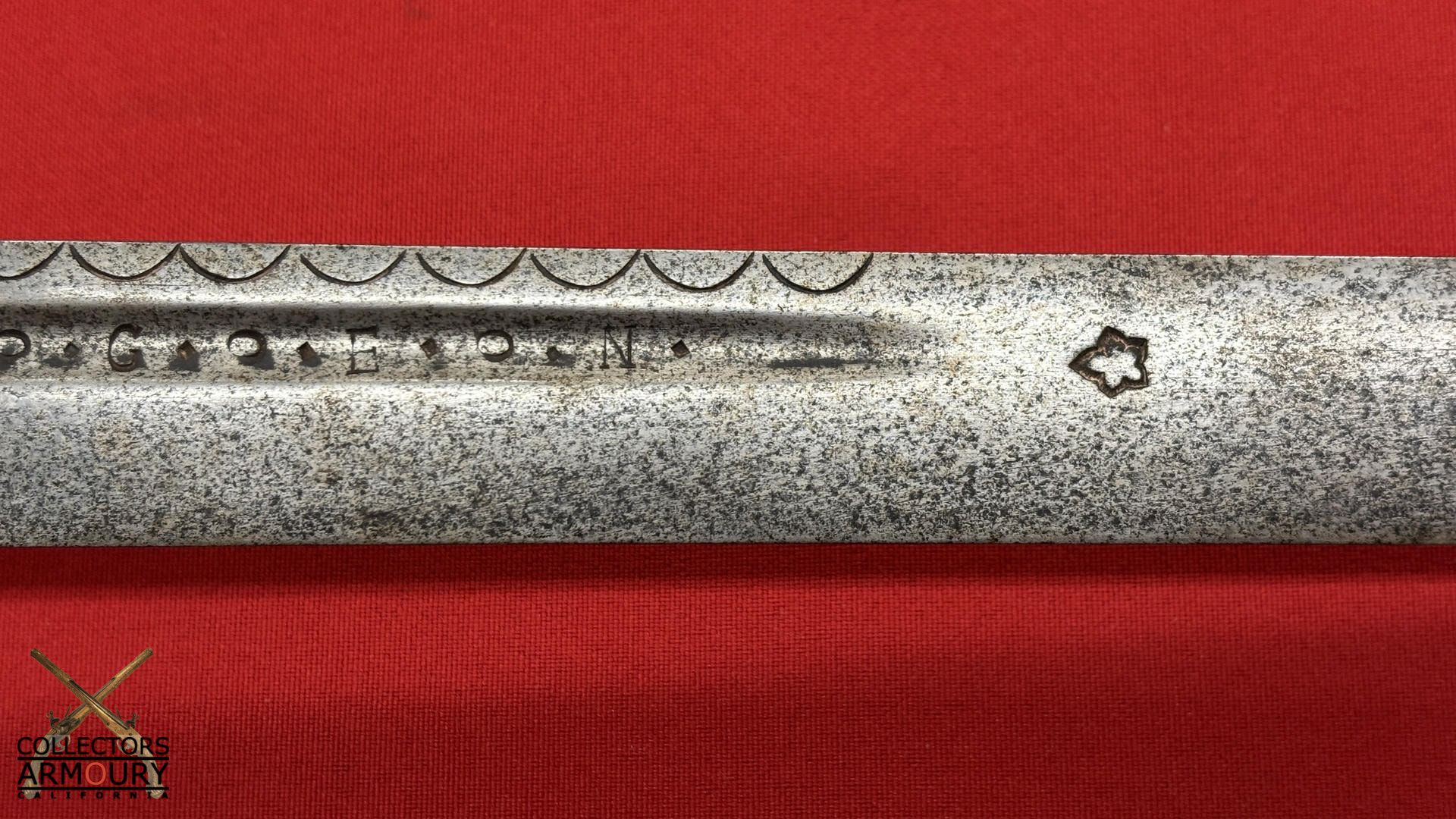 The backsword blade 34 inches in length and 1 and 3/8th inches wide at forte, of exemplary quality and in excellent condition for a mid-17th century Scottish blade. An 8 inch fuller is engraved within “SOOOLOIONOGOEON” sic. Solingen. The hammerman’s stamp of a five pointed star is stamped above the fuller on both sides, A scalloped design enhances the appearance of this extremely rare Scottish survival.