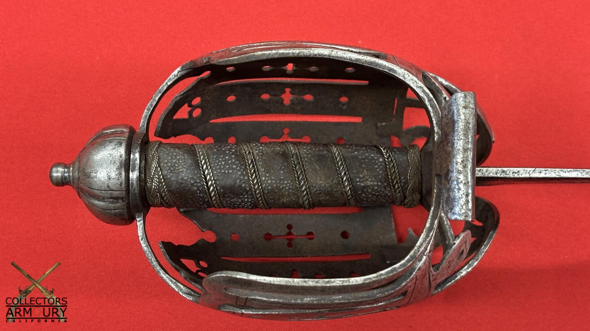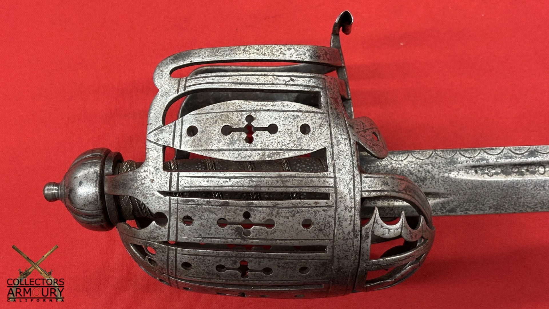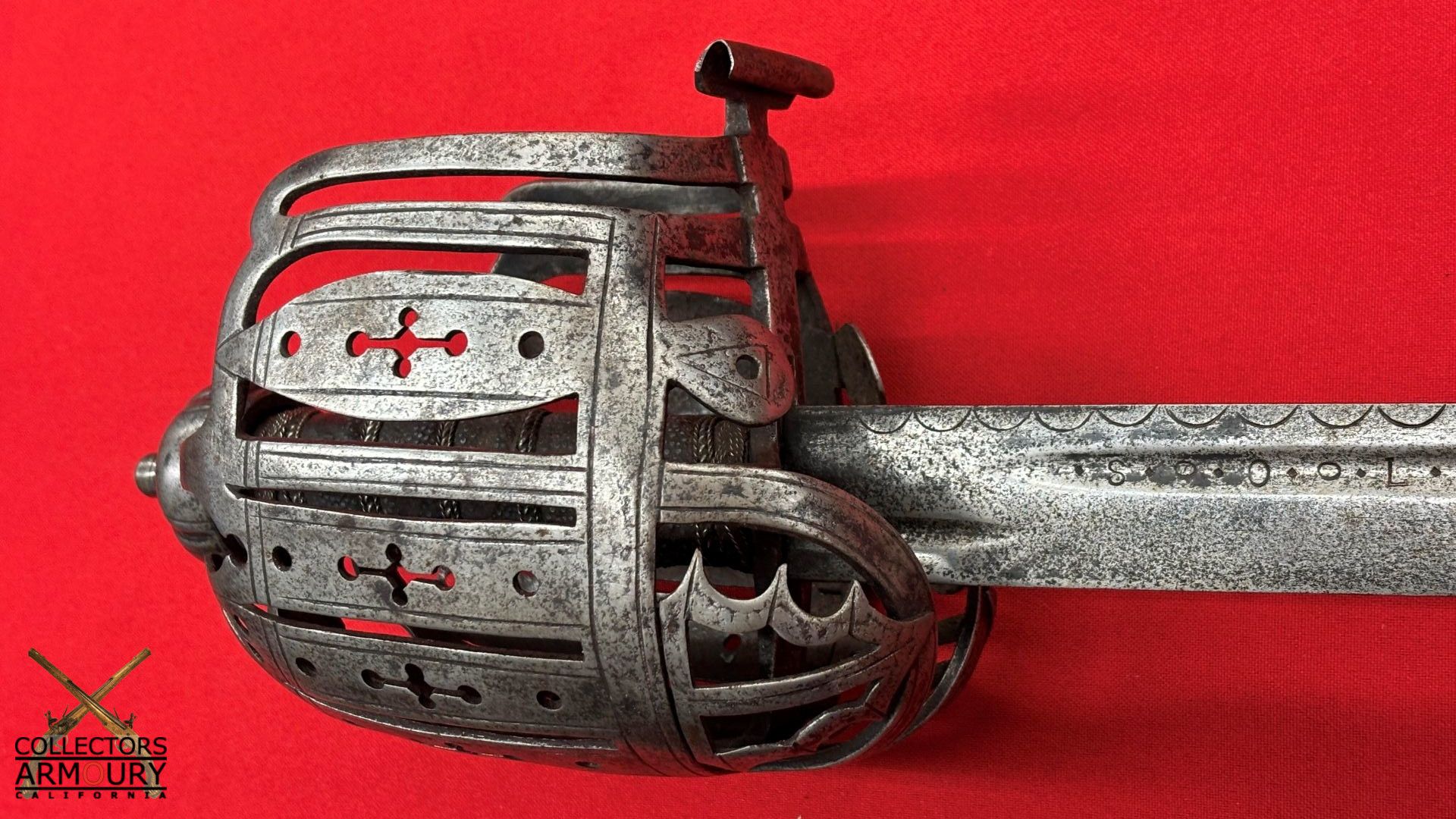 A similar slightly later version of the hilt possibly by S. Harvey appears in Southwick figure 398. Condition overall is fine to excellent. A beautiful Scottish basket hilt backsword with an important 17th century blade.