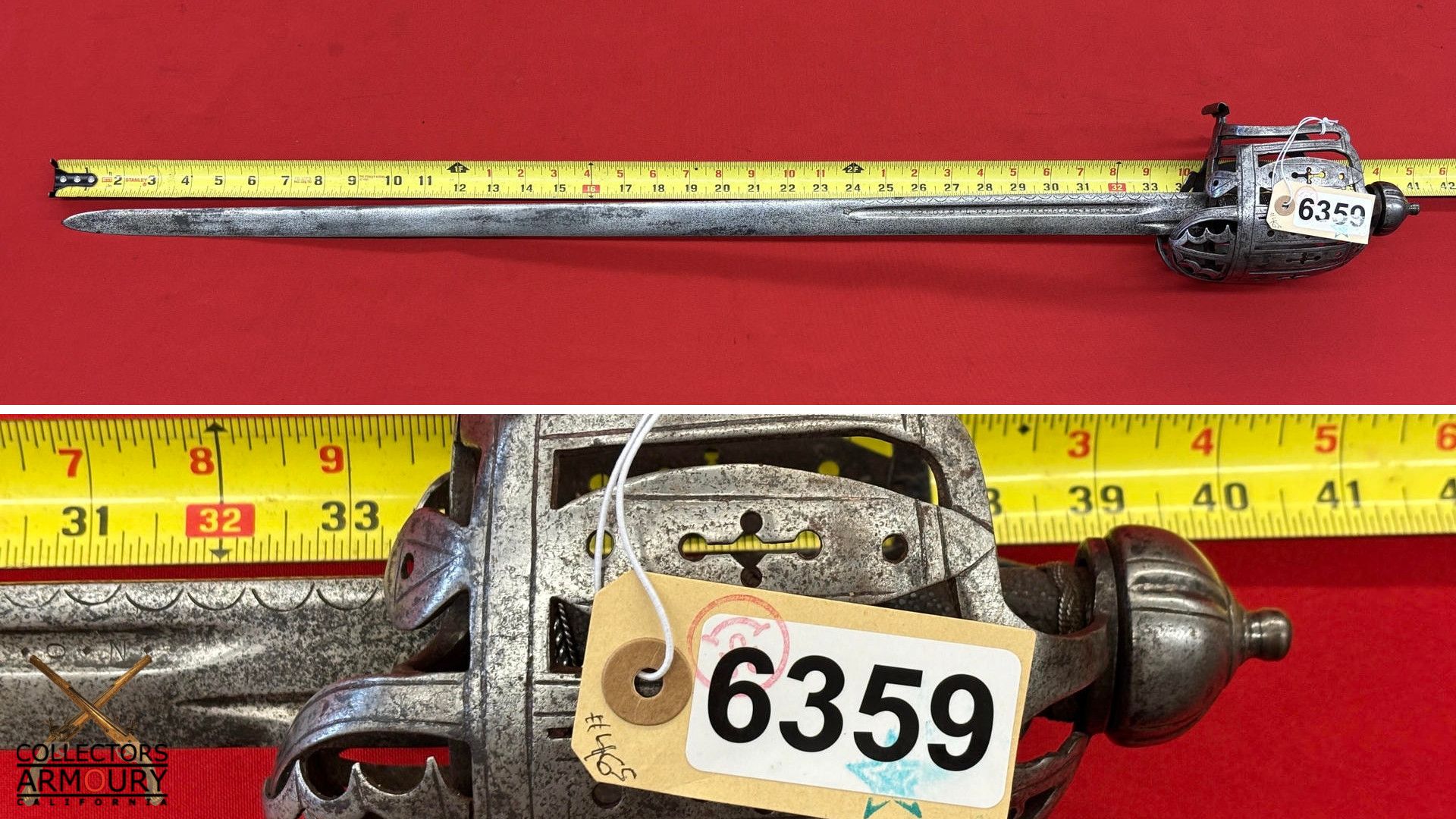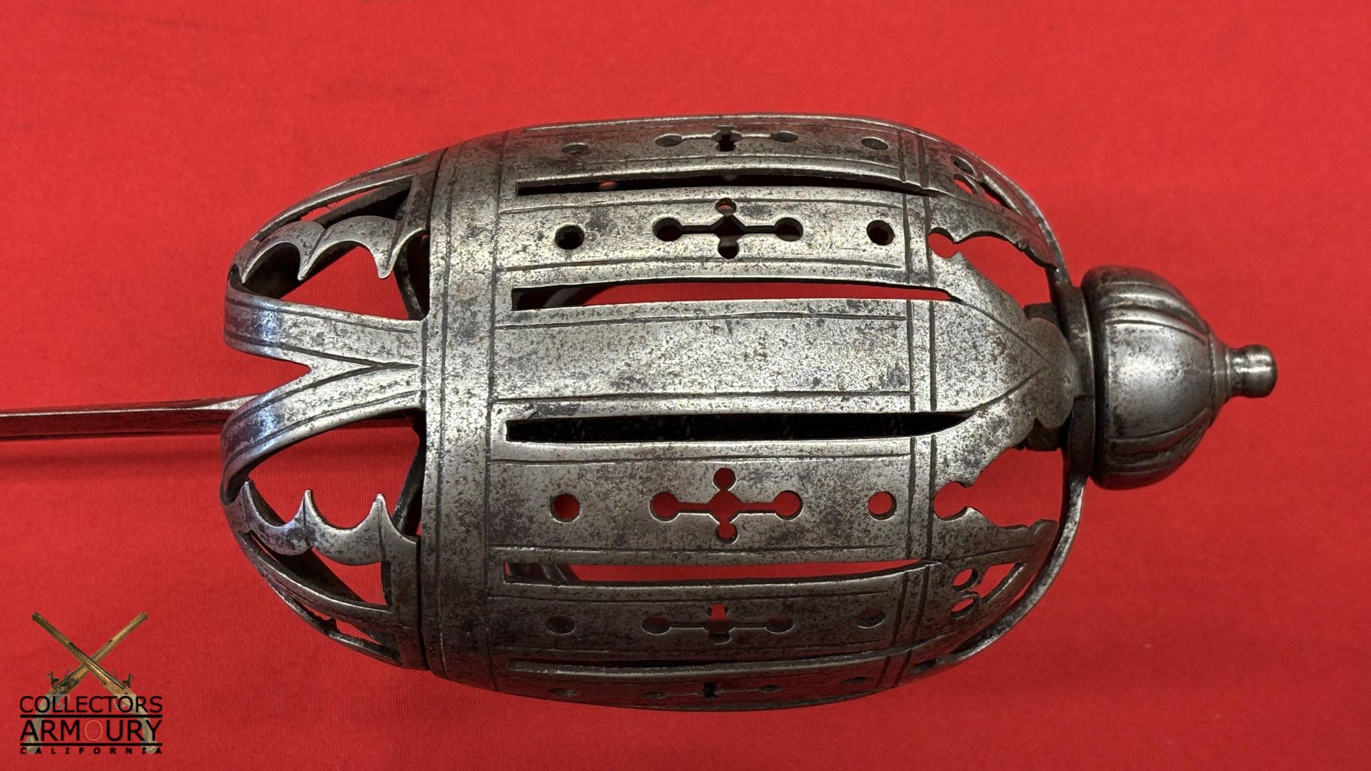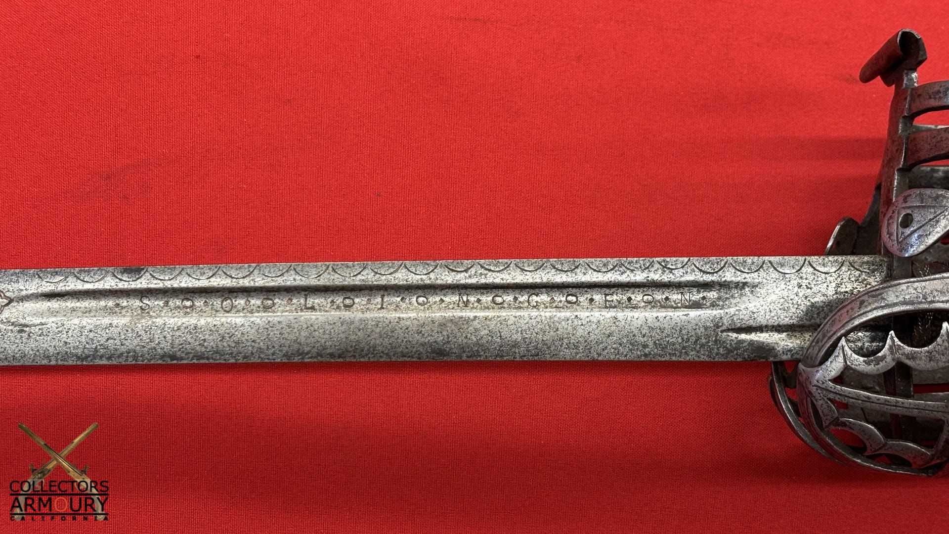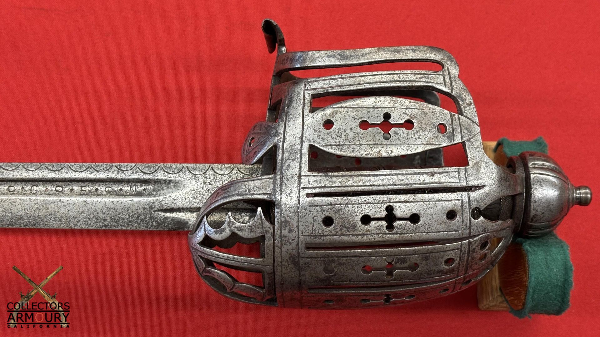 A similar slightly later version of the hilt possibly by S. Harvey appears in Southwick figure 398. Condition overall is fine to excellent. A beautiful Scottish basket hilt backsword with an important 17th century blade.