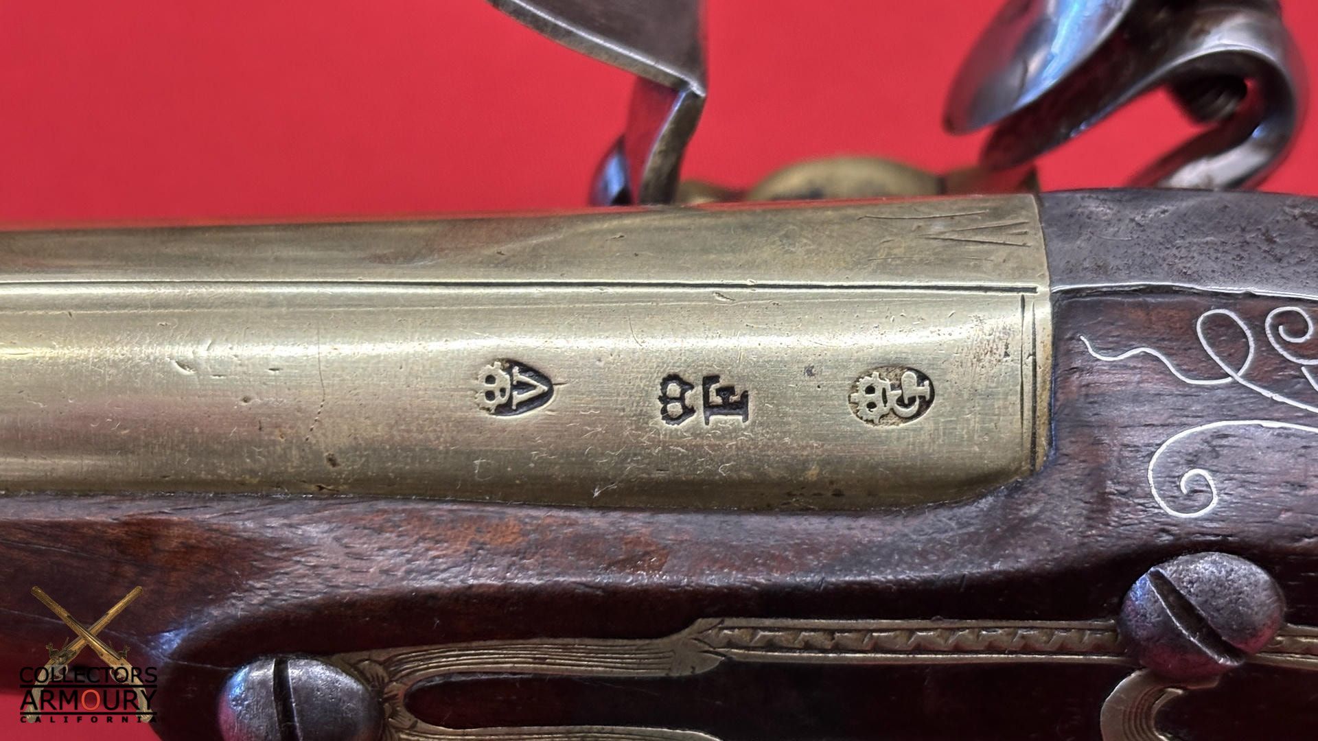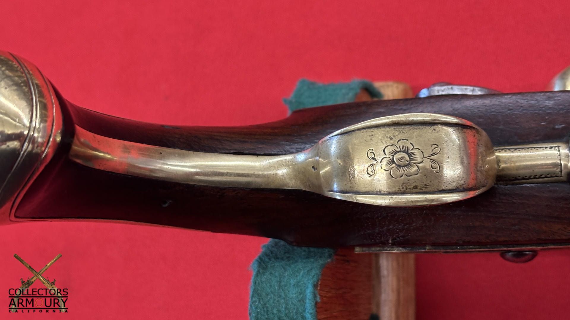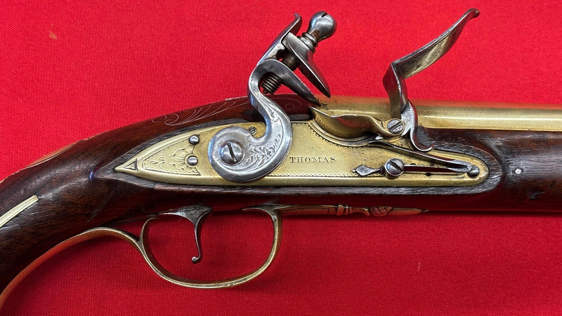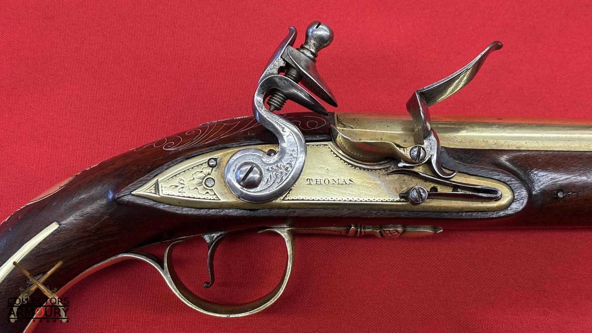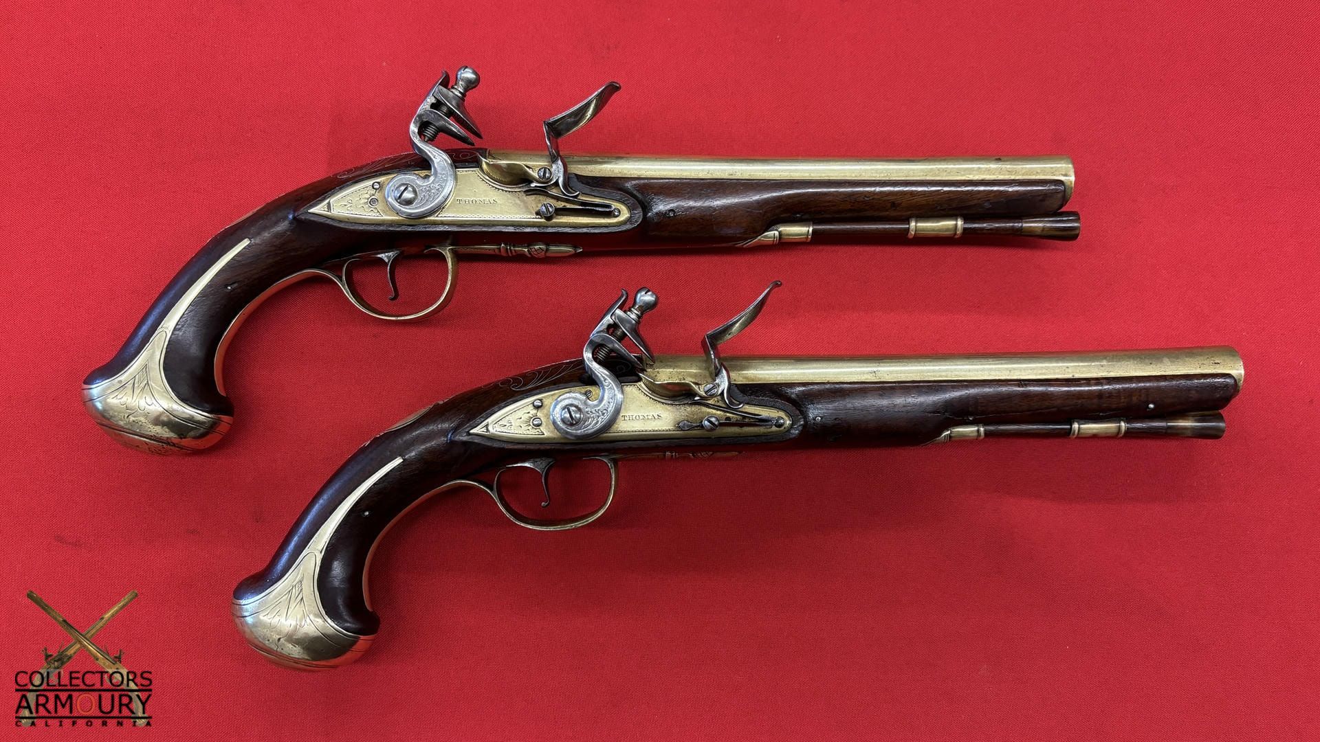 8 and 3/4 inch round. smoothbore, barrels with short top flat, Birmingham gunmaker’s proofs. .65 caliber. Stepped, double bolted locks, lightly engraved at tail, signed “THOMAS”. Bridles frizzens, engraved gooseneck cocks, all brass furniture comprising elegant, engraved skeletonized sideplate, acorn finial triggerguard, engraved spurred buttcaps, brass ramrod pipes, horn tipped ramrods.