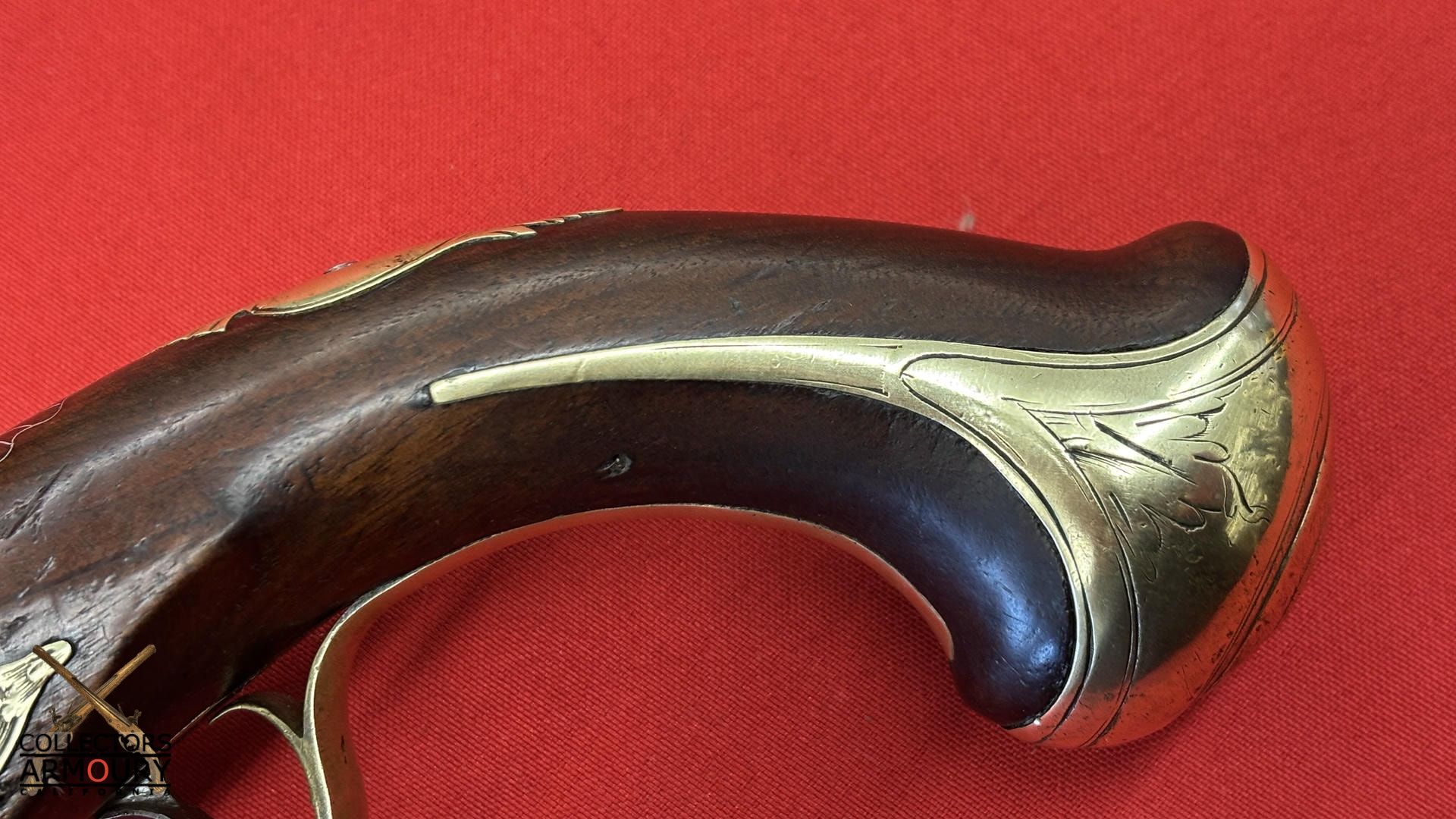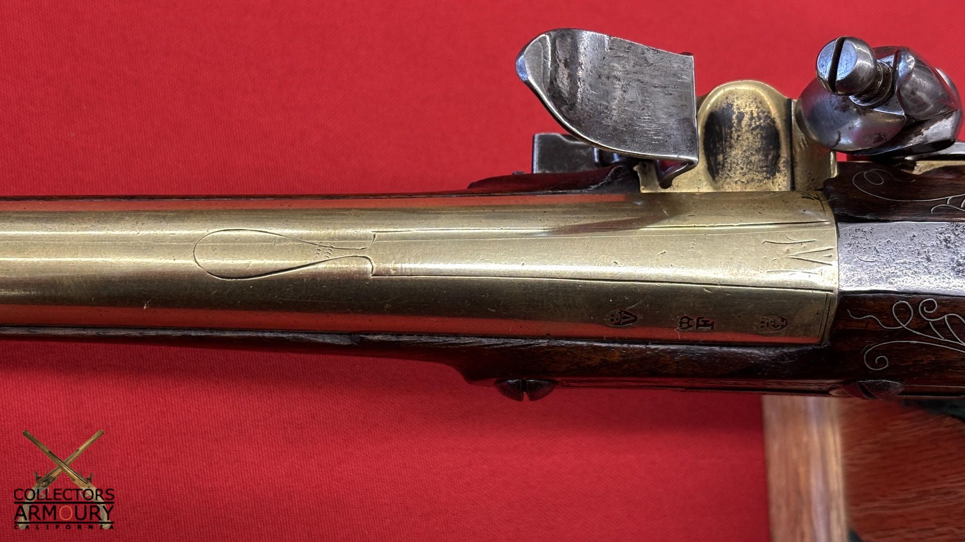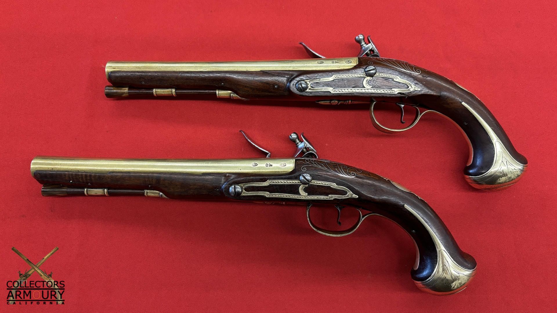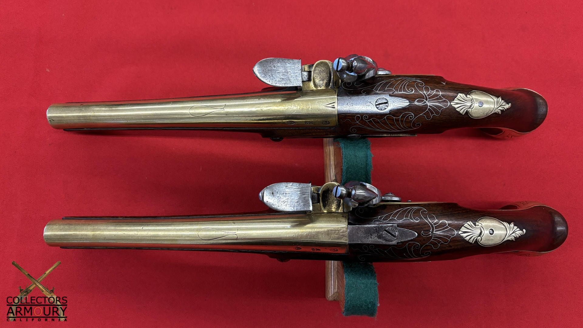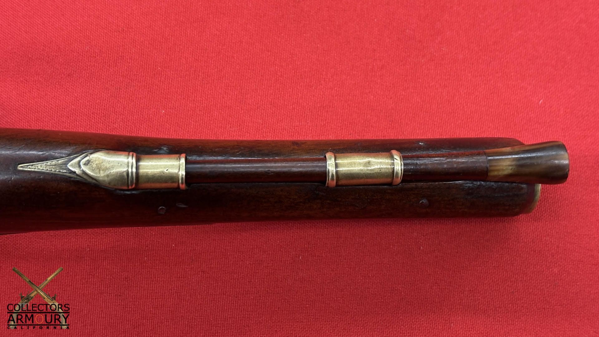 8 and 3/4 inch round. smoothbore, barrels with short top flat, Birmingham gunmaker’s proofs. .65 caliber. Stepped, double bolted locks, lightly engraved at tail, signed “THOMAS”. Bridles frizzens, engraved gooseneck cocks, all brass furniture comprising elegant, engraved skeletonized sideplate, acorn finial triggerguard, engraved spurred buttcaps, brass ramrod pipes, horn tipped ramrods.