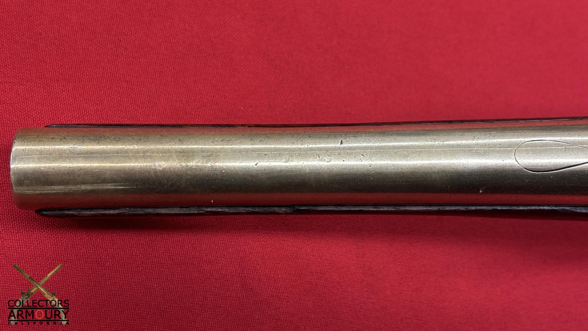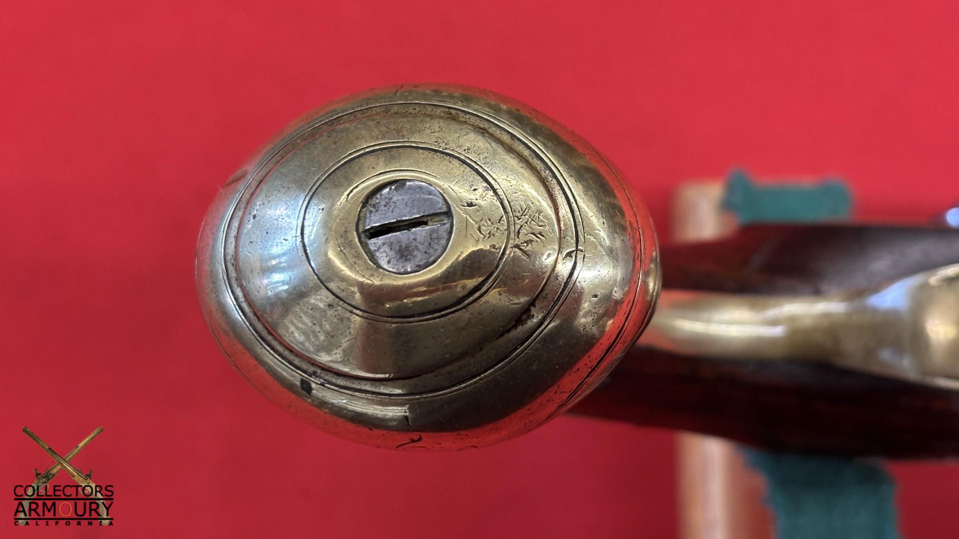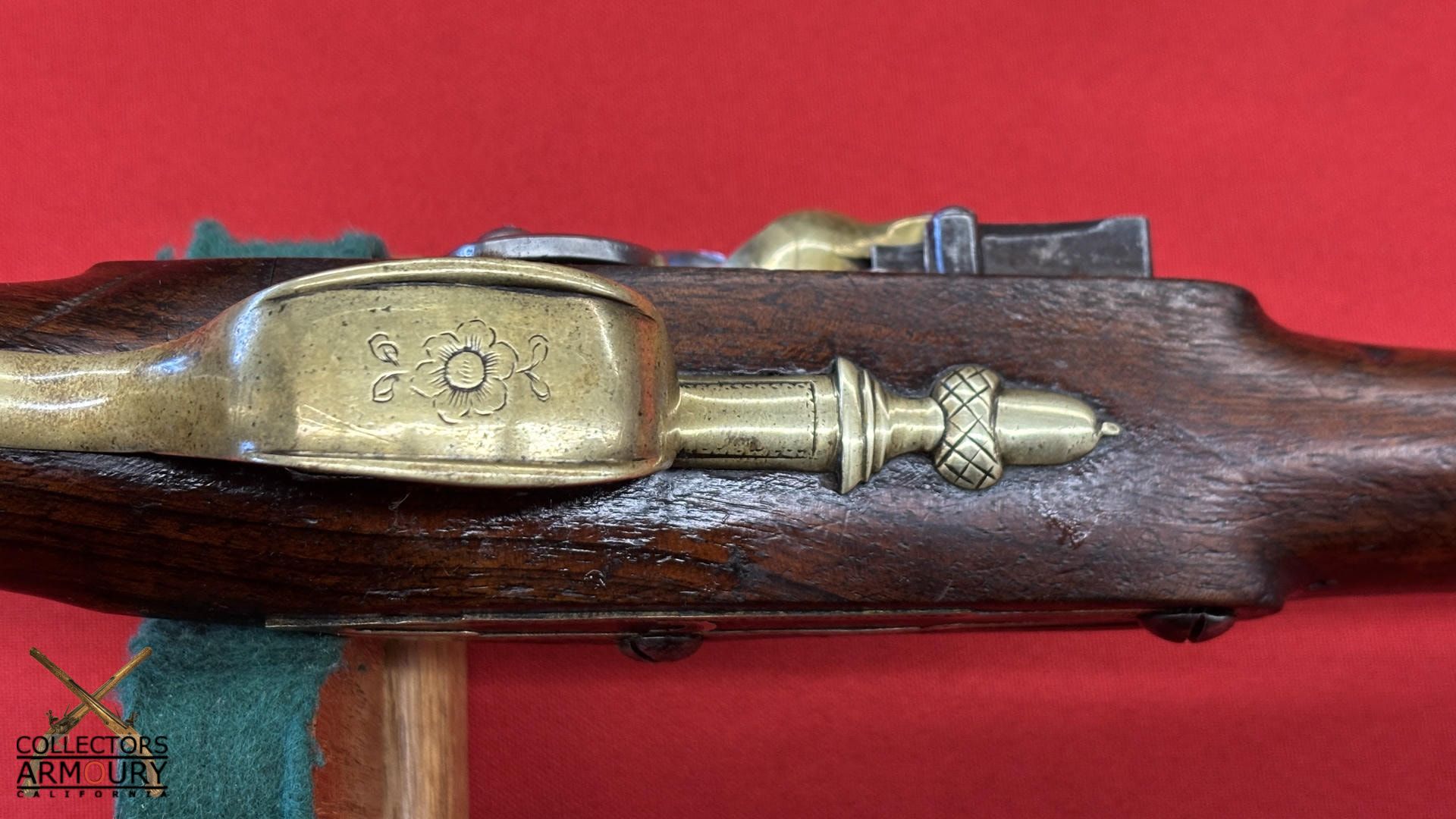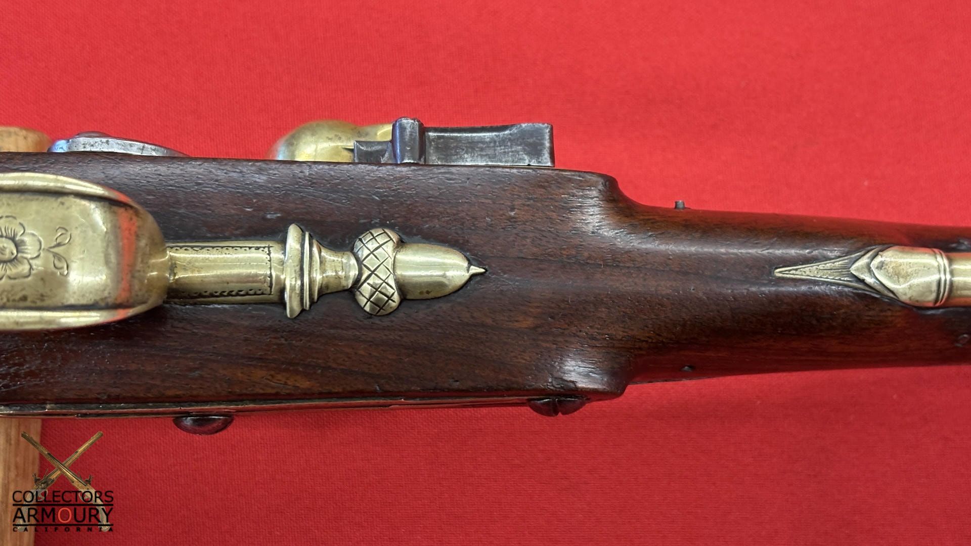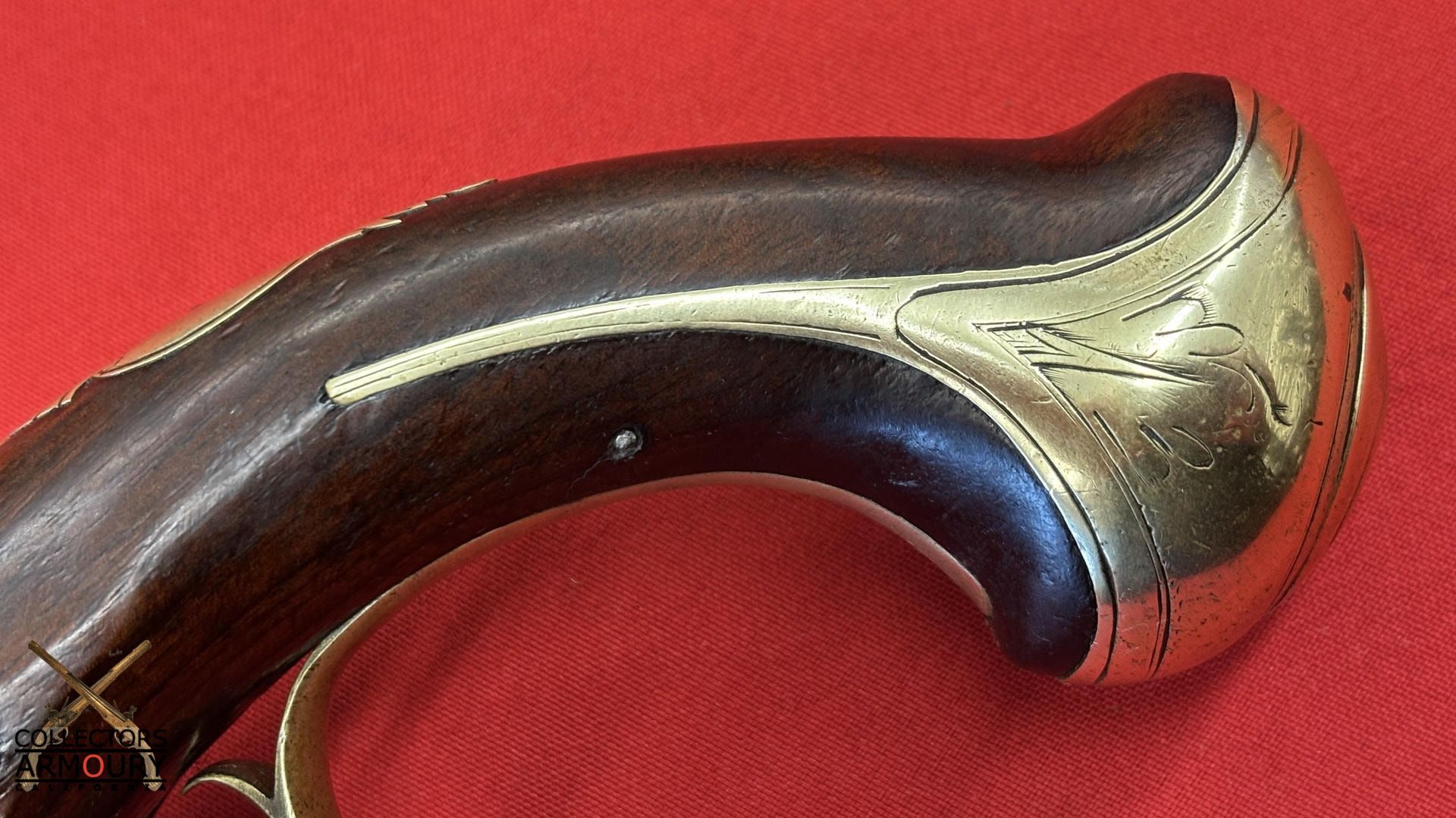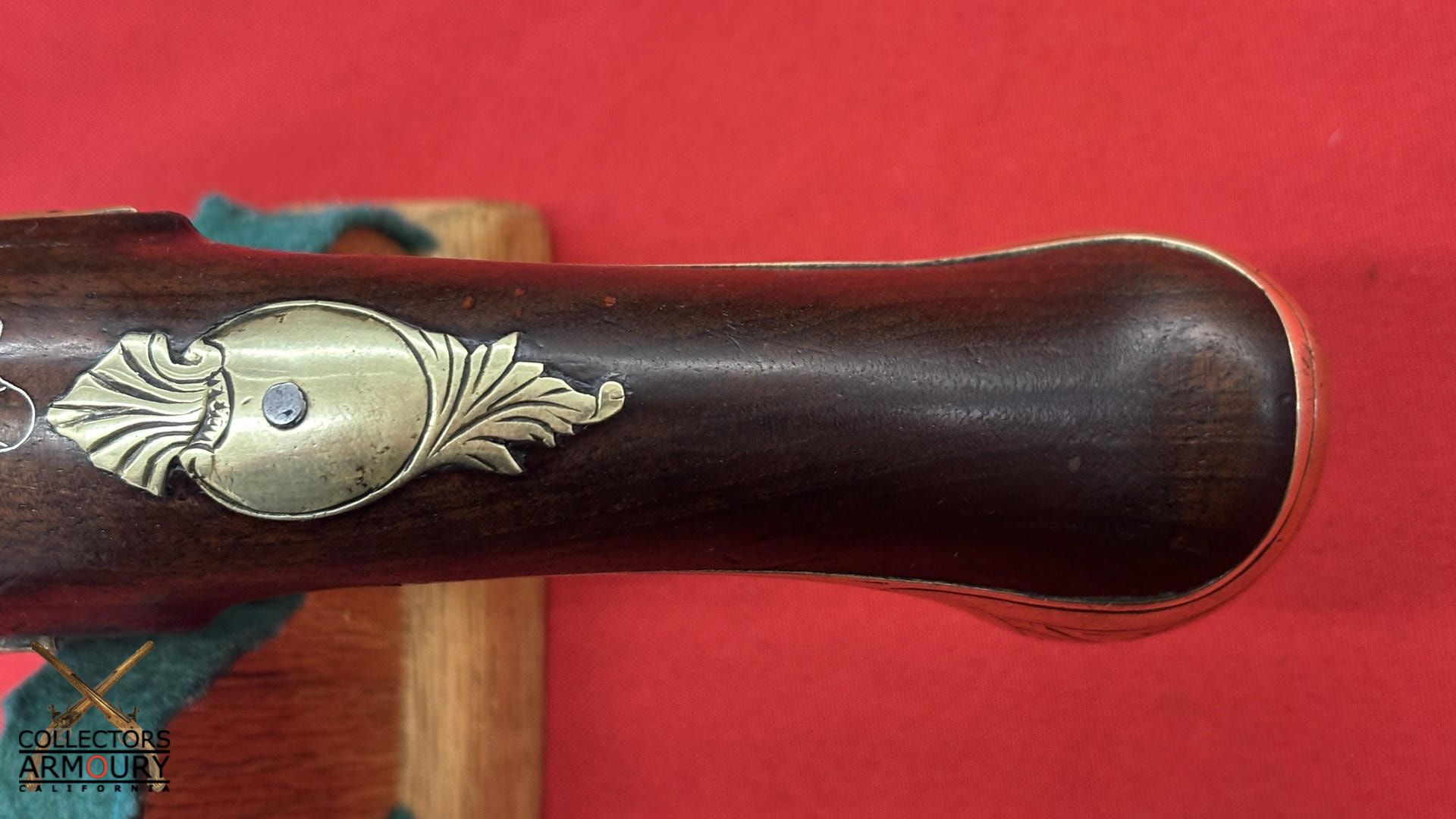 8 and 3/4 inch round. smoothbore, barrels with short top flat, Birmingham gunmaker’s proofs. .65 caliber. Stepped, double bolted locks, lightly engraved at tail, signed “THOMAS”. Bridles frizzens, engraved gooseneck cocks, all brass furniture comprising elegant, engraved skeletonized sideplate, acorn finial triggerguard, engraved spurred buttcaps, brass ramrod pipes, horn tipped ramrods.