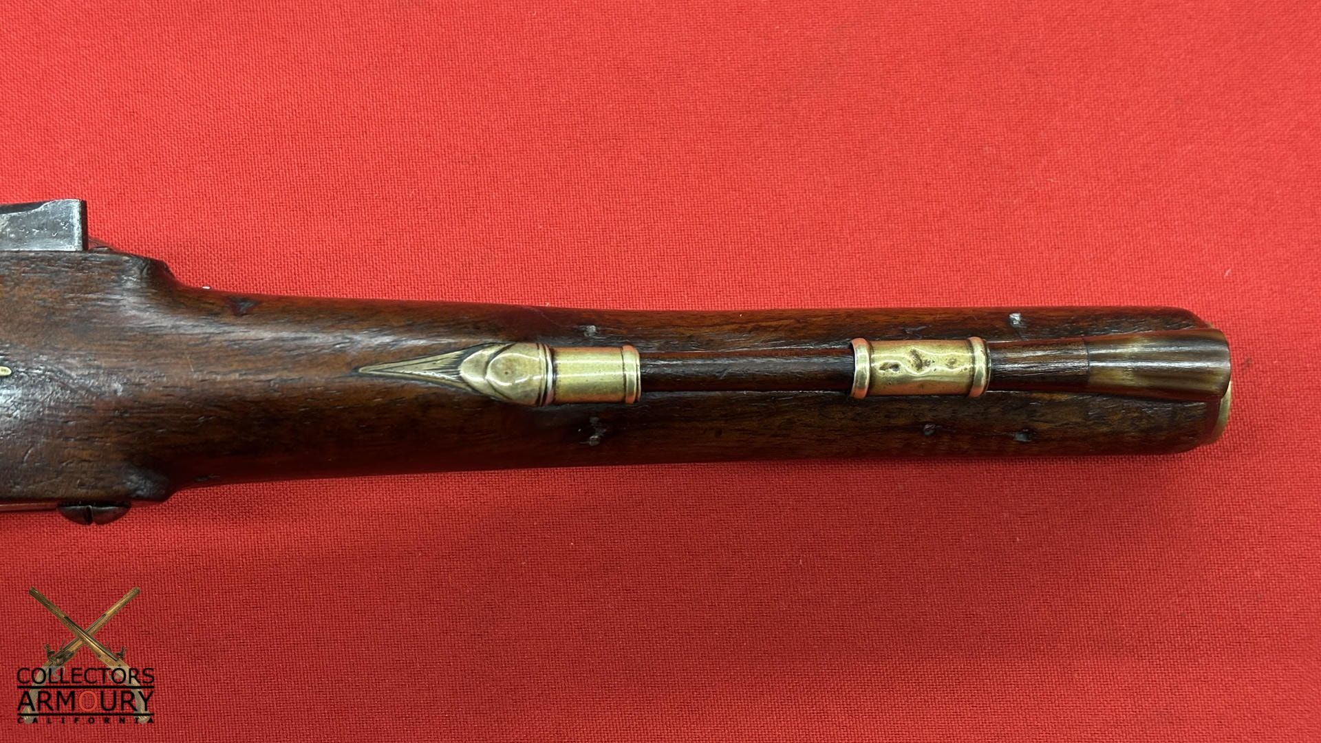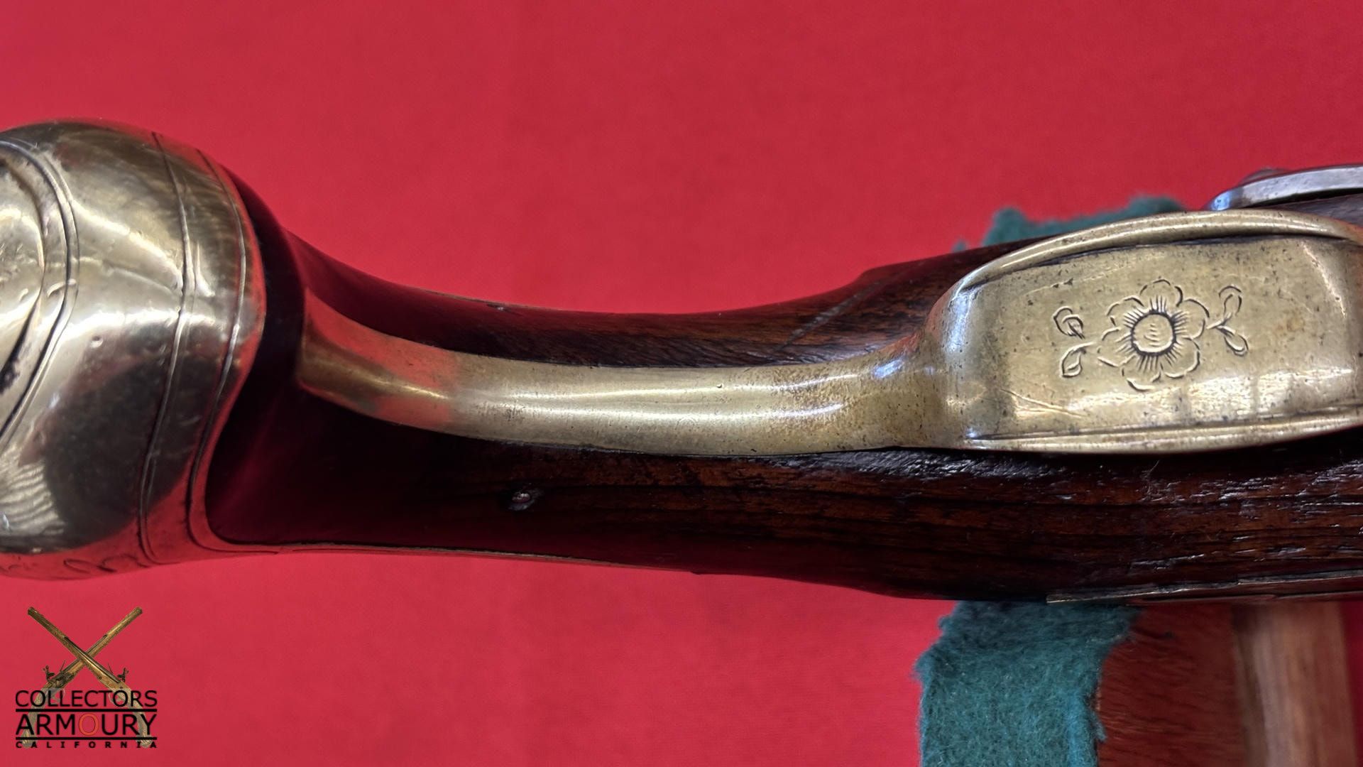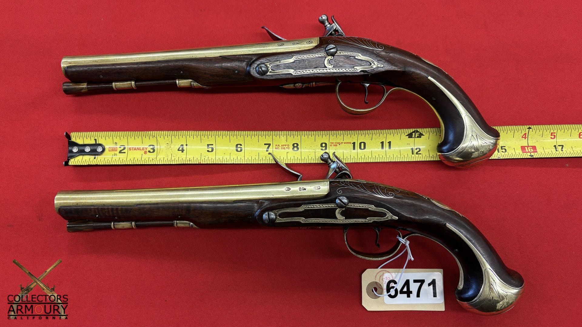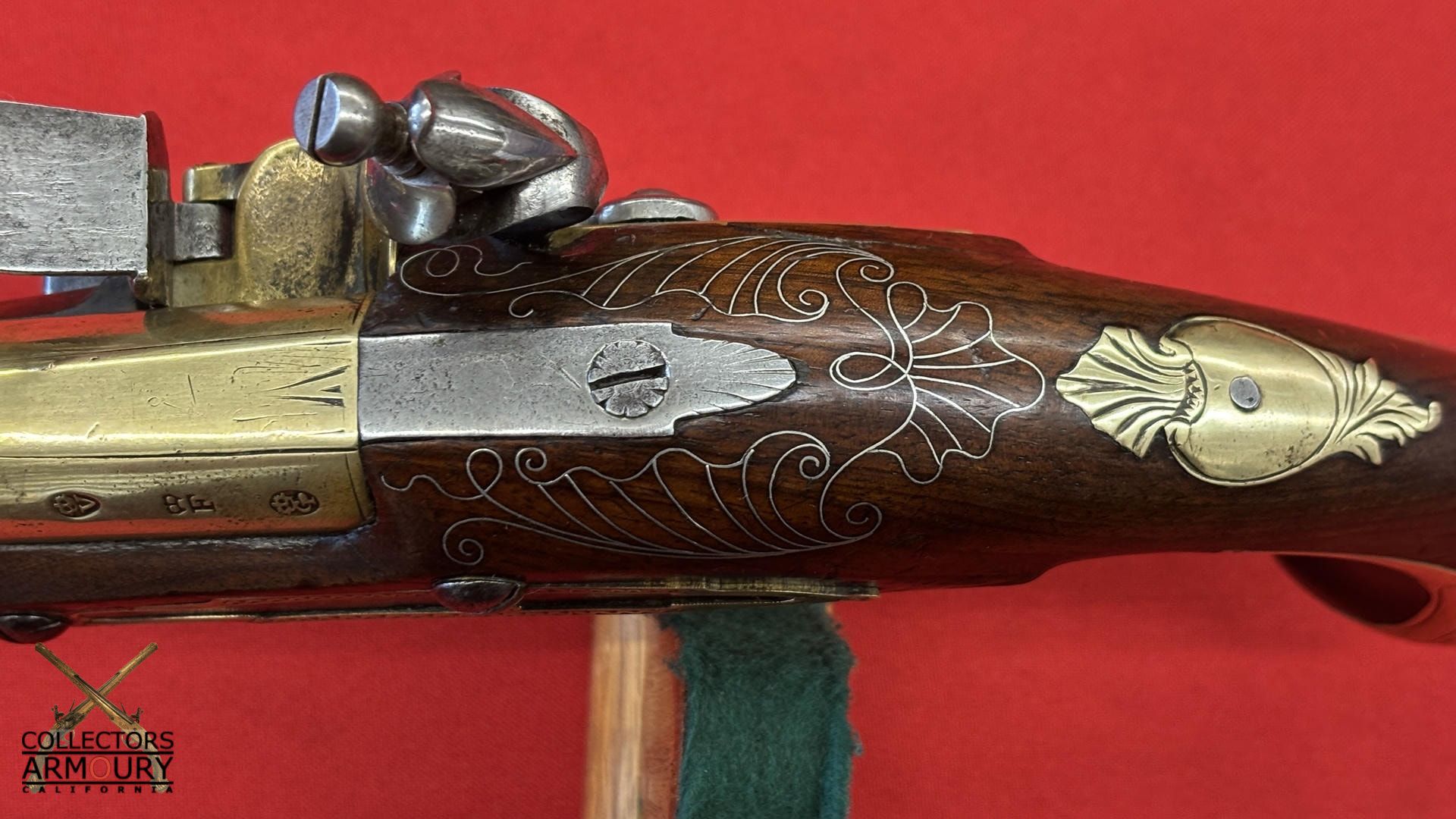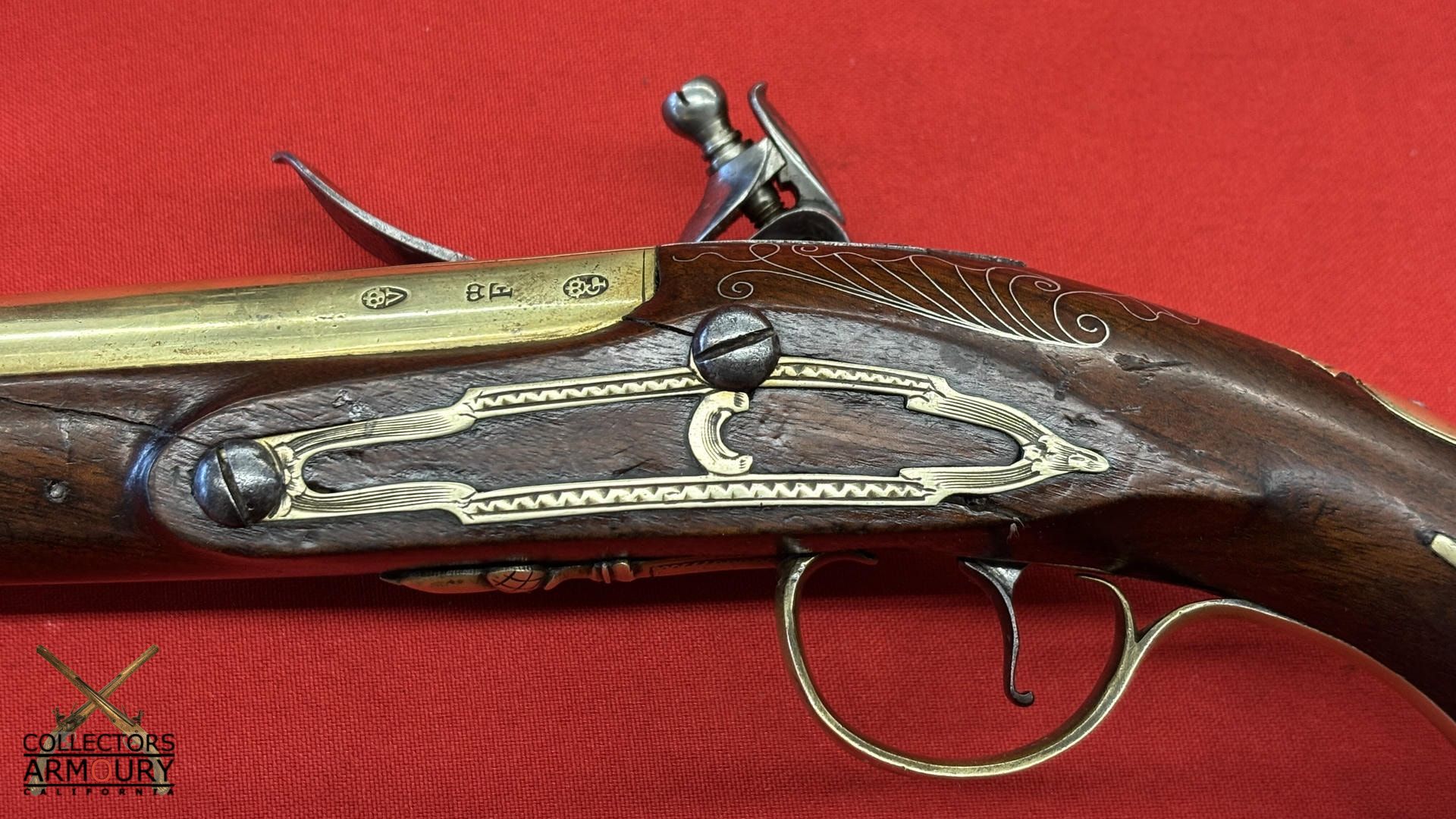 8 and 3/4 inch round. smoothbore, barrels with short top flat, Birmingham gunmaker’s proofs. .65 caliber. Stepped, double bolted locks, lightly engraved at tail, signed “THOMAS”. Bridles frizzens, engraved gooseneck cocks, all brass furniture comprising elegant, engraved skeletonized sideplate, acorn finial triggerguard, engraved spurred buttcaps, brass ramrod pipes, horn tipped ramrods.