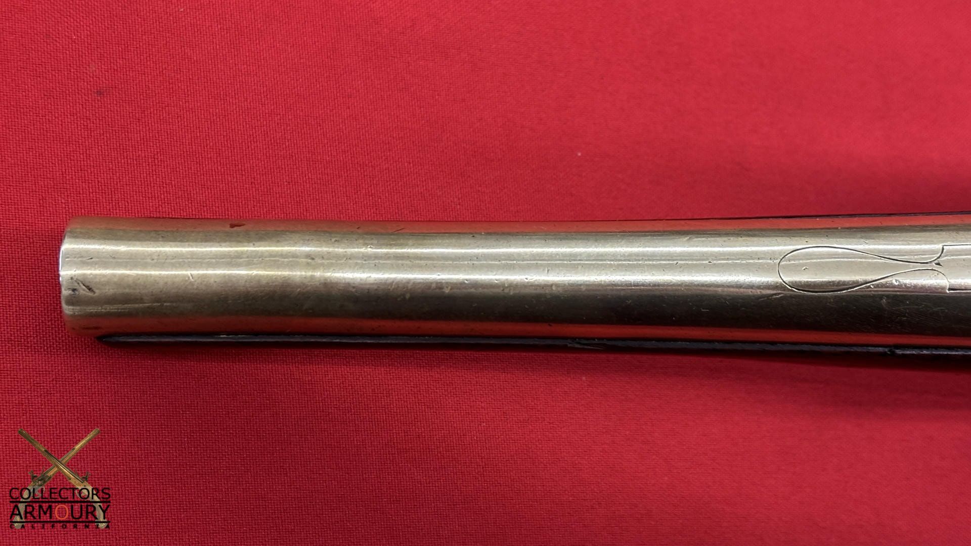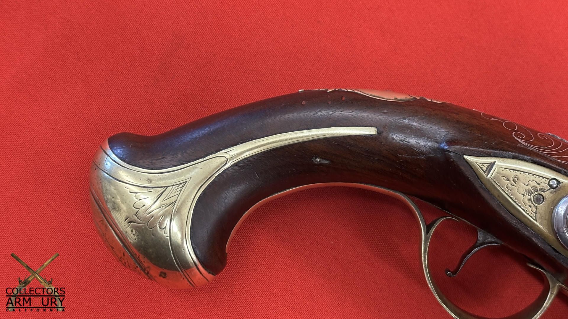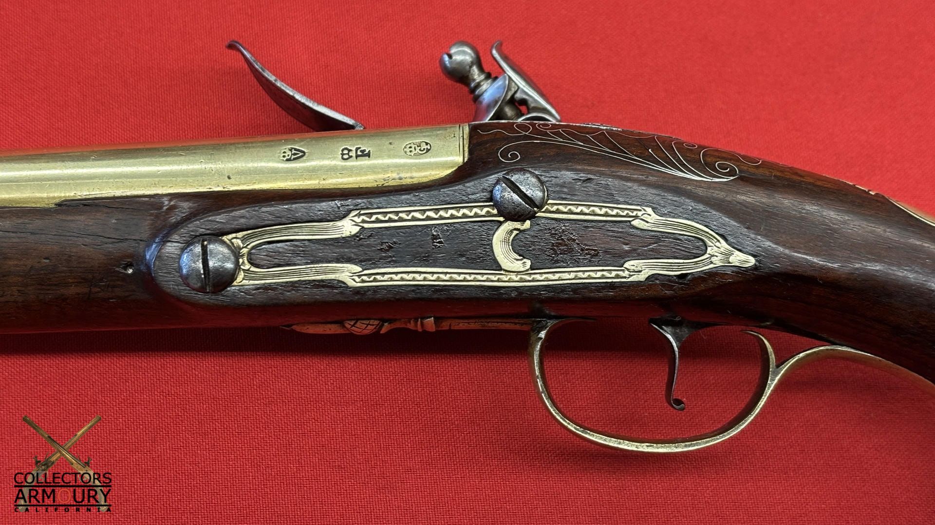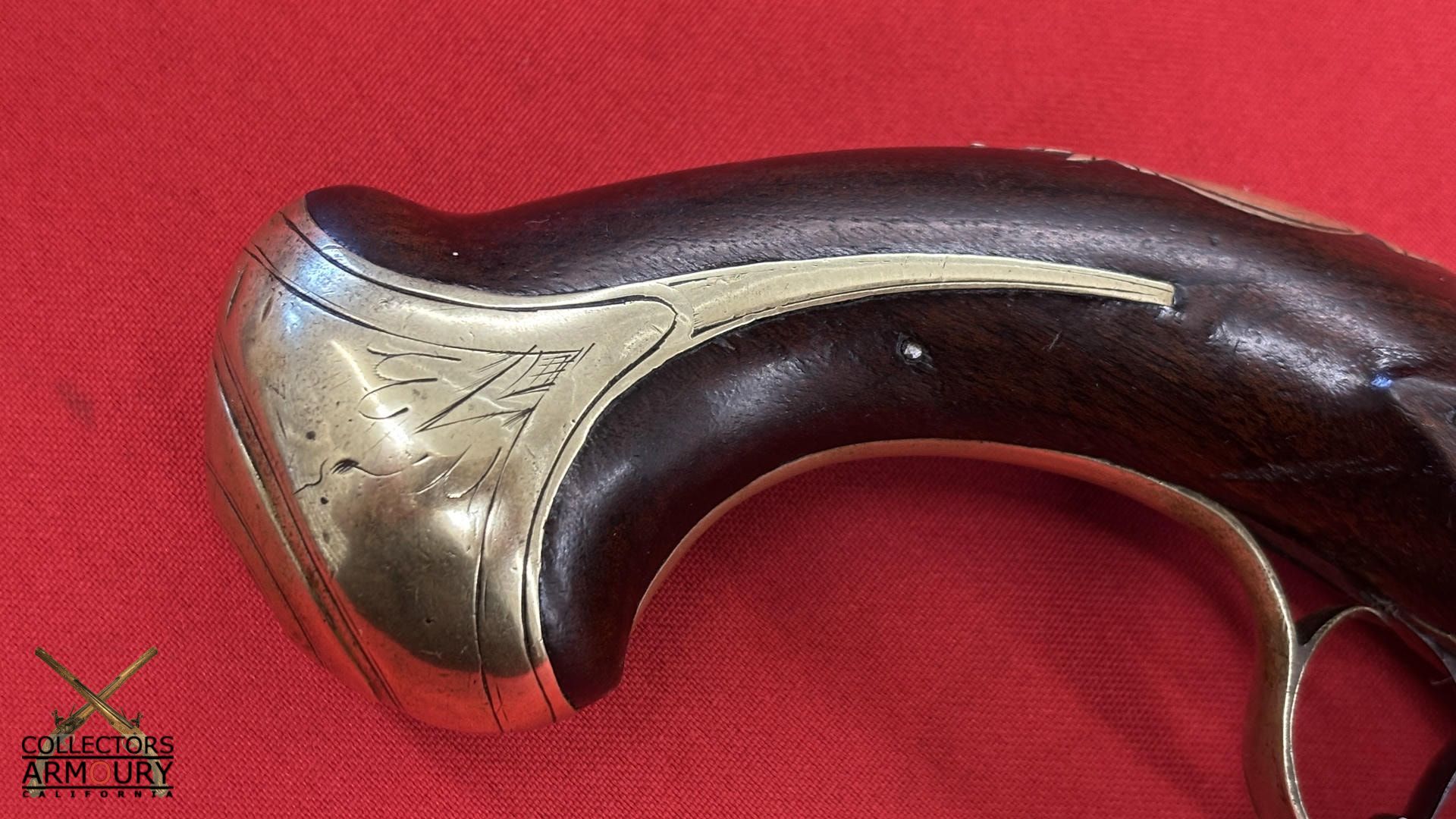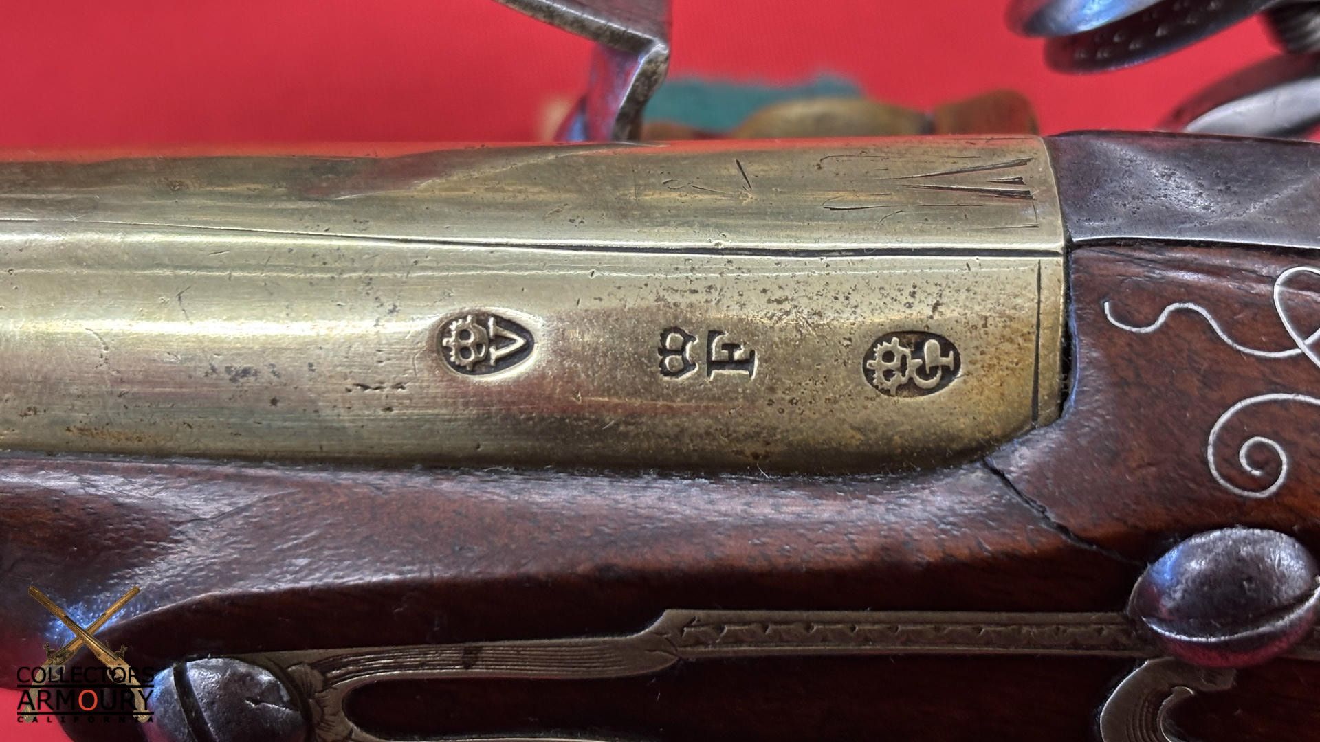 8 and 3/4 inch round. smoothbore, barrels with short top flat, Birmingham gunmaker’s proofs. .65 caliber. Stepped, double bolted locks, lightly engraved at tail, signed “THOMAS”. Bridles frizzens, engraved gooseneck cocks, all brass furniture comprising elegant, engraved skeletonized sideplate, acorn finial triggerguard, engraved spurred buttcaps, brass ramrod pipes, horn tipped ramrods.