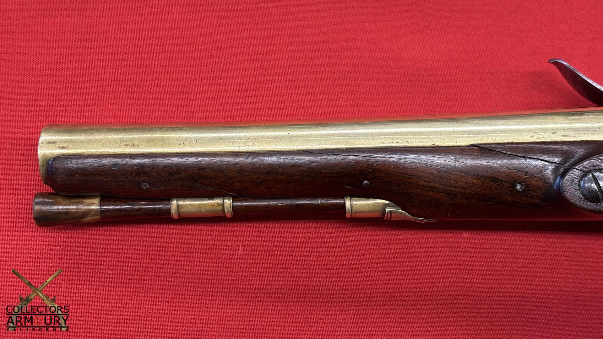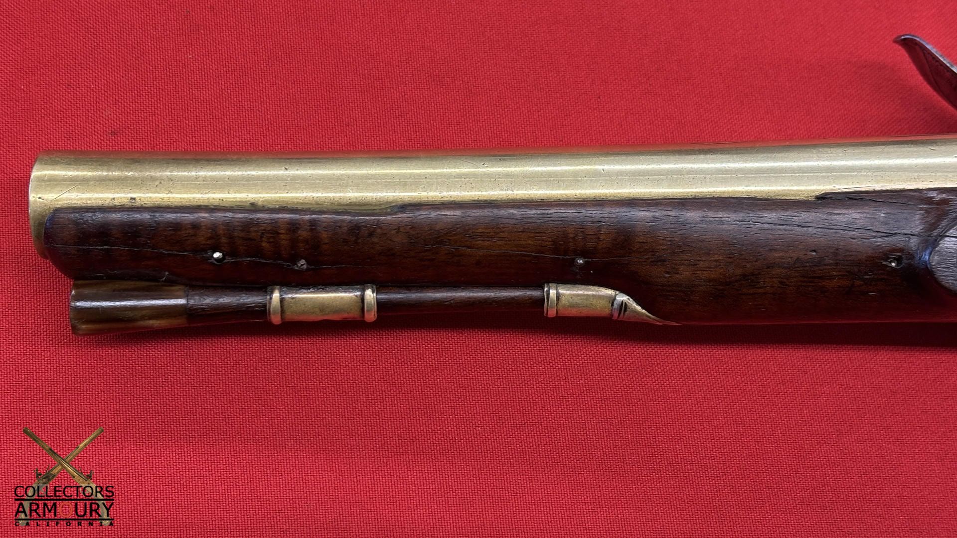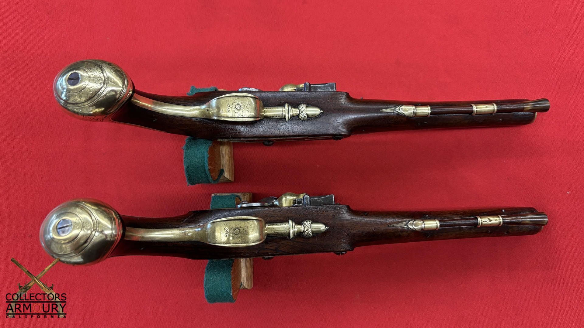 A very showy and well made pair of English flintlock brass lock and barrel pistols. 15 inches overall.