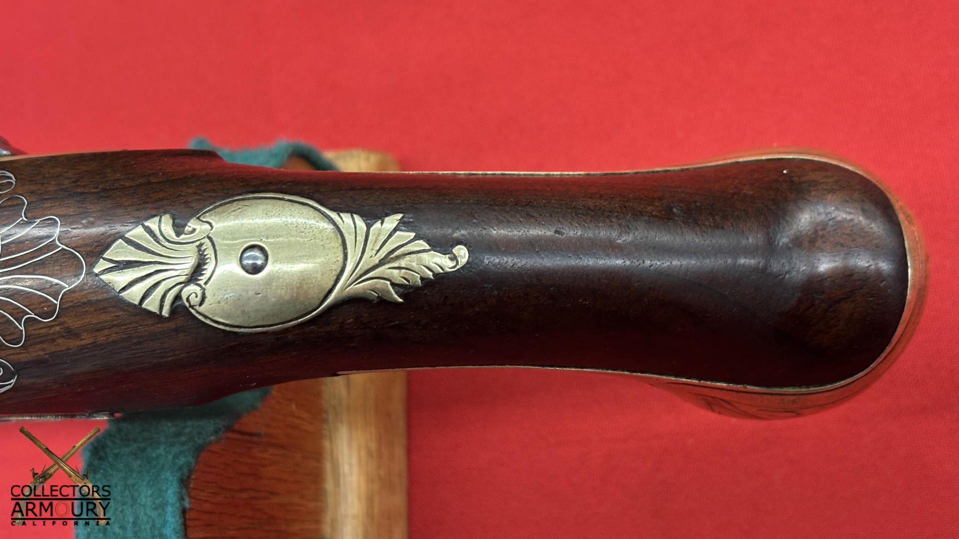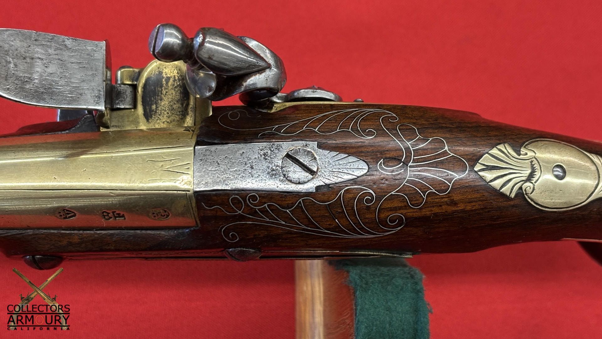 Fine figured walnut full stocks (one with tight crack on left of stock). Lovely silver wire inlay decorating the area behind the breech tang and 100% intact. Pistols are in good overall condition especially for Revolutionary War pistols of this type with only minor wear to butt engraving from polishing.