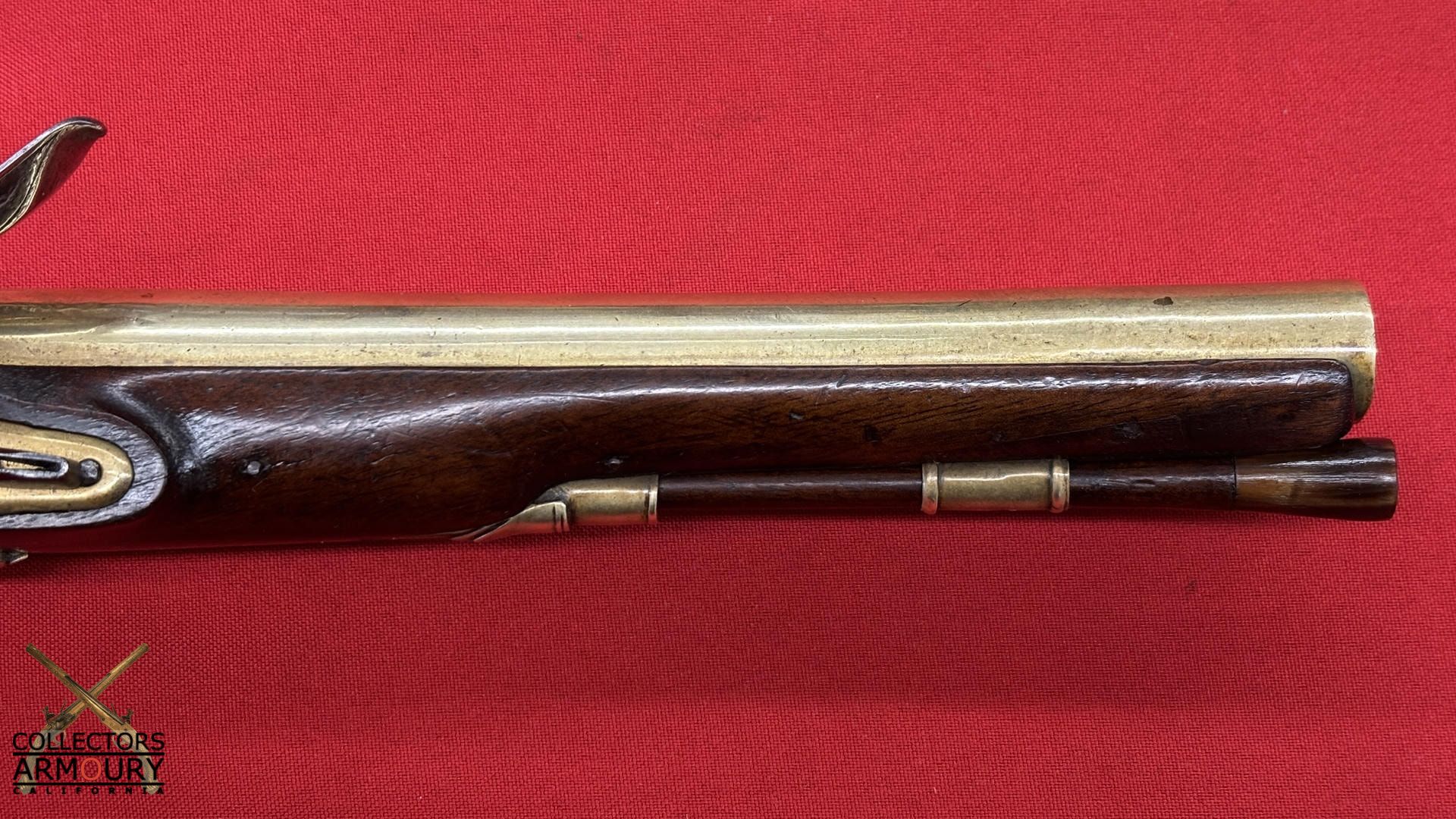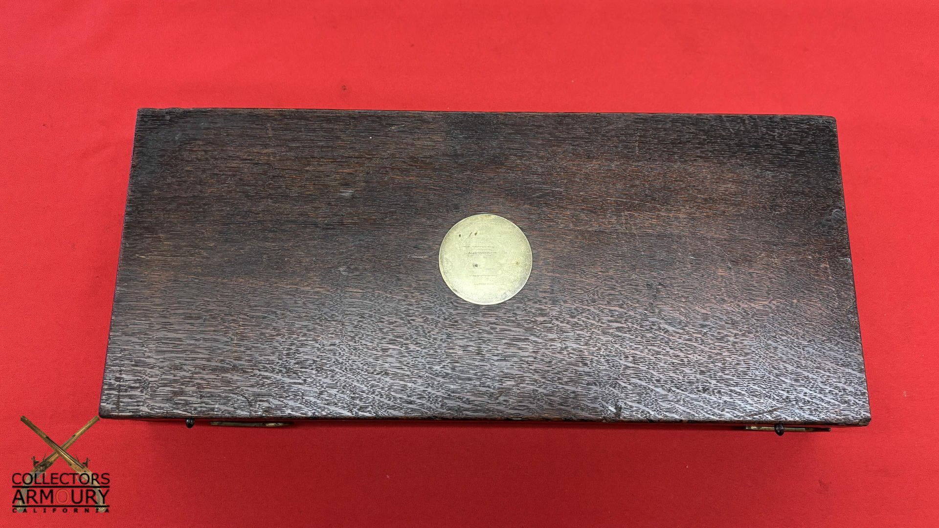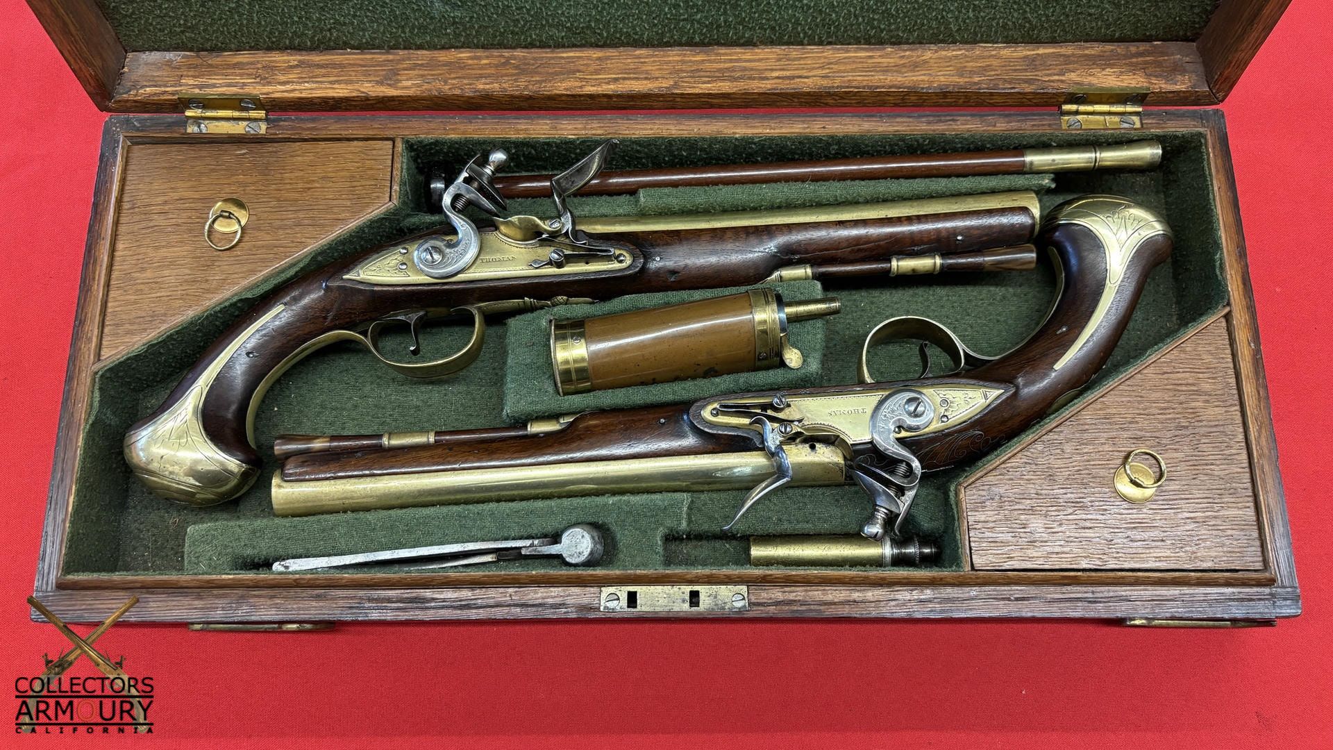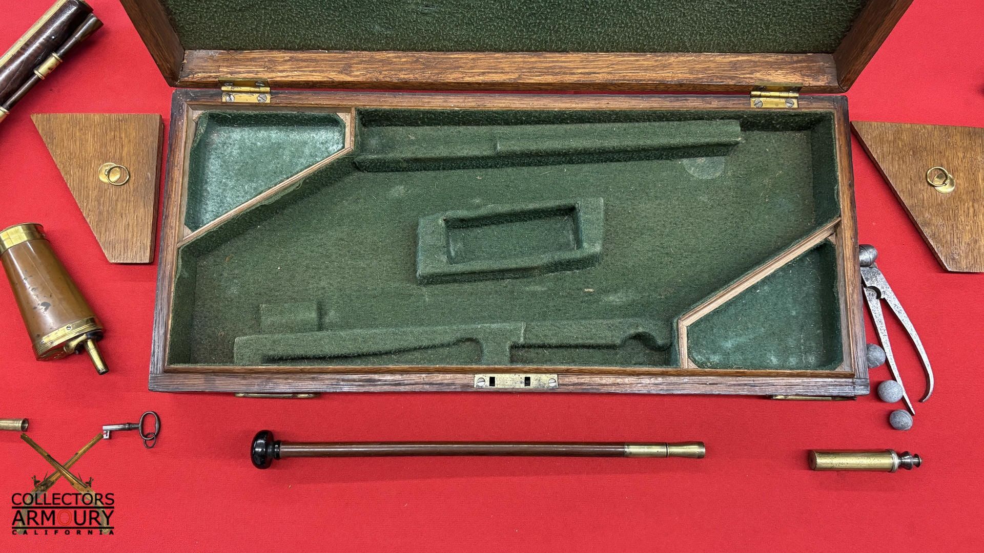 What is really rare and almost never seen is that these pistols are cased in an original fine condition period oak case with original green baize lining in excellent condition. Pistols fit properly. Accessories include original brass tipped walnut rod, bullet mold, oil bottle, brass jag and even the original key. Actions are good on both half and full cock.