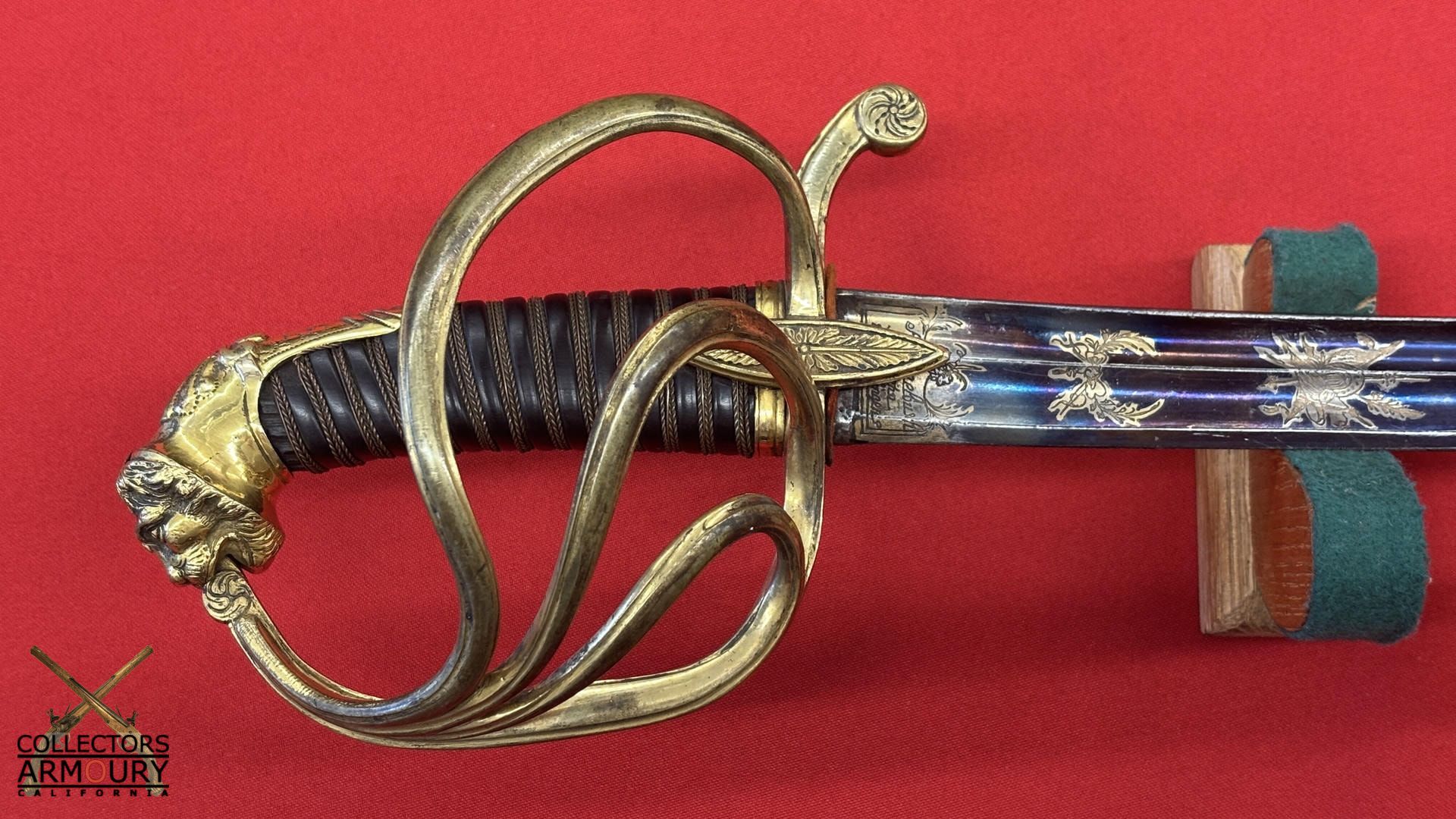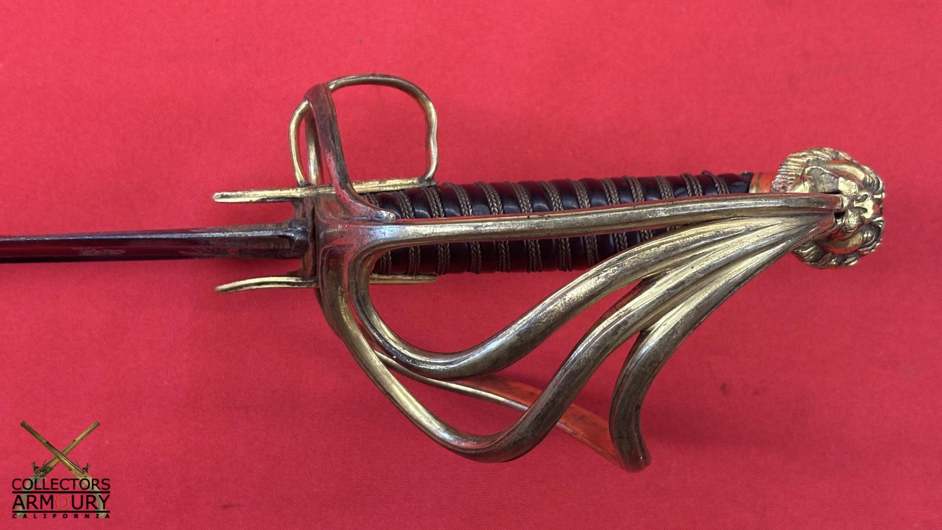 Splendid fire gilded lion head pommel three branch hilt with cast and chased langets. Ebony wood grip wrapped with triple strand twisted copper wire. Blade in near pristine condition with bright fire gilding and gold and much original polish. Hilt with 80%+ bright gilding and very little wear.