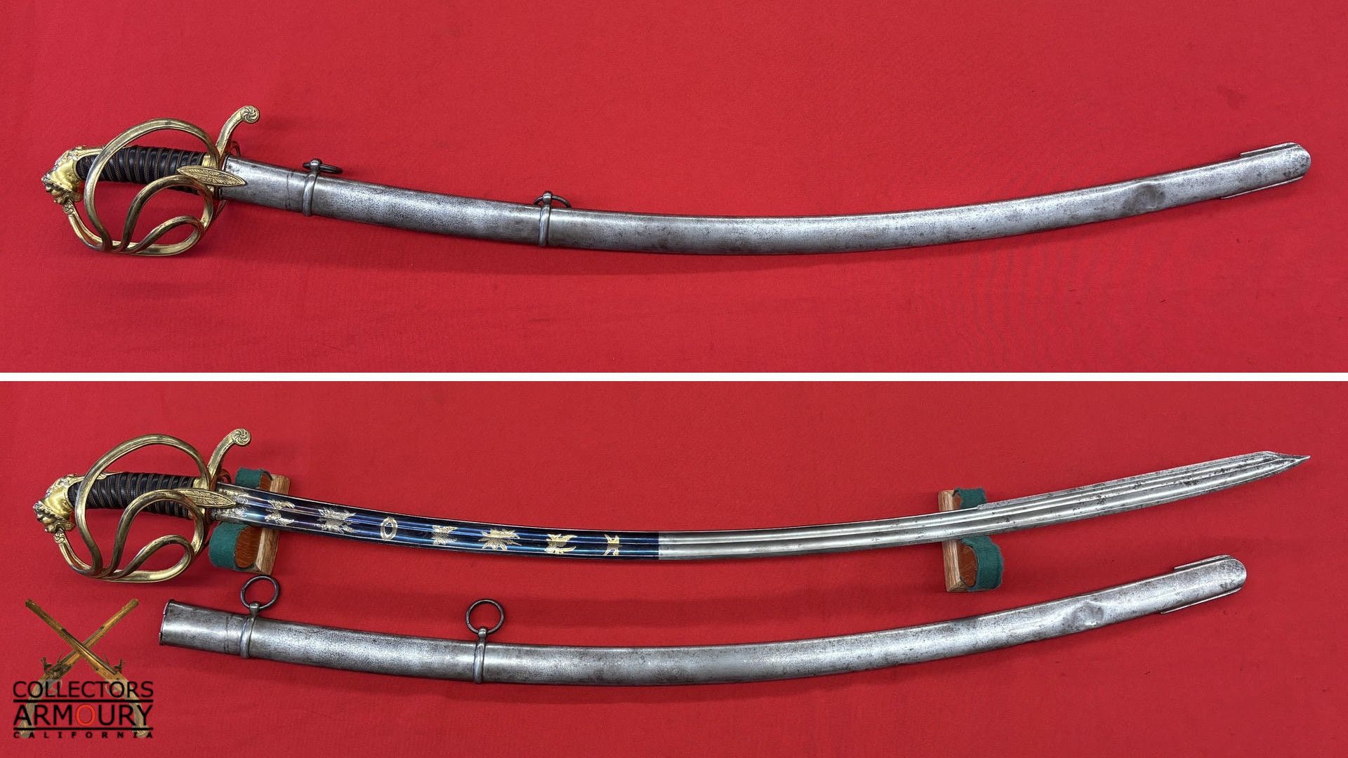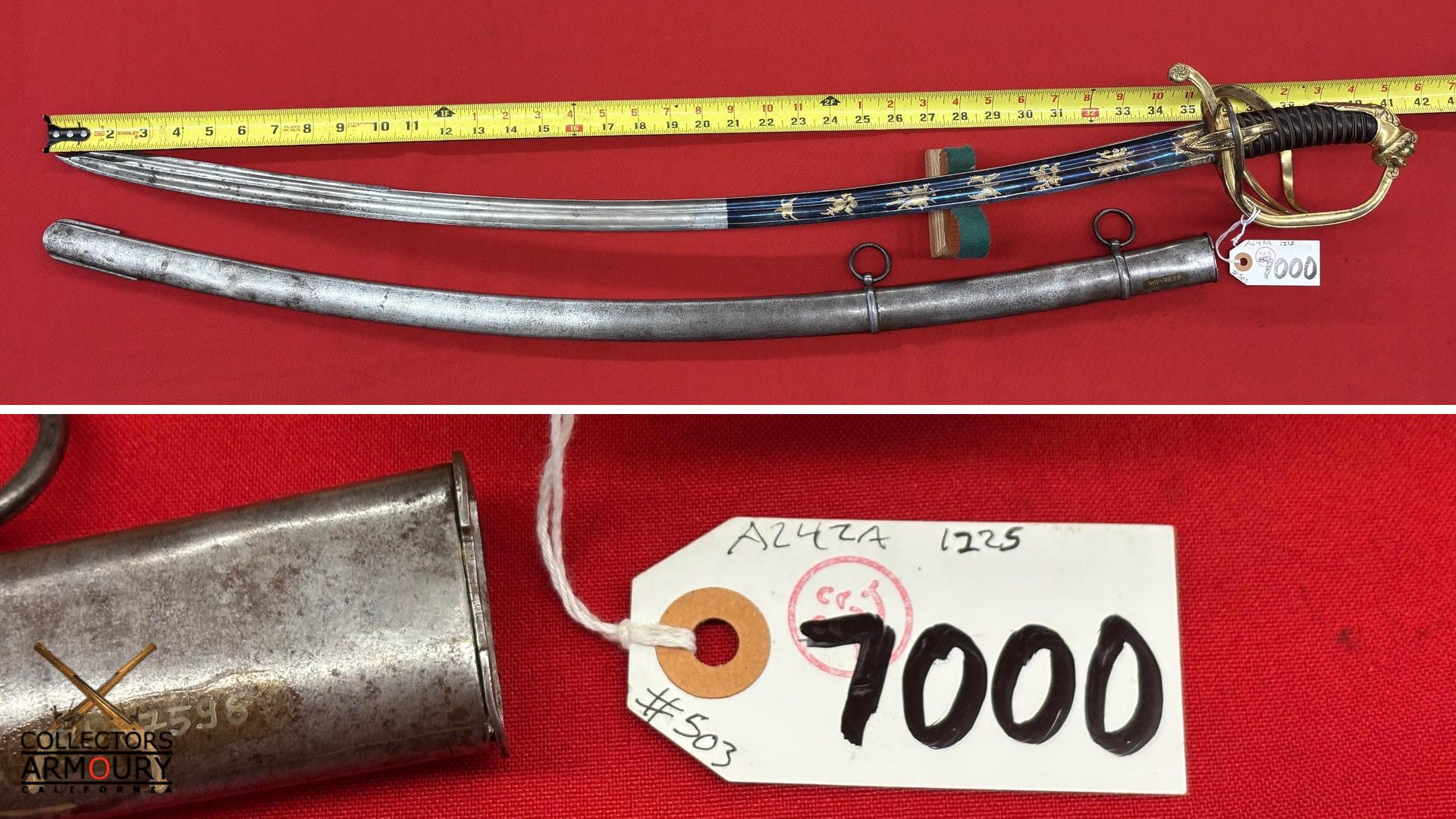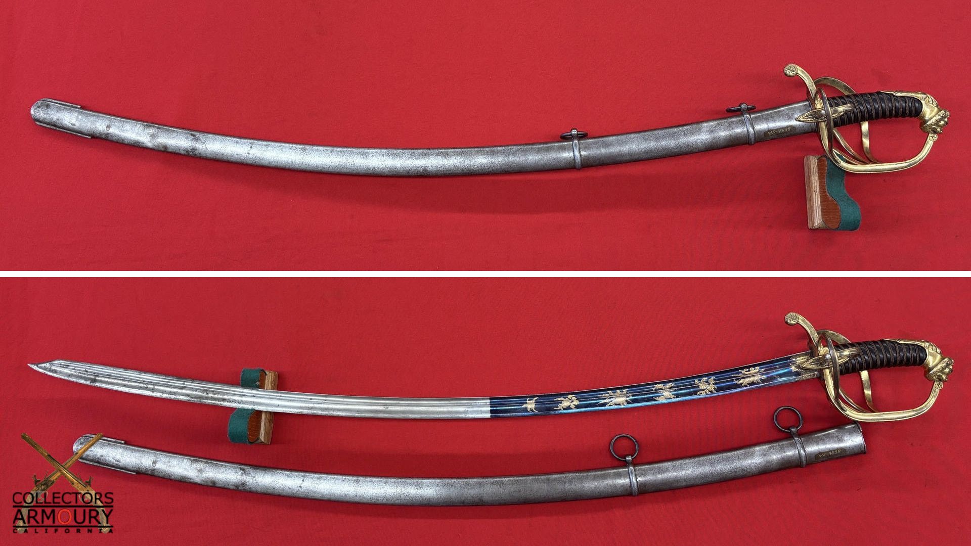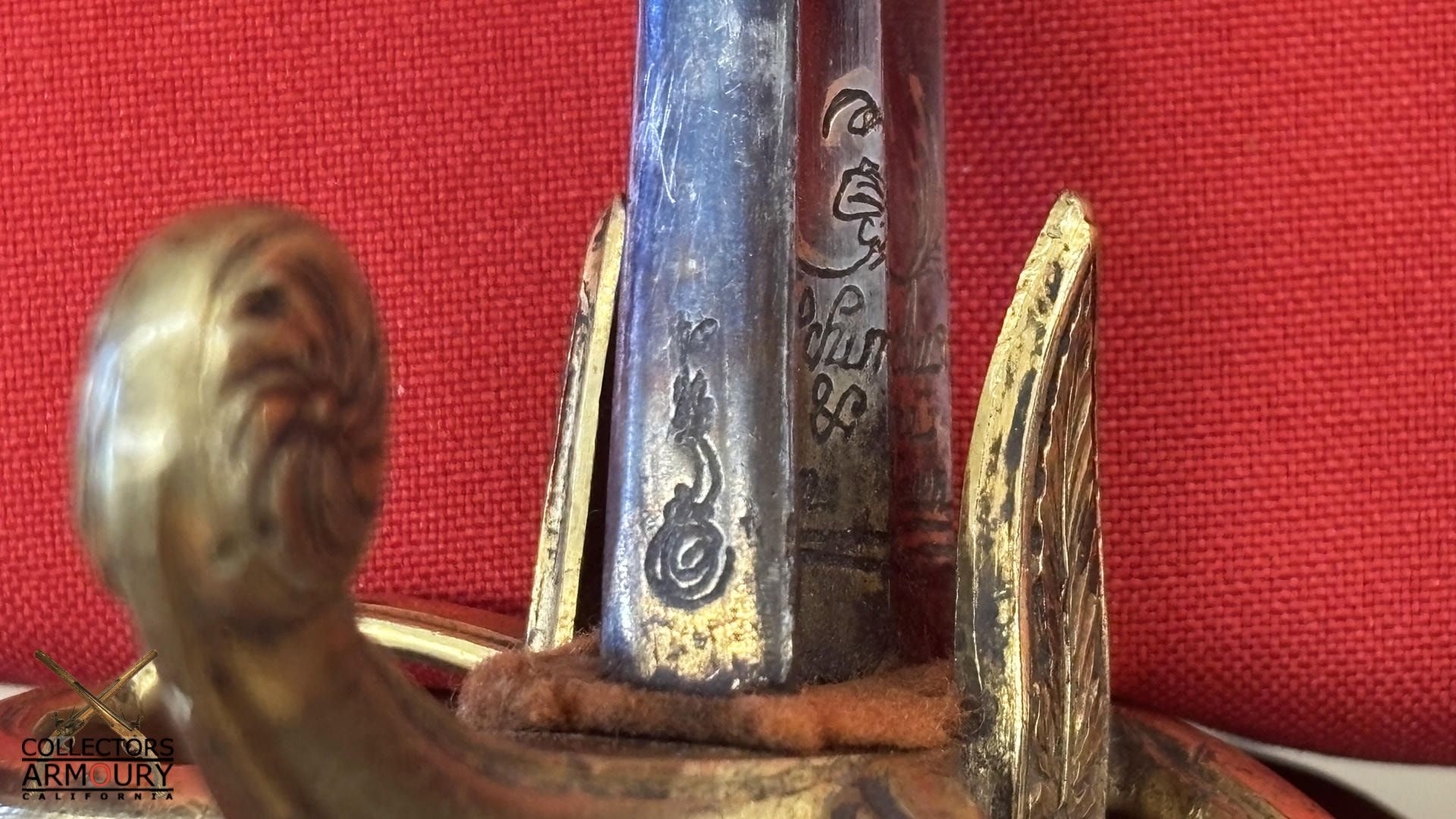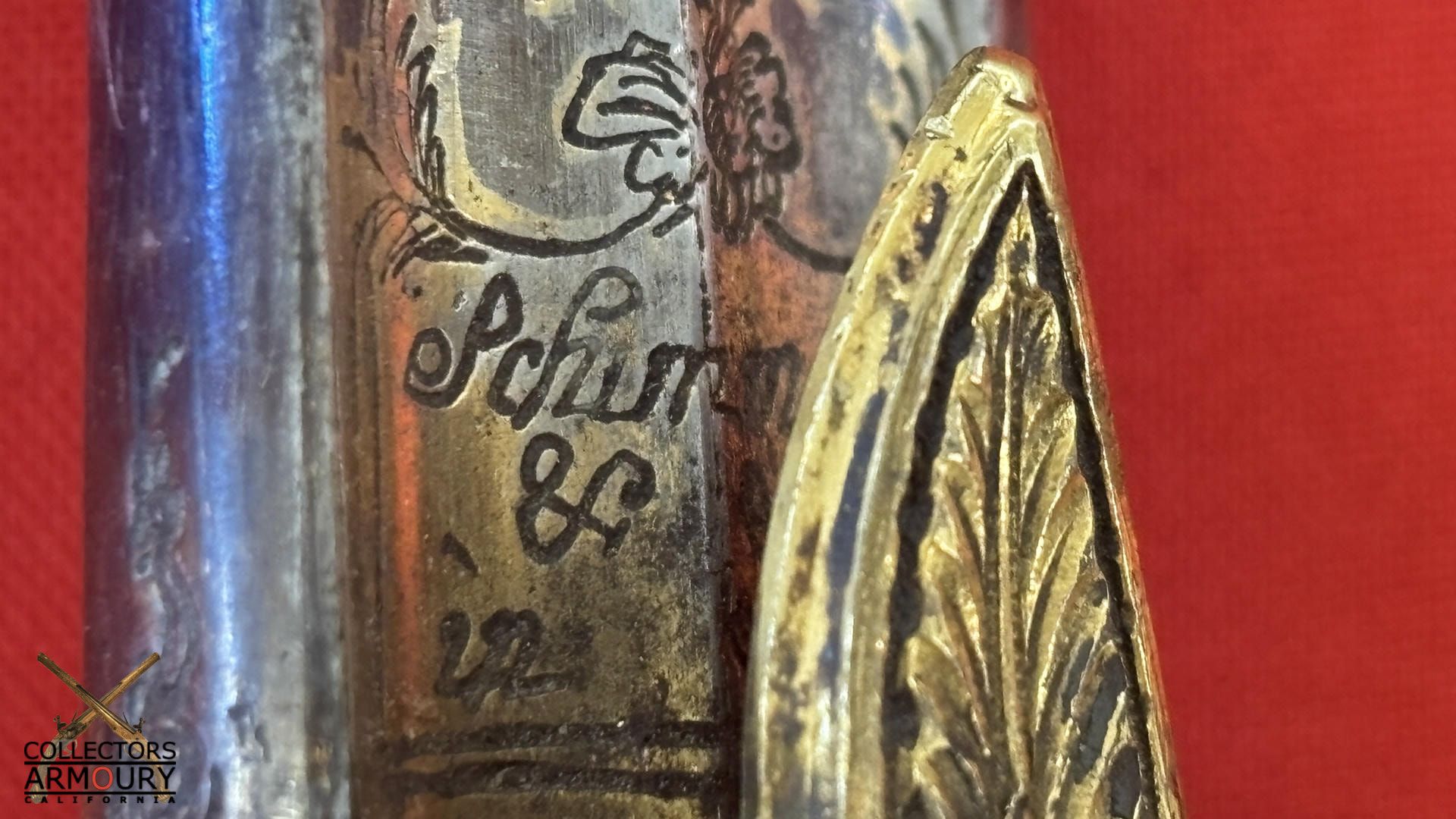 This lovely saber by one of Germany’s premiere makers of the Napoleonic era has its original steel scabbard in good condition with one significant ‘door’ pinch. Old museum inventory number near throat “WS-7298”. 41 and 1/2 inches long out of scabbard.