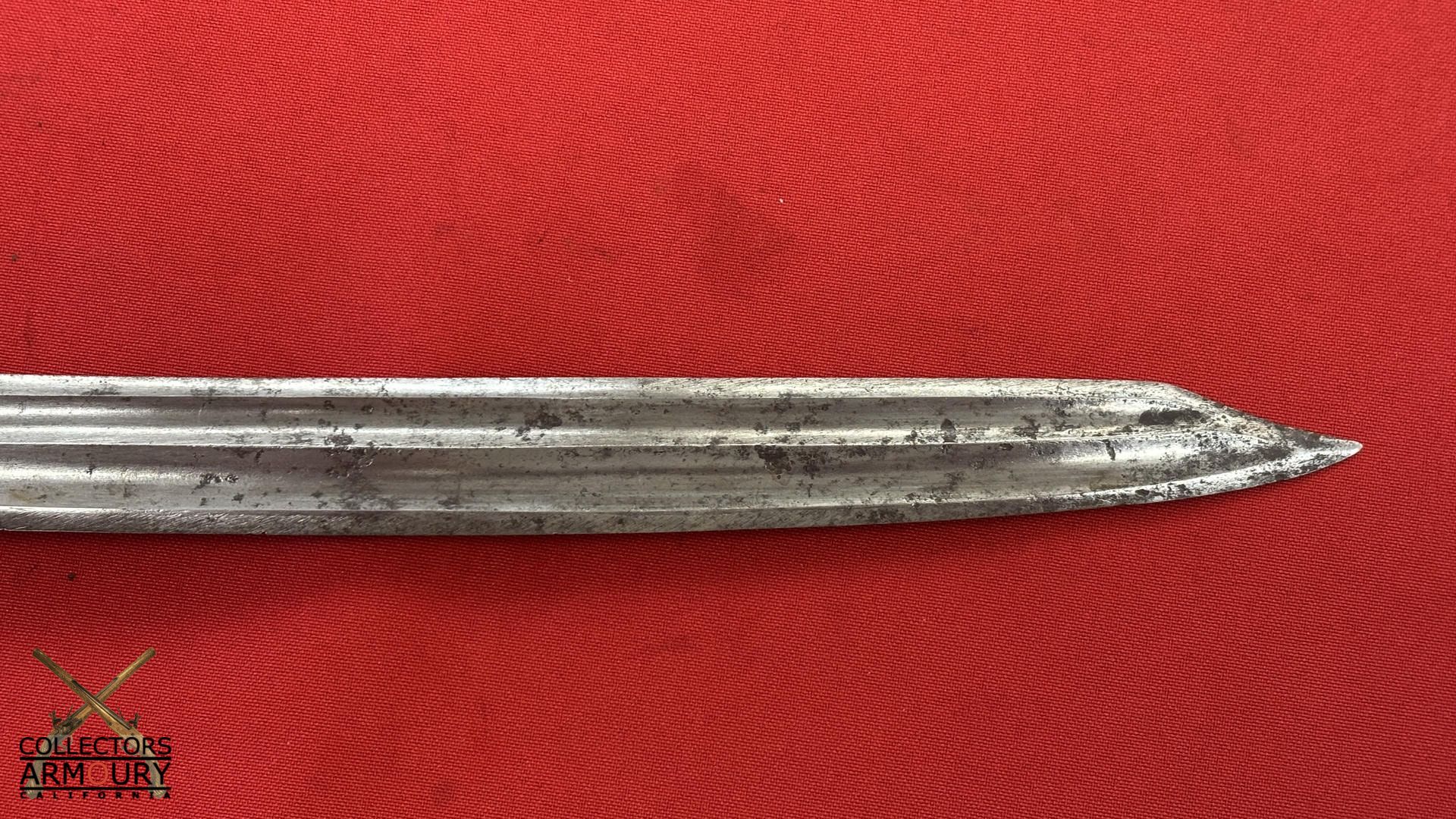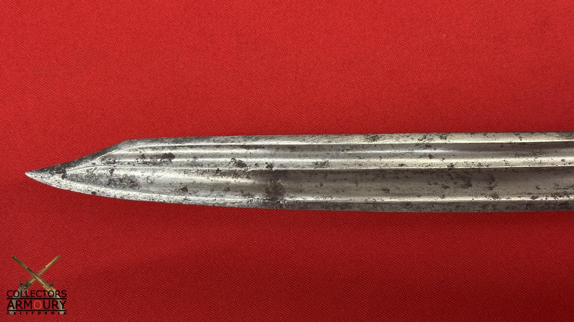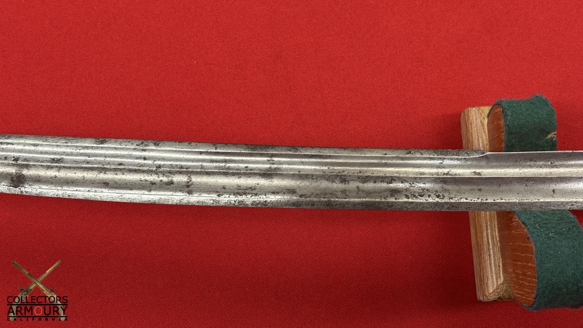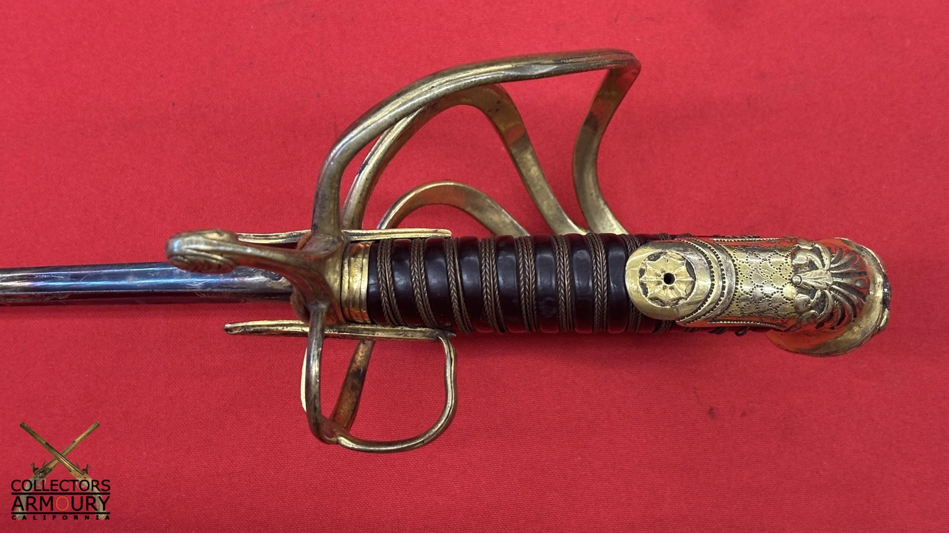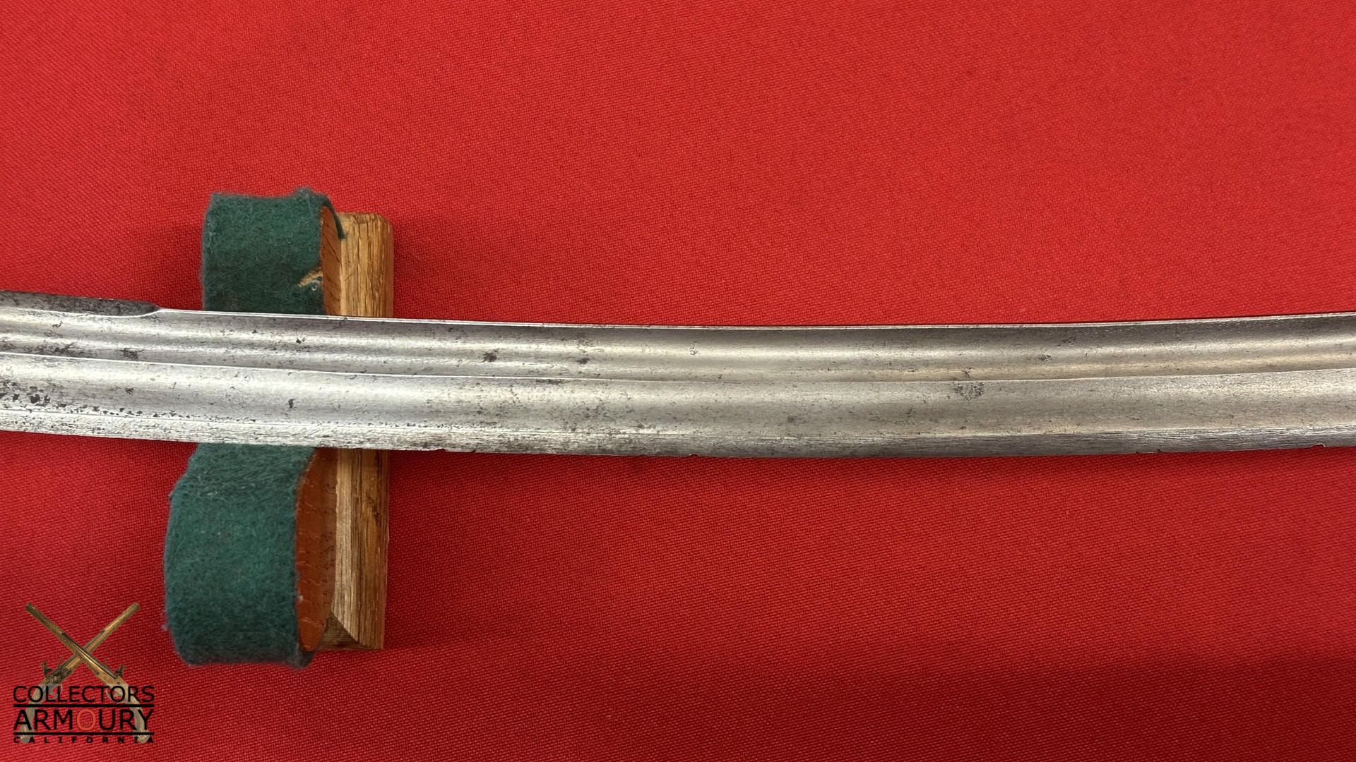 This lovely saber by one of Germany’s premiere makers of the Napoleonic era has its original steel scabbard in good condition with one significant ‘door’ pinch. Old museum inventory number near throat “WS-7298”. 41 and 1/2 inches long out of scabbard.