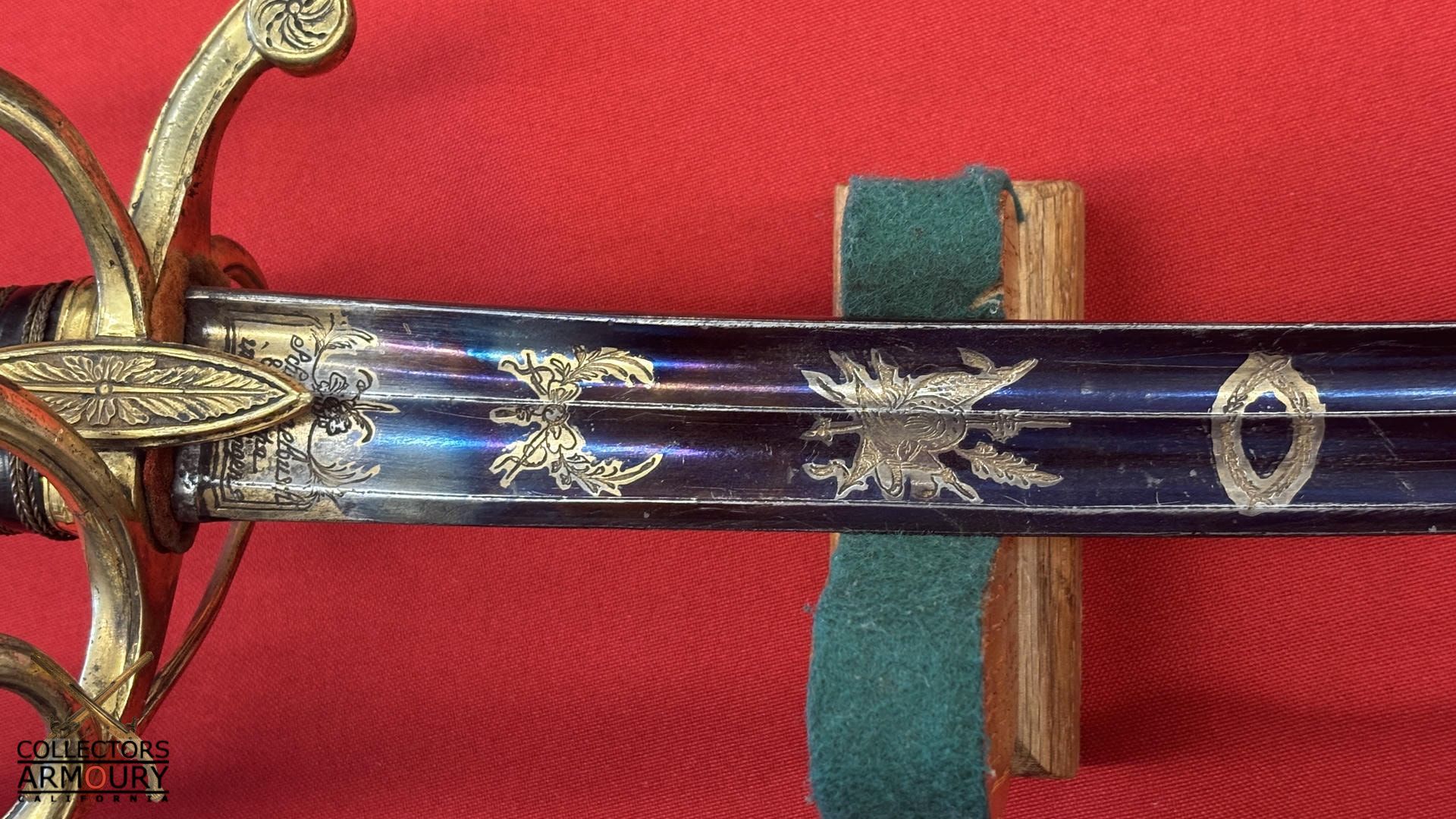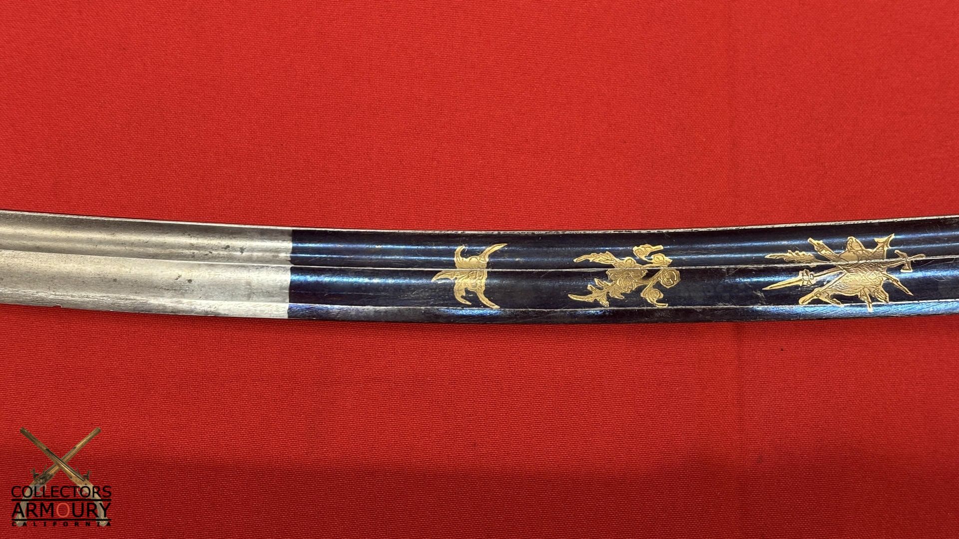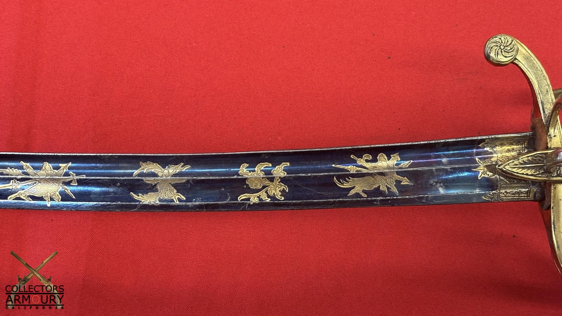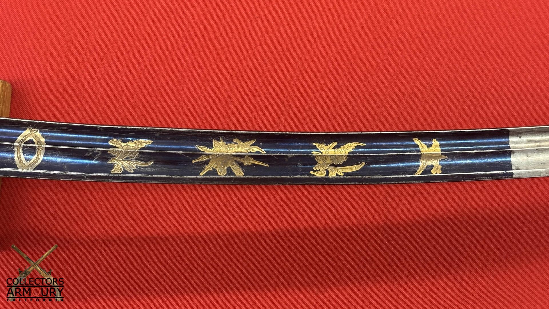 The 35 inch long blade of exquisite quality with double fullers running the full length of the blade. Small clipped point characteristic of the finer officer’s saber blades of this era. 14 and 1/4 inch fire blued and gilt panel of trophies of arms. Signed at ricasso on right “SCHIMMELBUSCHE IN SOLINGEN”.