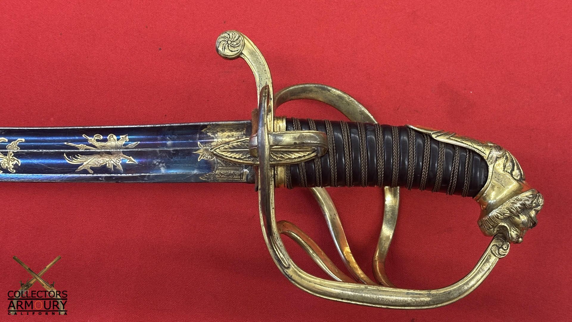 An Truly Exceptional Napoleonic Era Prussian Cavalry Hussar Officer’s Saber With Splendid Gilded Lion Pommel Hilt And Fire Blued And Gilt Blade.