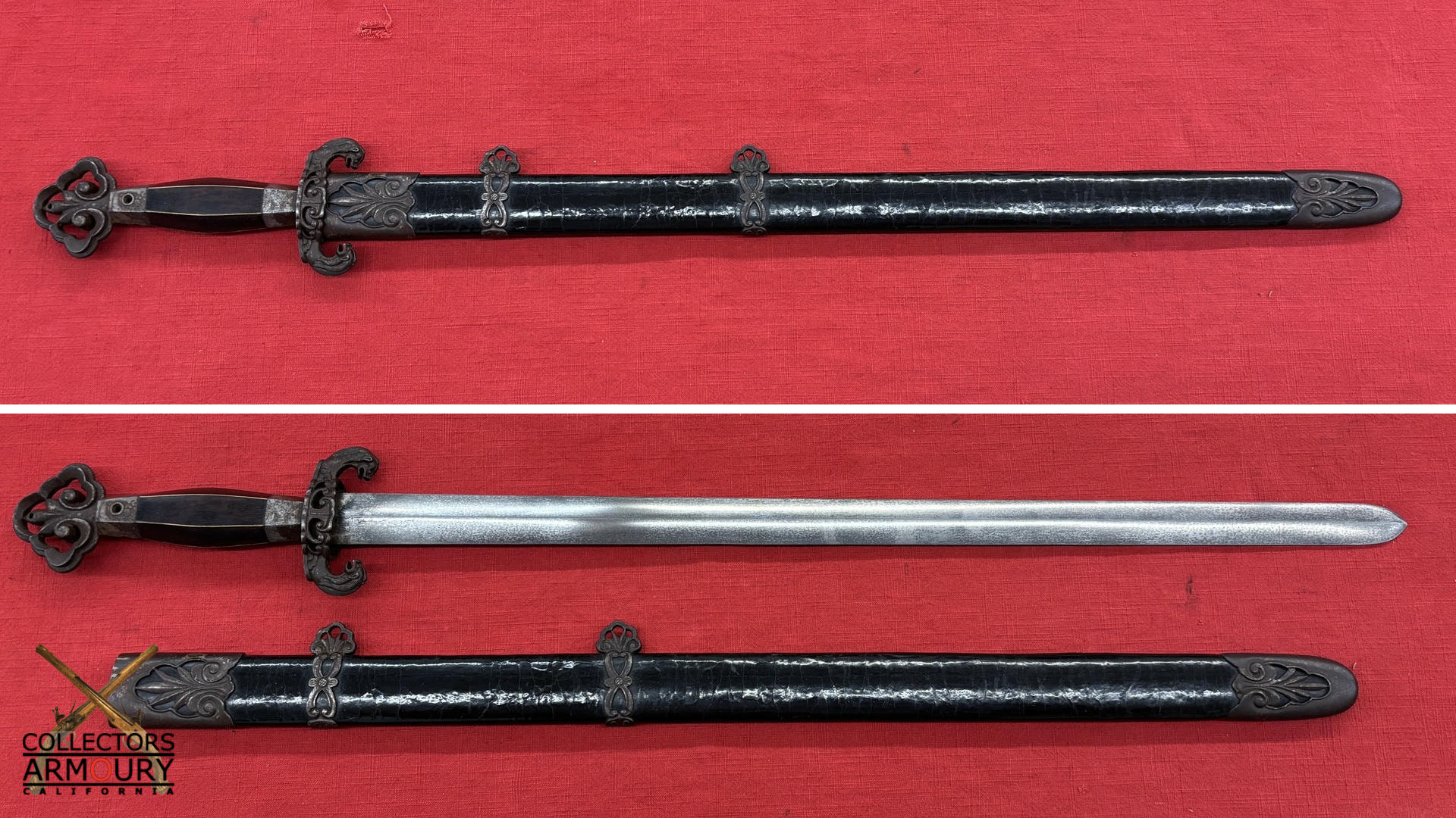This lovely saber by one of Germany’s premiere makers of the Napoleonic era has its original steel scabbard in good condition with one significant ‘door’ pinch. Old museum inventory number near throat “WS-7298”. 41 and 1/2 inches long out of scabbard.