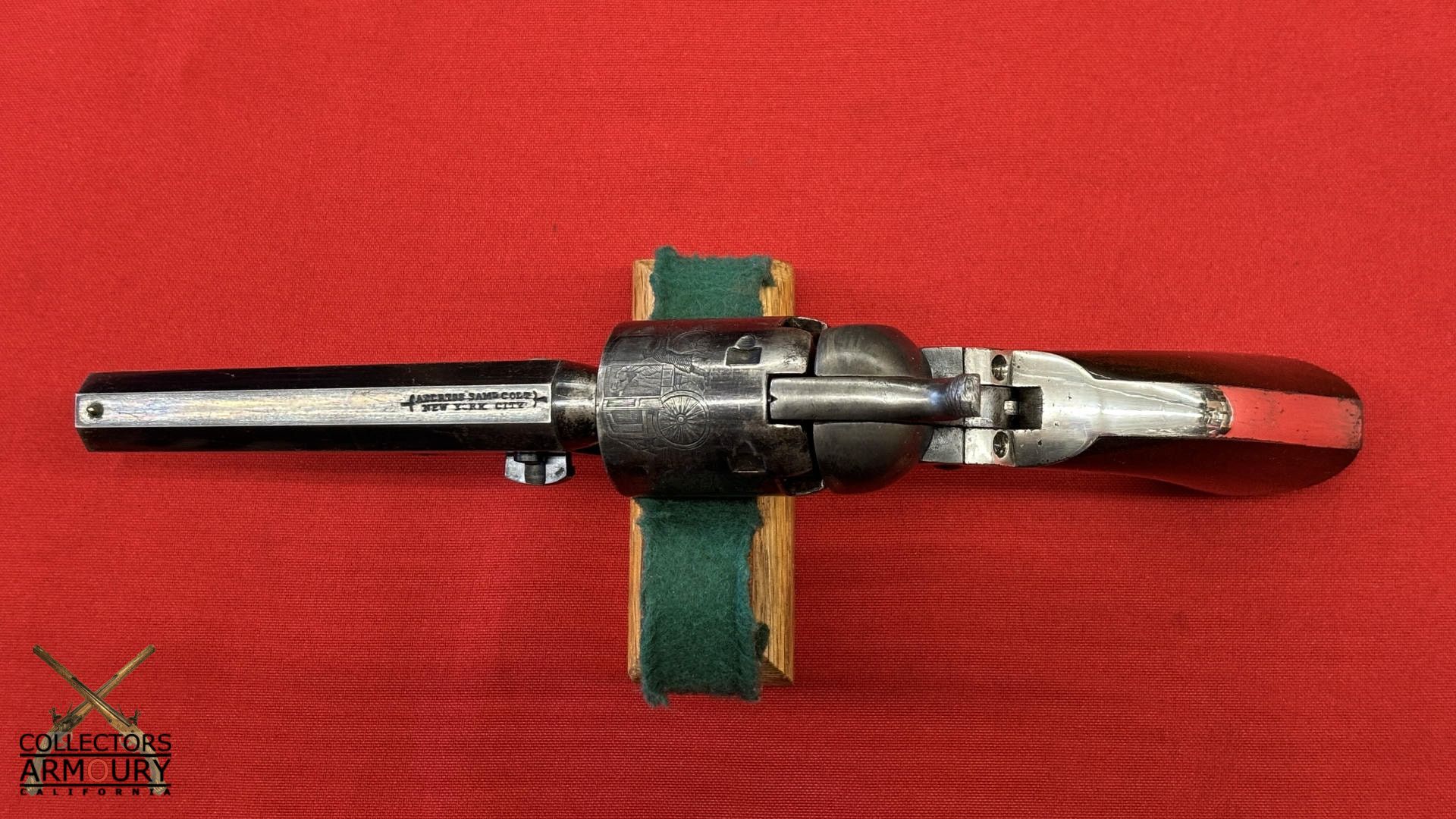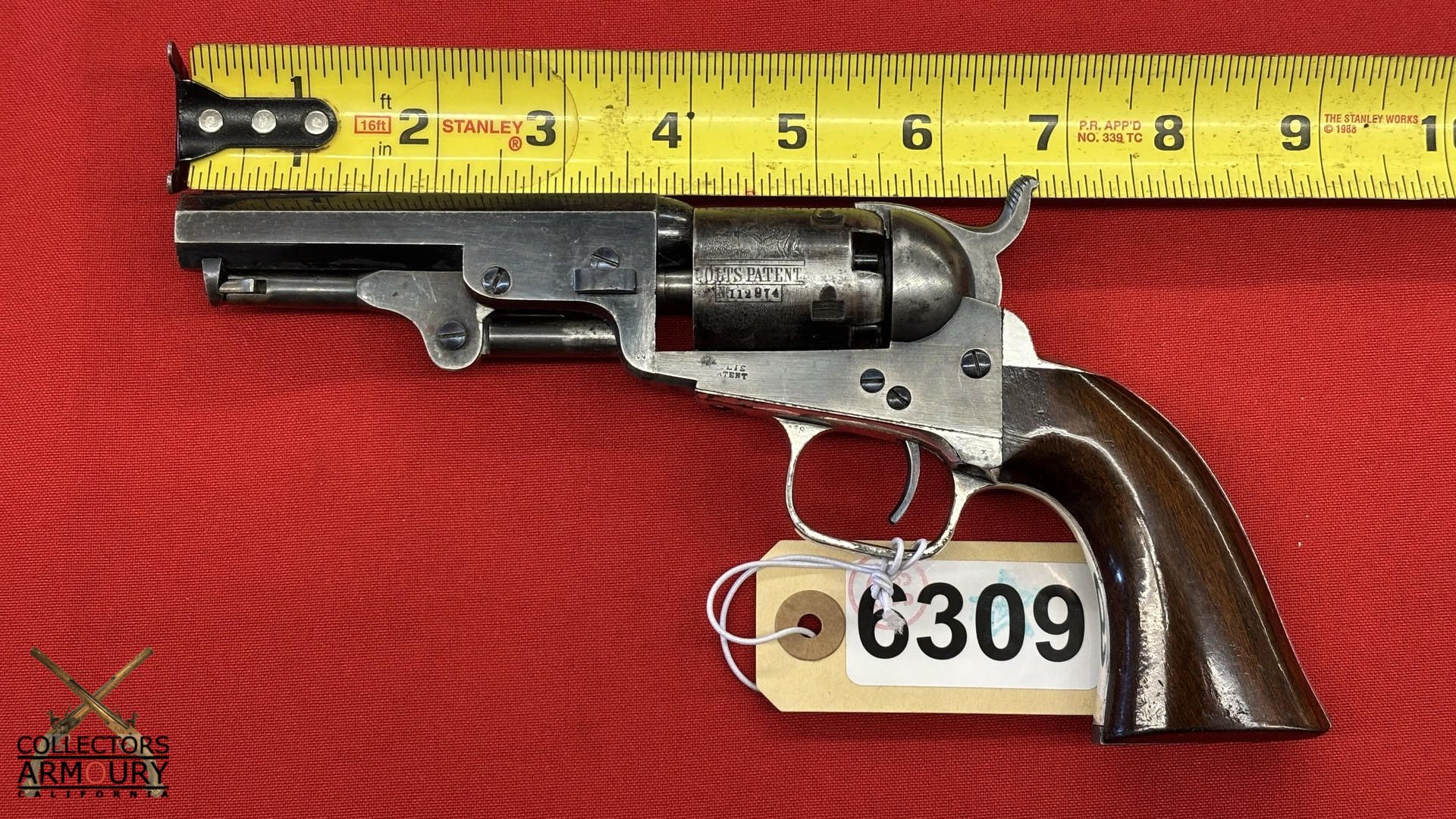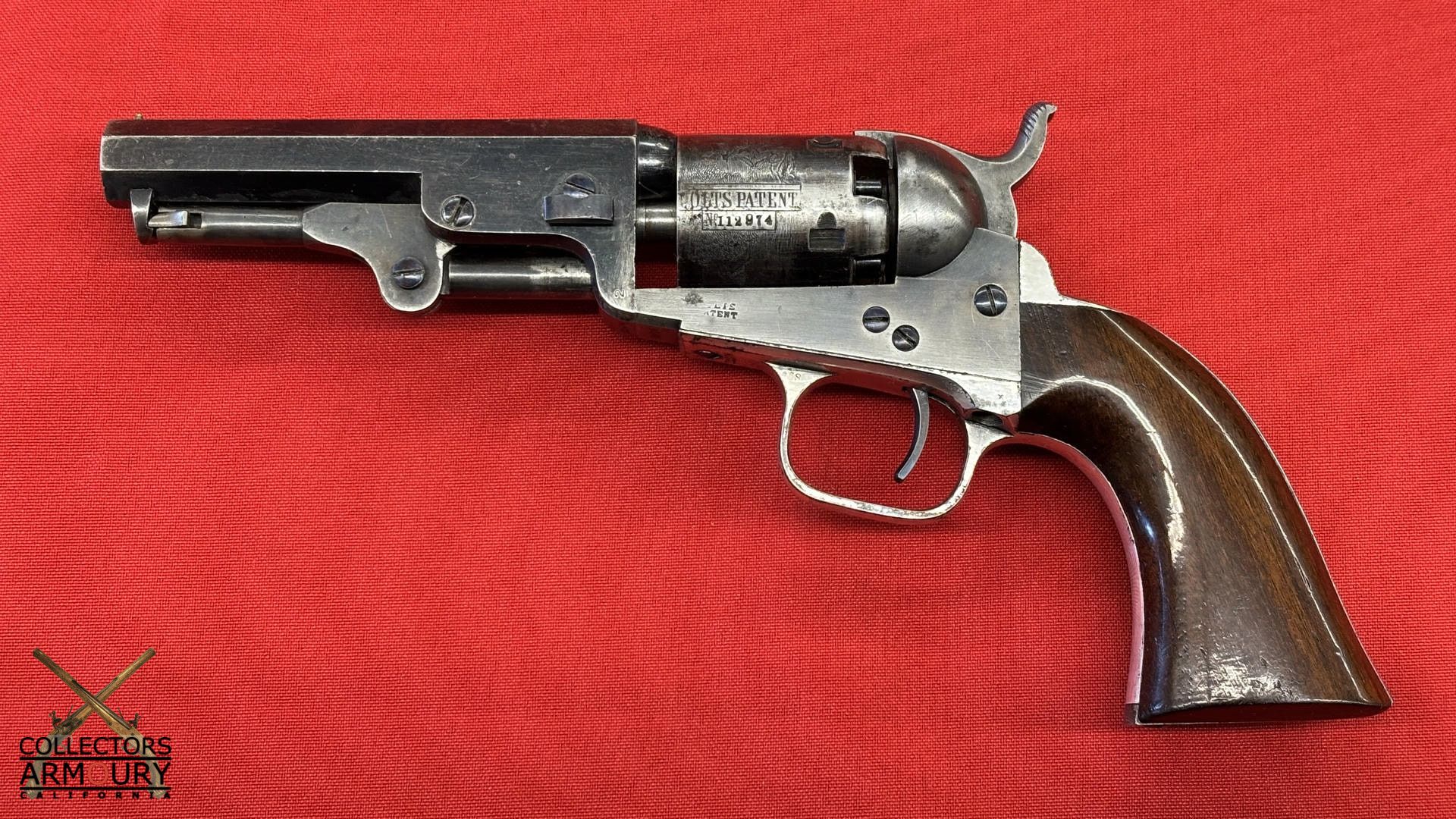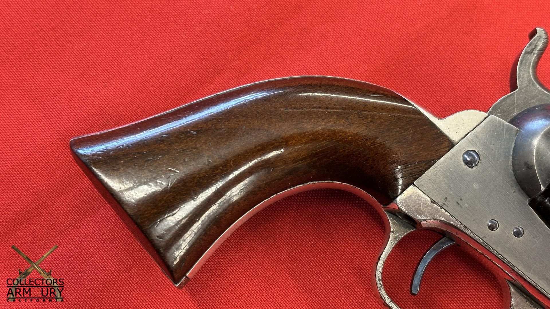 4 inch octagonal barrel. .31 caliber. Serial numbers all matching including wedge and loading lever. A truly superior ’49 pocket in every respect. The barrel with 95%+ bright original blue. Two line New York address. The lever retains 90% casehardening. The wedge is nearly new and exhibits none of the usual battering from disassembly.