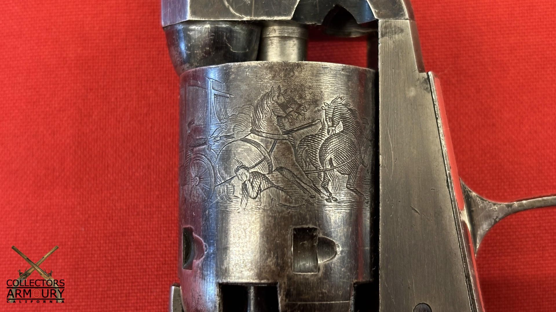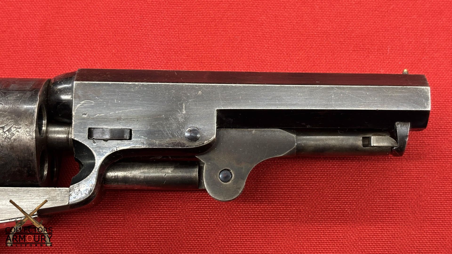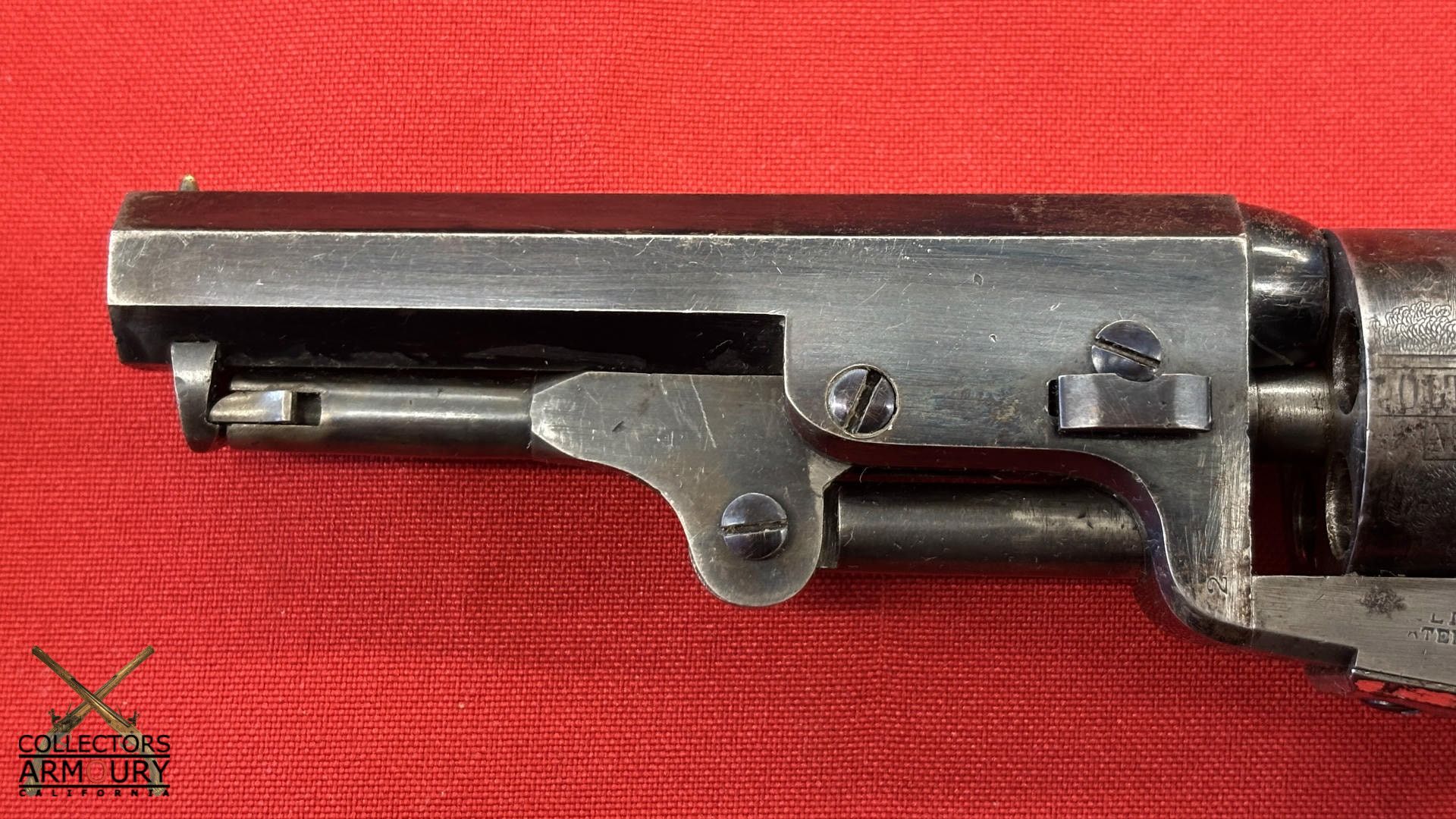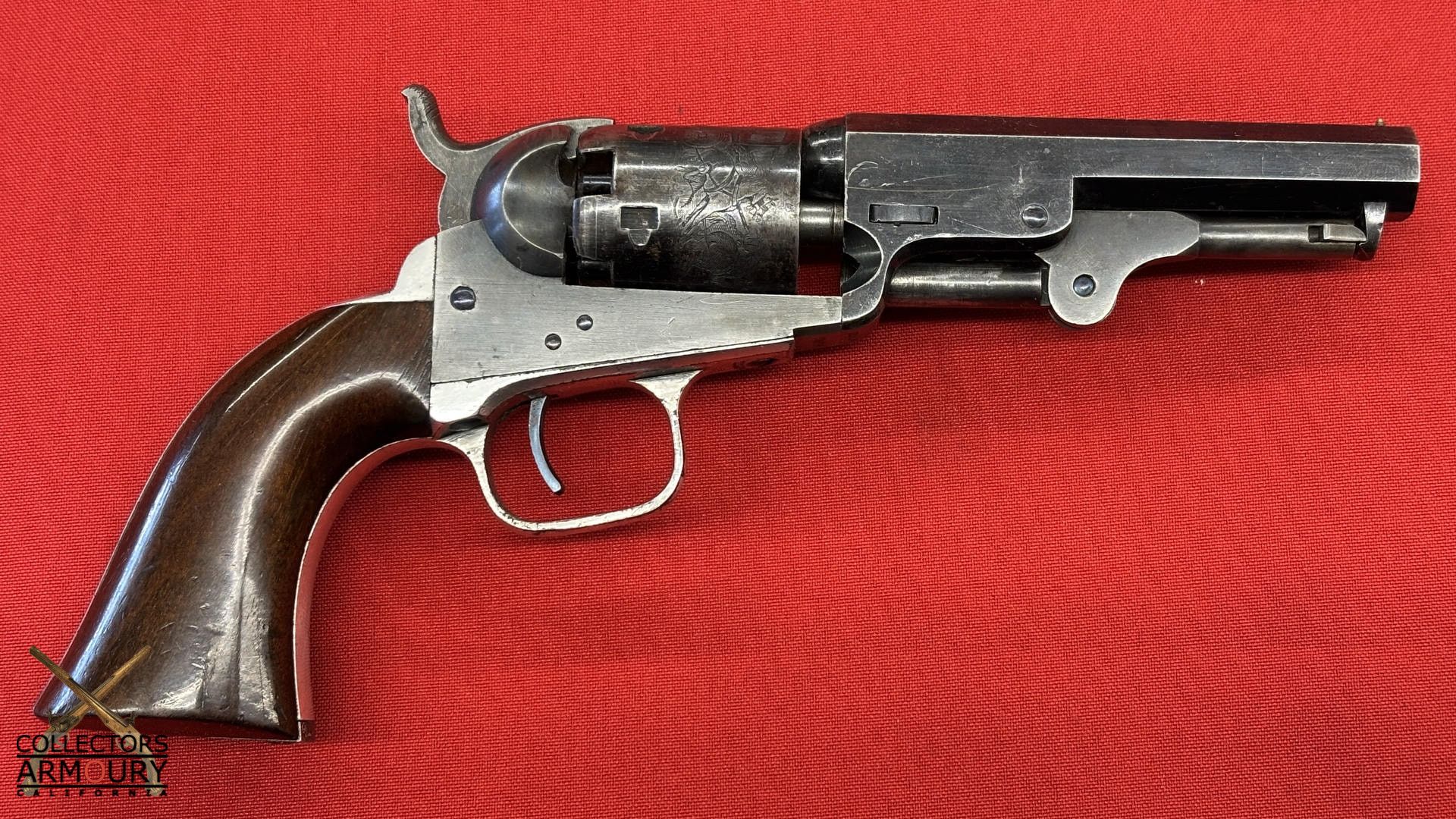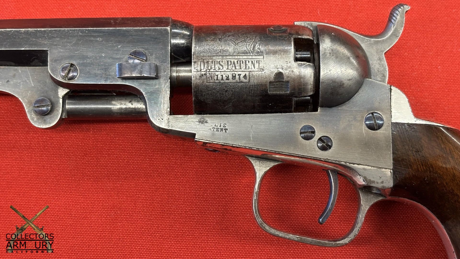 4 inch octagonal barrel. .31 caliber. Serial numbers all matching including wedge and loading lever. A truly superior ’49 pocket in every respect. The barrel with 95%+ bright original blue. Two line New York address. The lever retains 90% casehardening. The wedge is nearly new and exhibits none of the usual battering from disassembly.