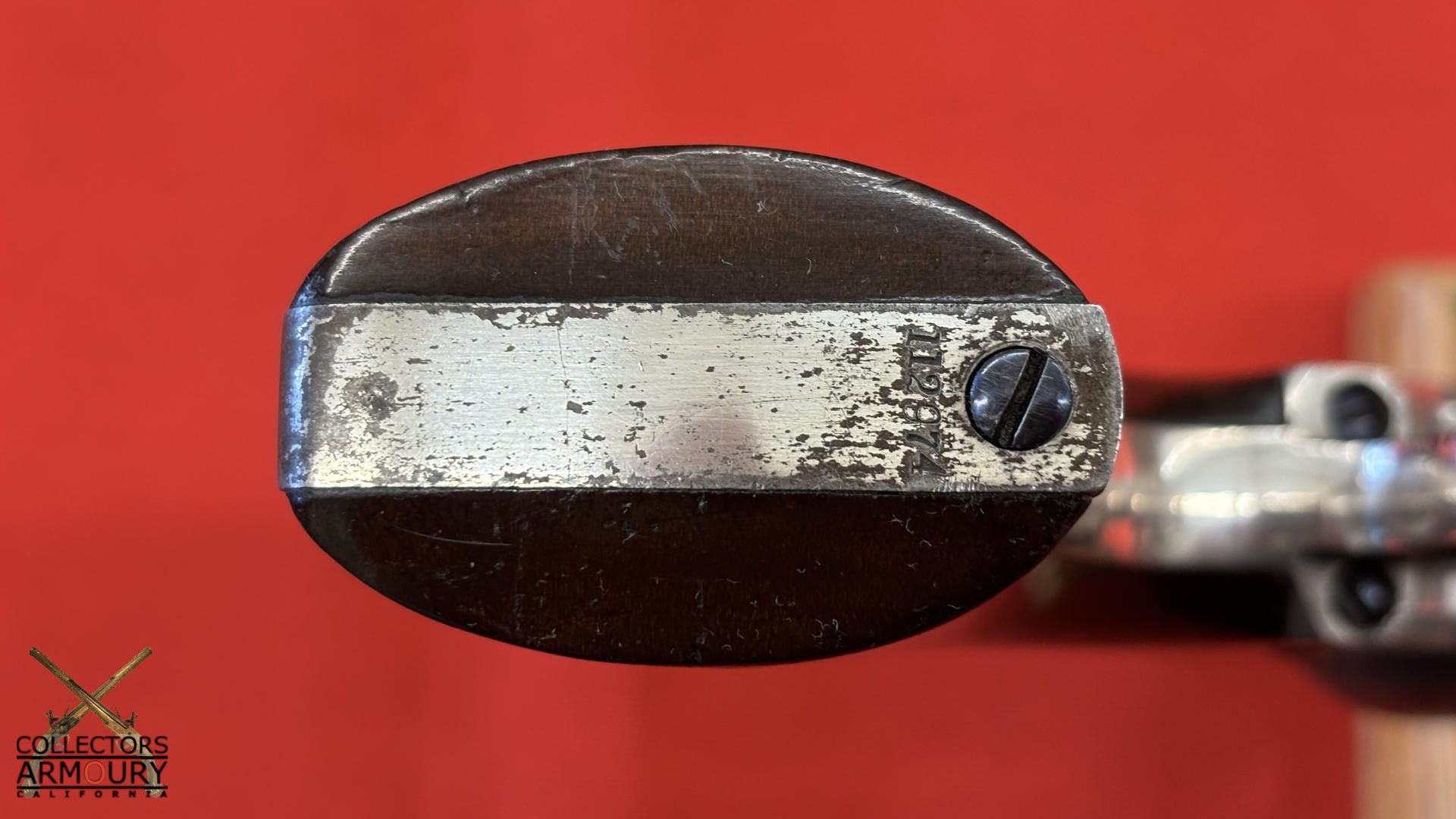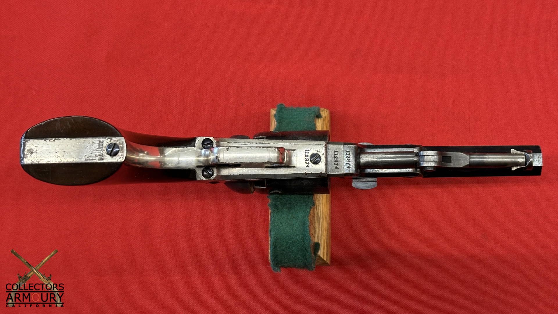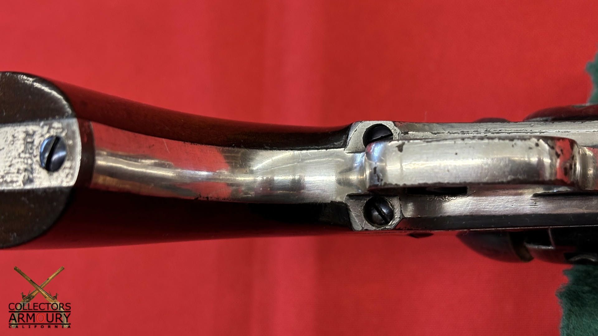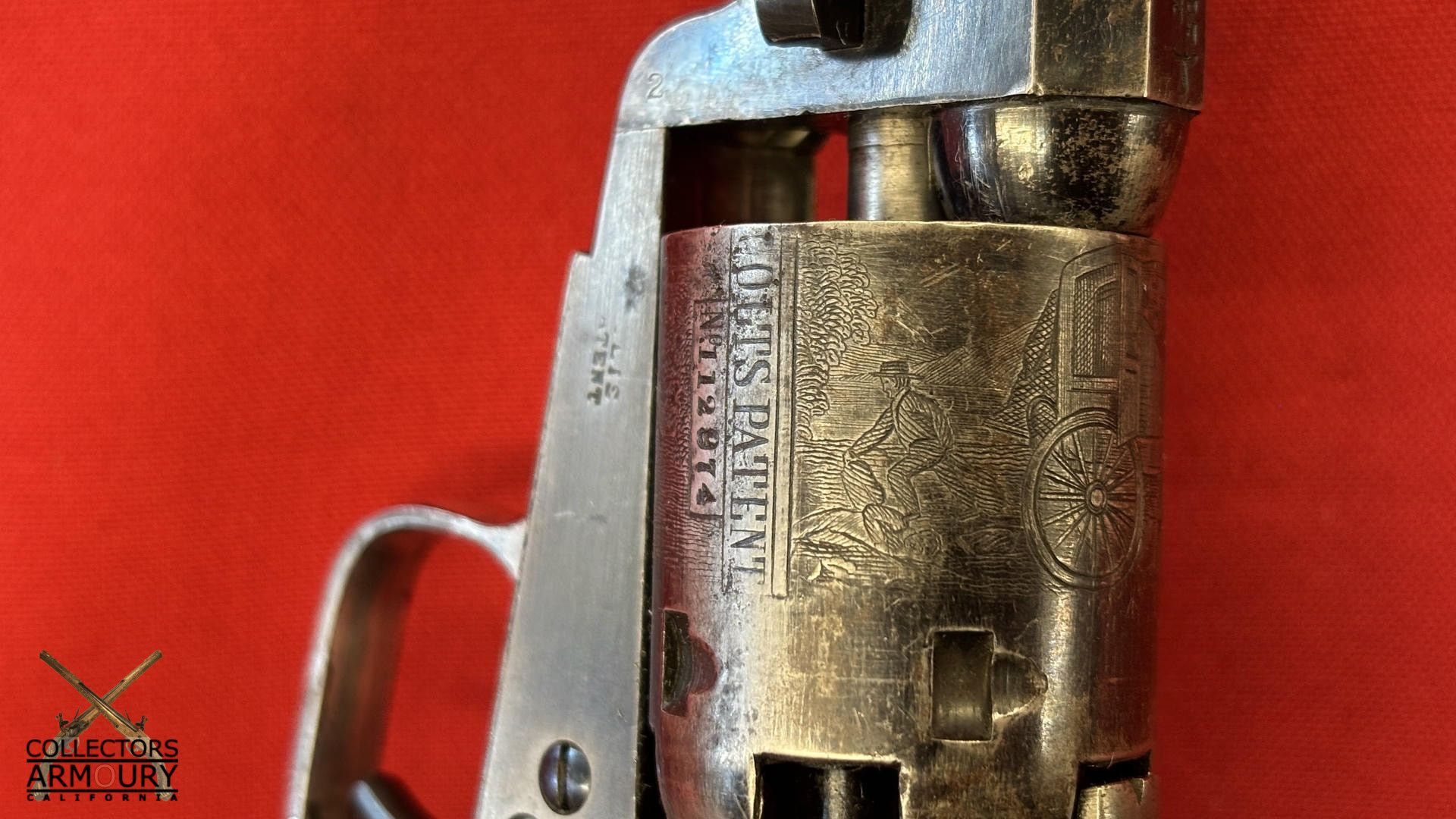 4 inch octagonal barrel. .31 caliber. Serial numbers all matching including wedge and loading lever. A truly superior ’49 pocket in every respect. The barrel with 95%+ bright original blue. Two line New York address. The lever retains 90% casehardening. The wedge is nearly new and exhibits none of the usual battering from disassembly.