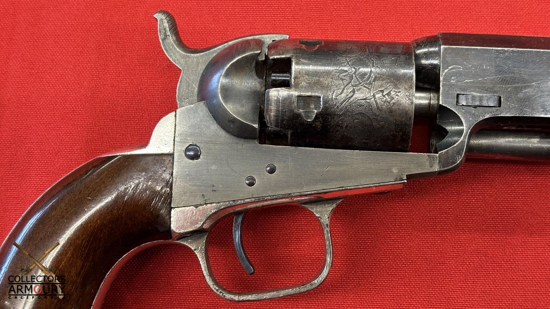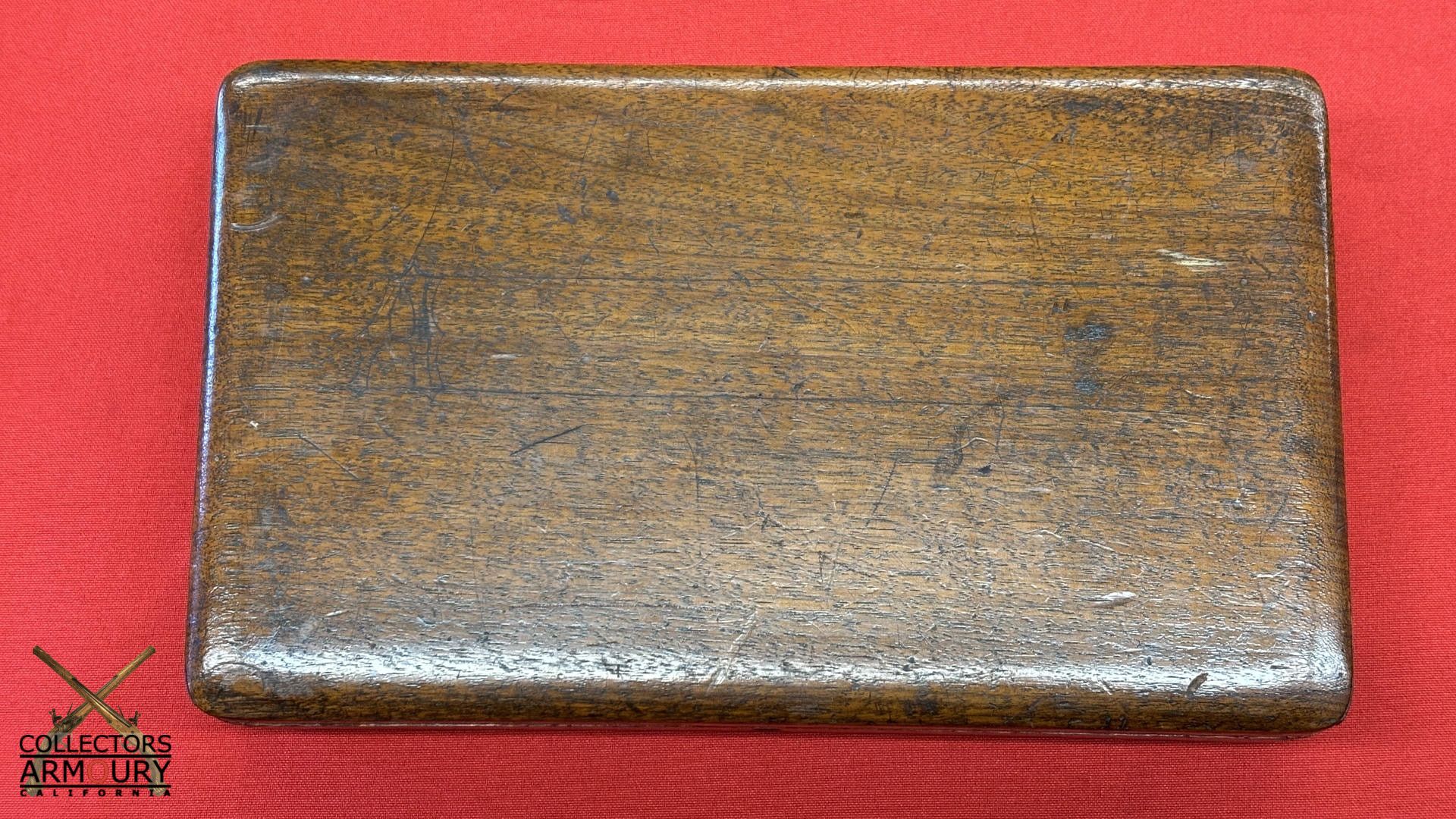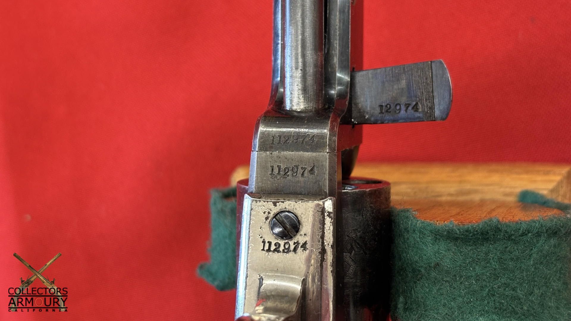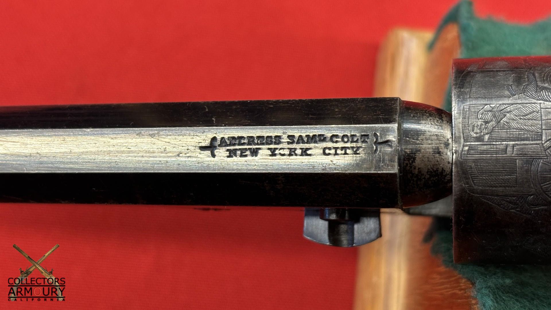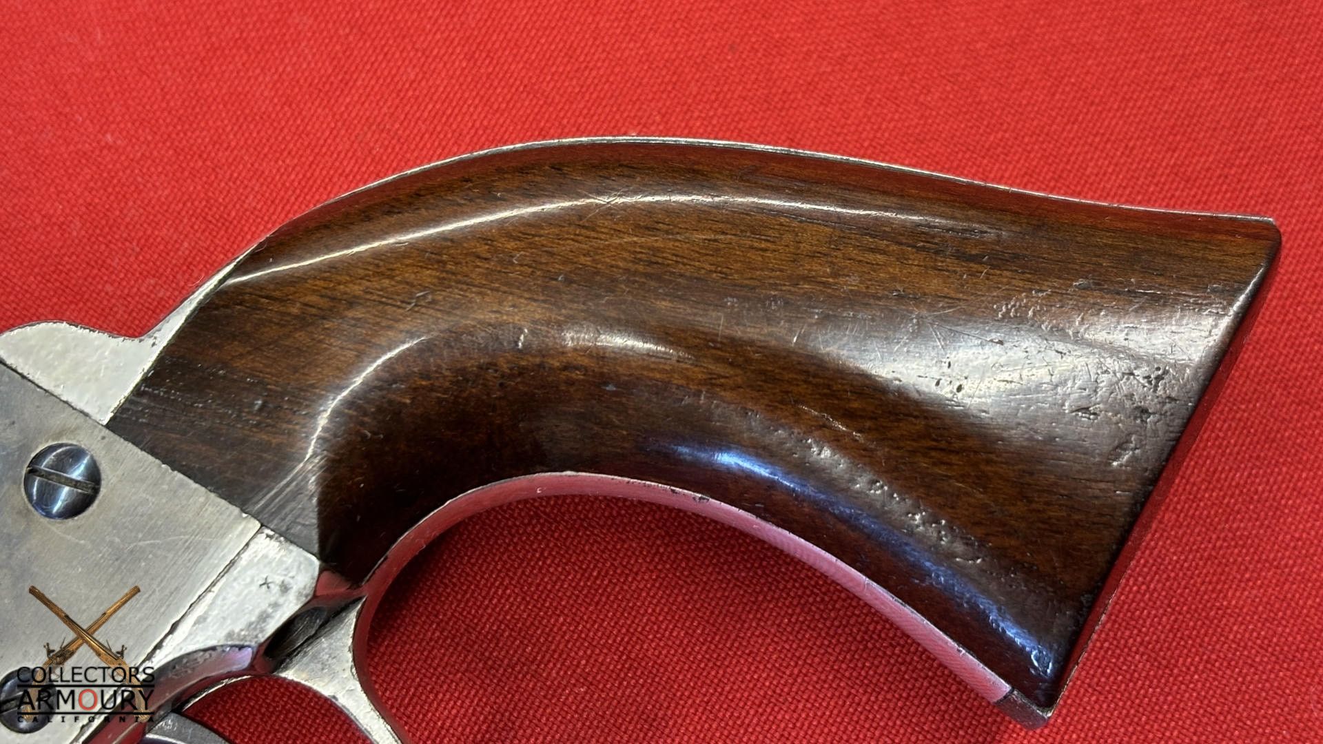 Figured walnut grips retain nearly 100% original Colt Factory varnish. Trigger with much original bluing. Hammer with most faded case colors. Appears to have left the factory without pin safeties. The action is ultra crisp. Nipples show much original blue. Bore is excellent. Original Colt Factory mahogany case with fine Colt style flask (one dent), original wine red velvet lining.