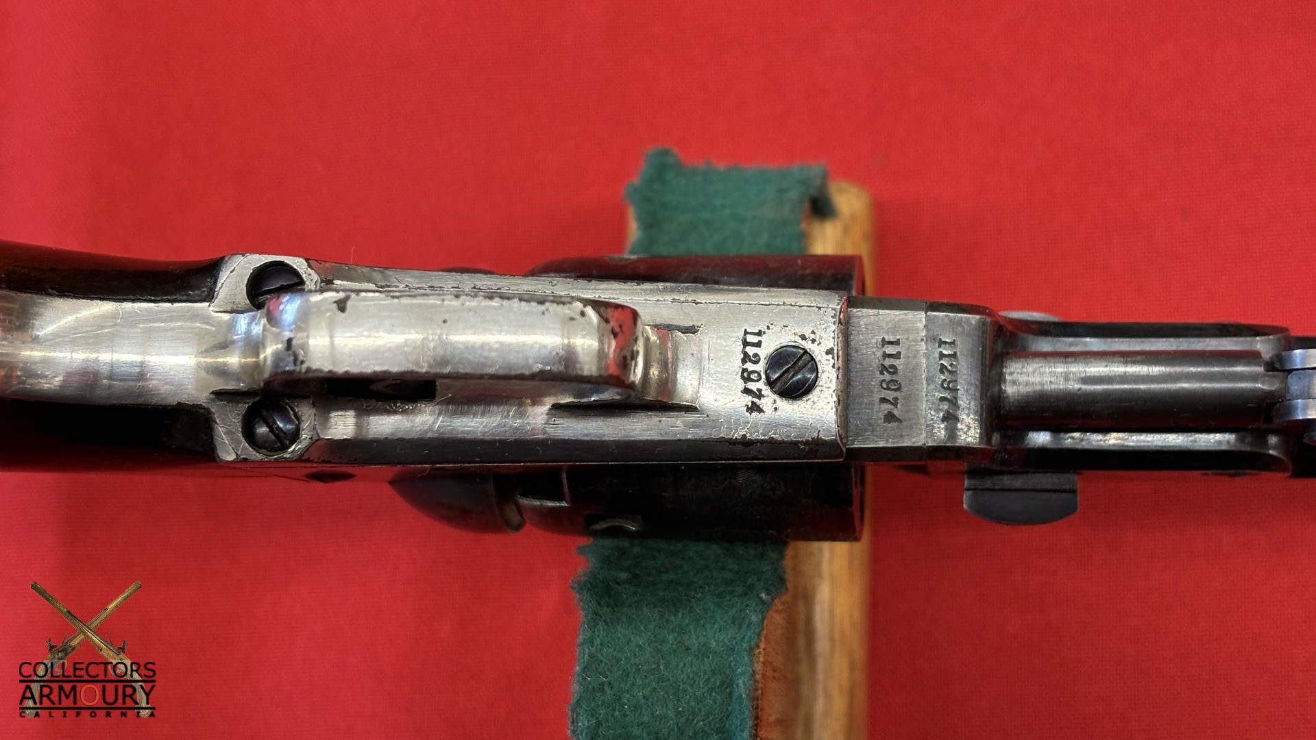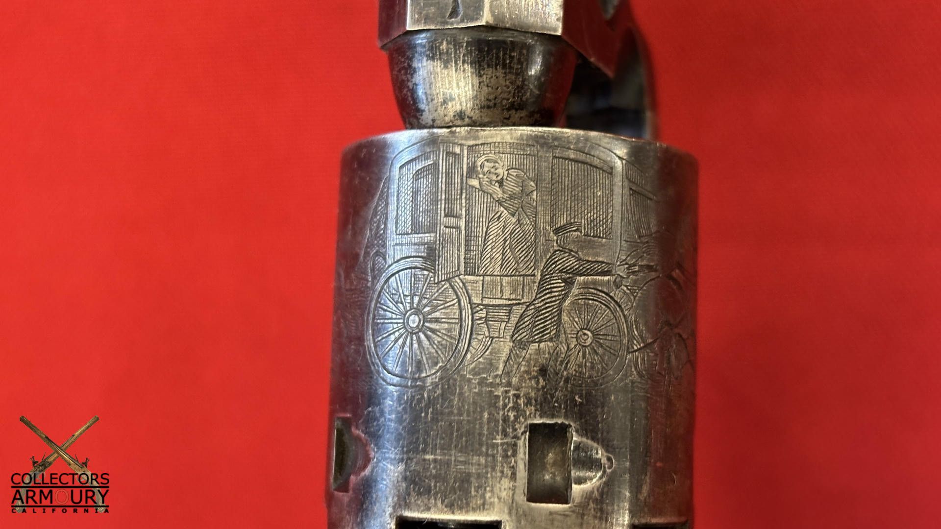 The cylinder with perfect stagecoach hold-up scene and 85% thinning original blue. The frame with 95% faded casehardening. All screws retain their bright niter blue with no wear. Backstrap and triggerguard retain 95% heavy silver.