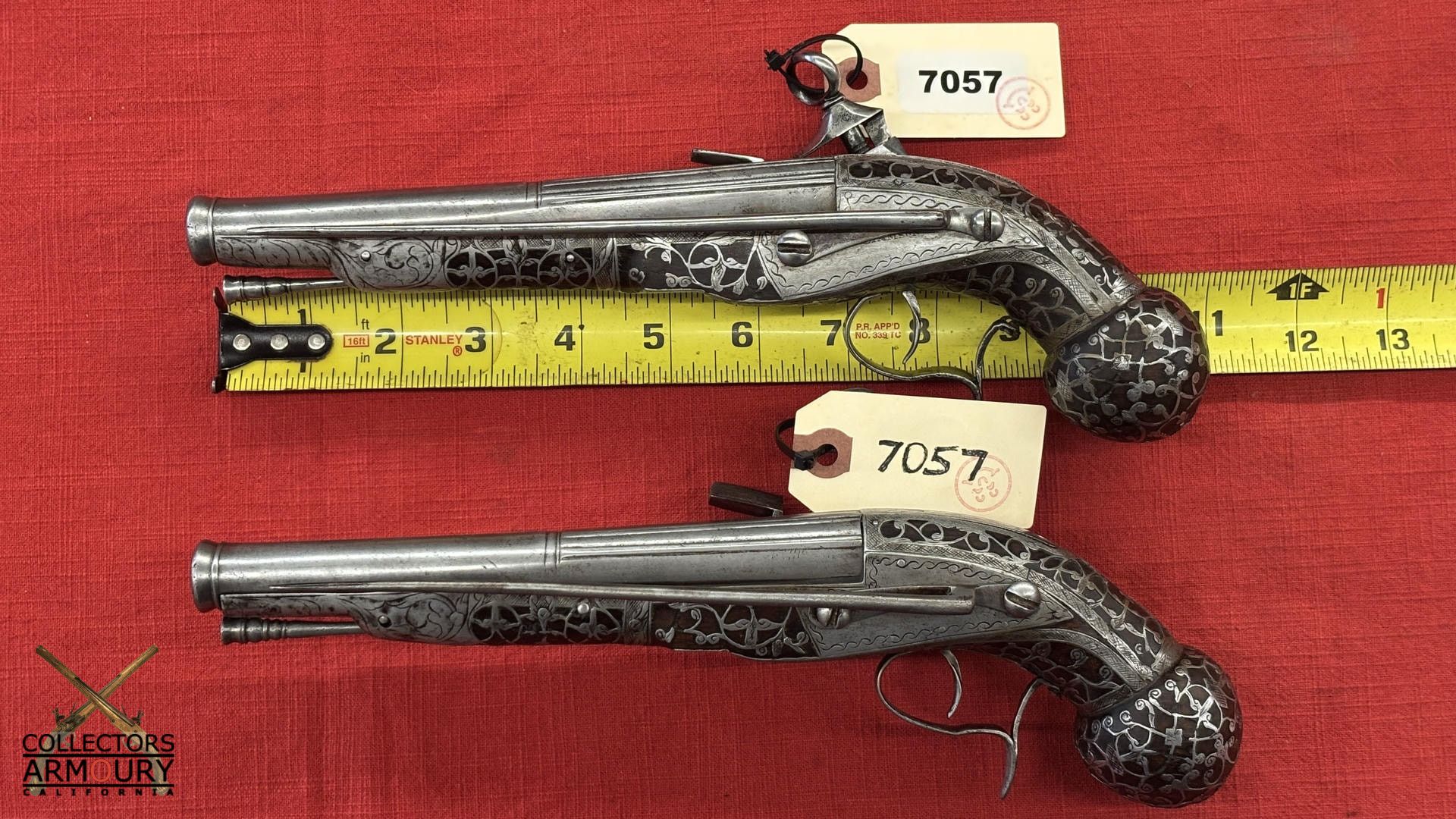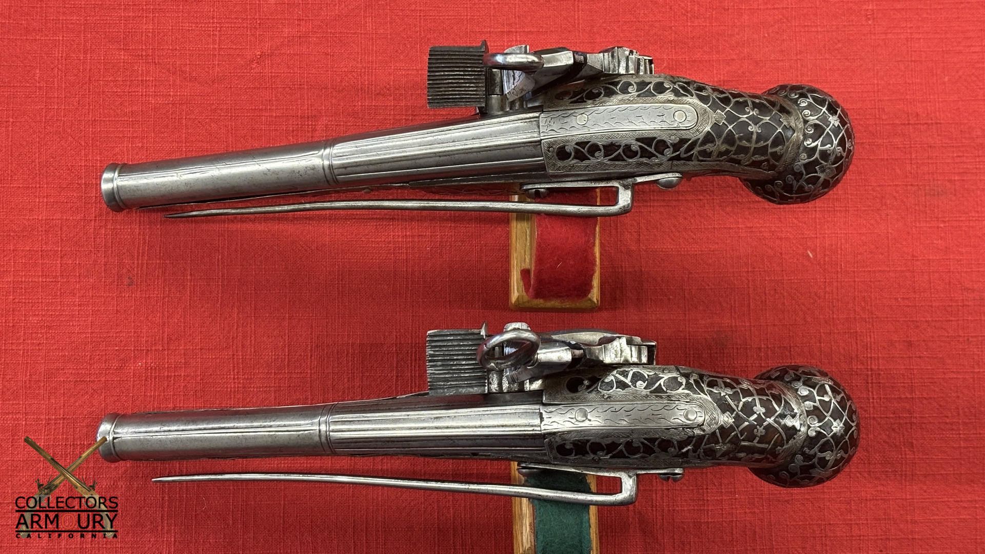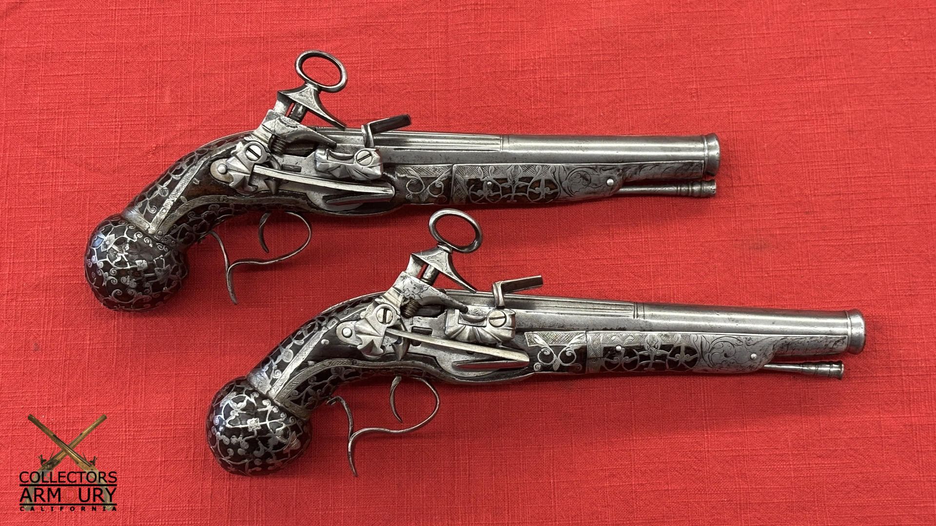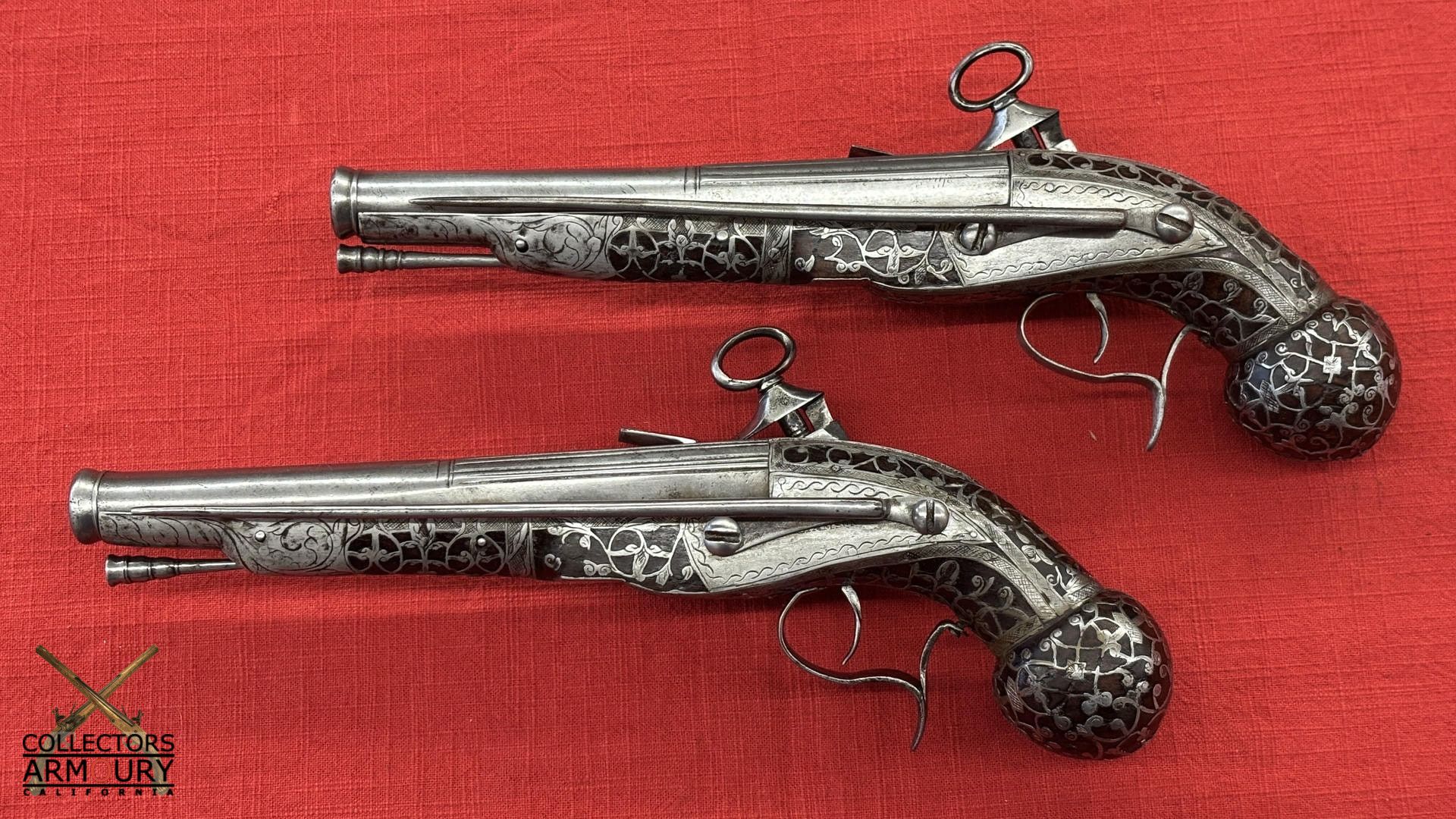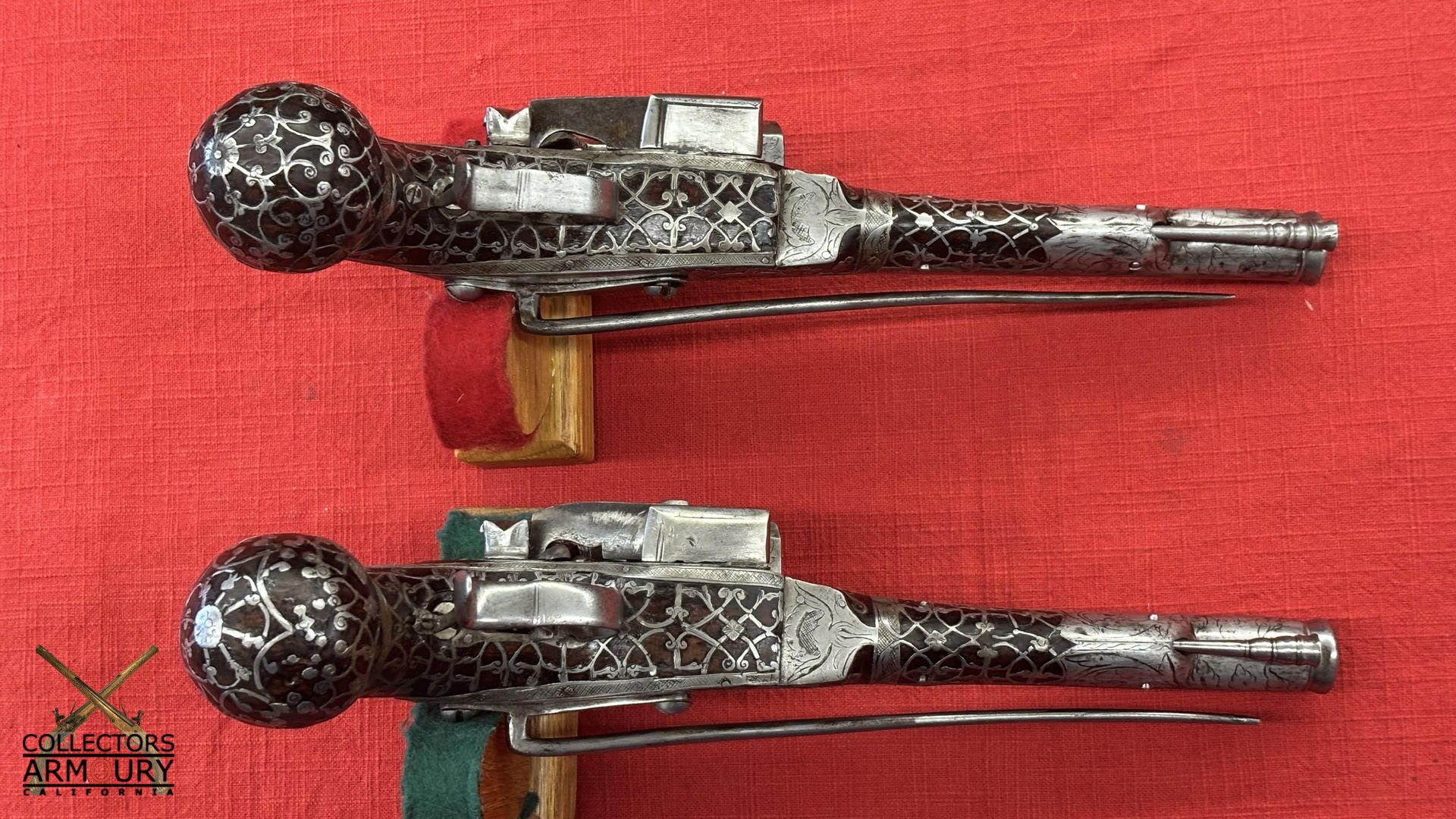 The pistols with expected wear but general fine condition. Steel ramrods are original to the pistols. Steel inlaid Ripoll pistols are so rare that the last similar pair was sold by Butterfield & Butterfield in October of 1996 as lot 3045 from the Smithsonian's deaccession of the Charles Bremner Hogg Jackson Collection. Actions are untested due to the incredibly strong mainsprings of miquelet locks. 11 and 1/2 inches overall.