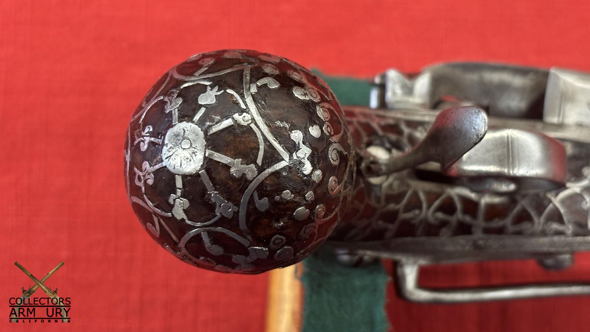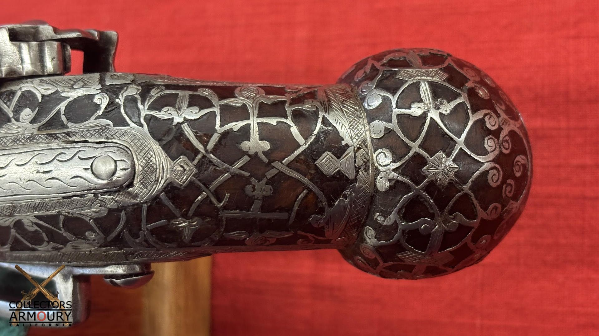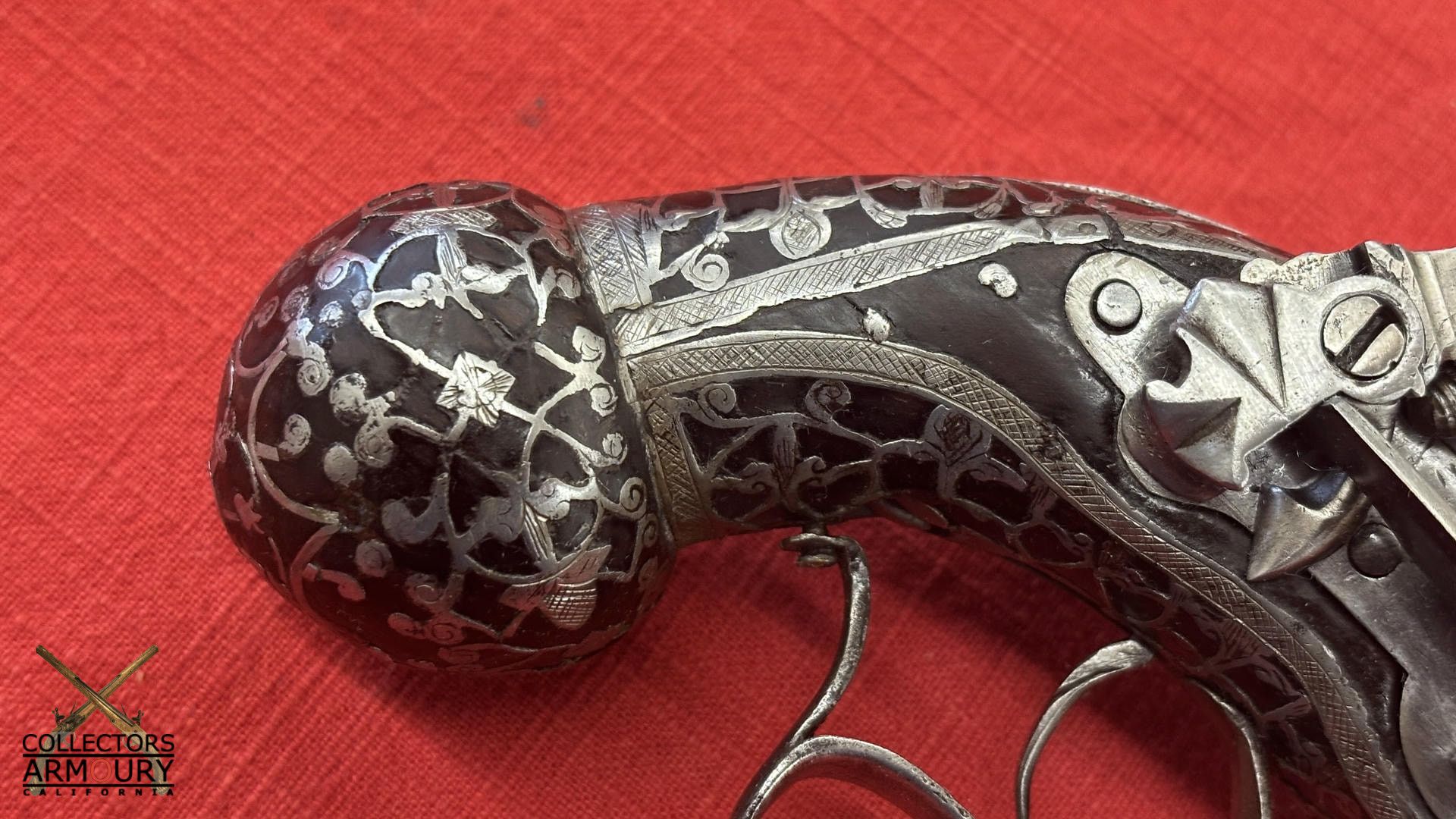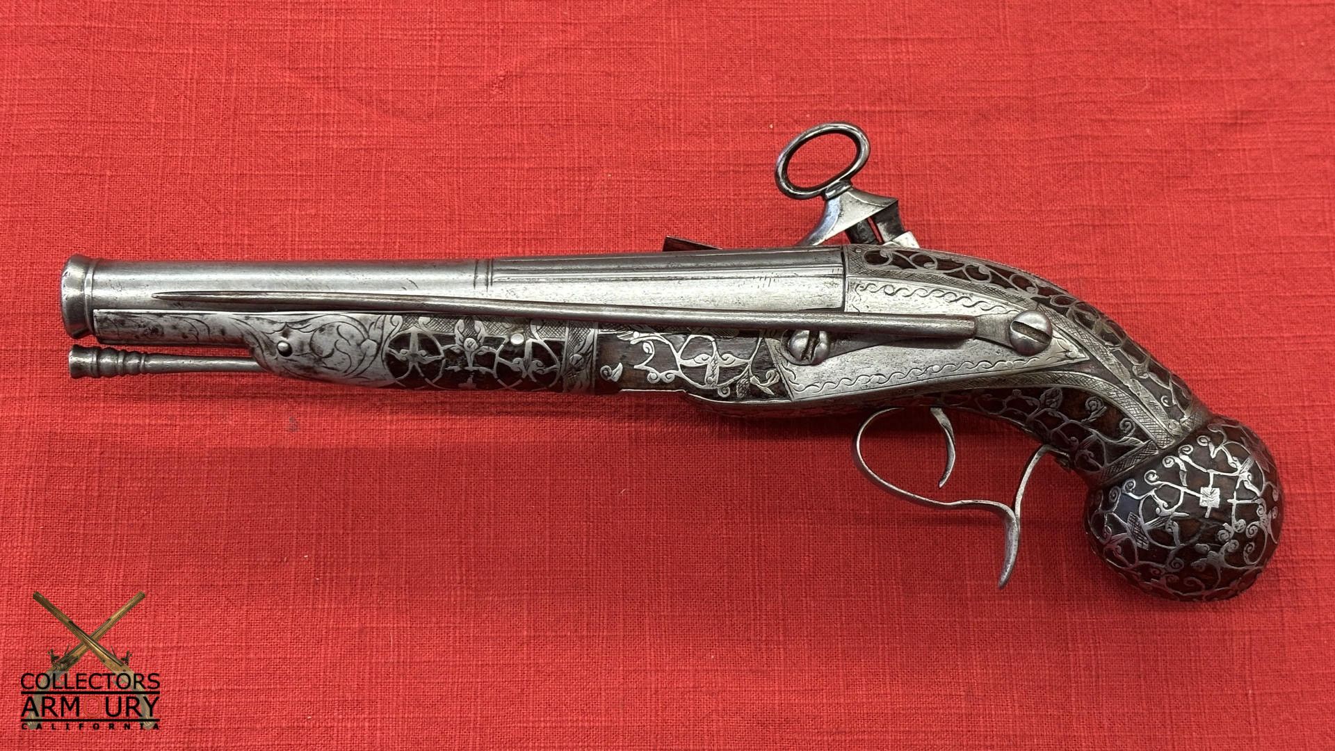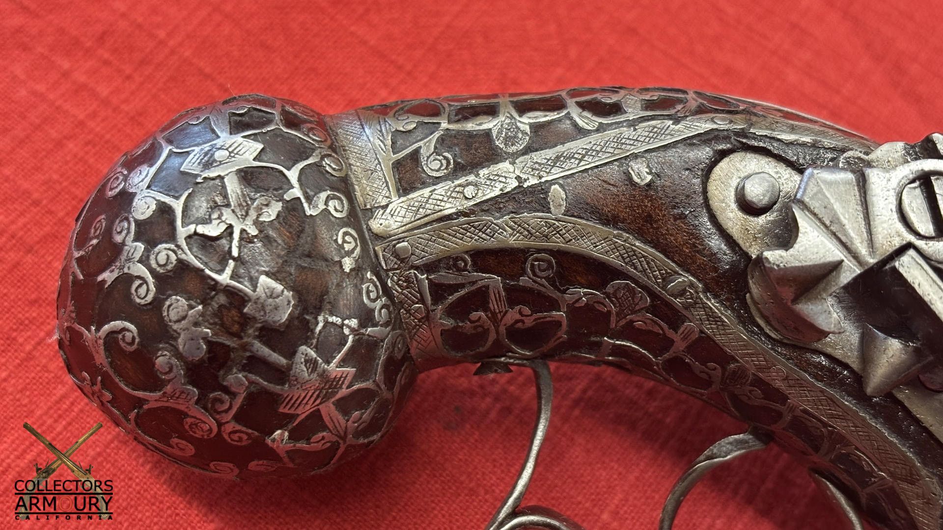 The pistols with expected wear but general fine condition. Steel ramrods are original to the pistols. Steel inlaid Ripoll pistols are so rare that the last similar pair was sold by Butterfield & Butterfield in October of 1996 as lot 3045 from the Smithsonian's deaccession of the Charles Bremner Hogg Jackson Collection. Actions are untested due to the incredibly strong mainsprings of miquelet locks. 11 and 1/2 inches overall.