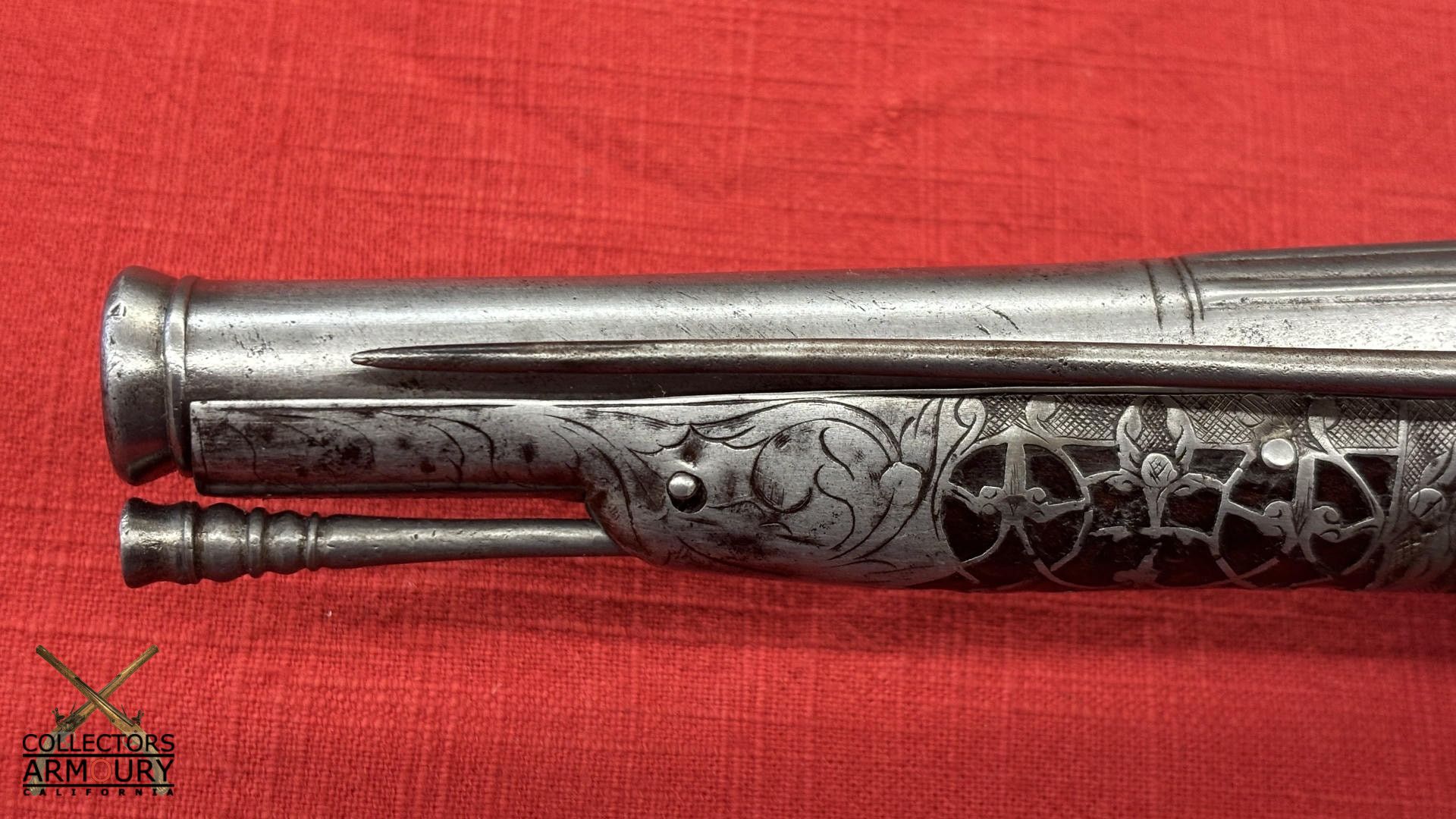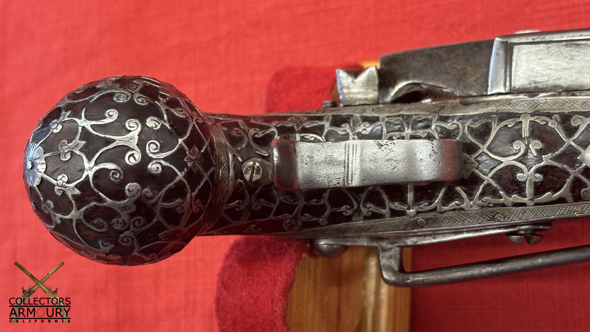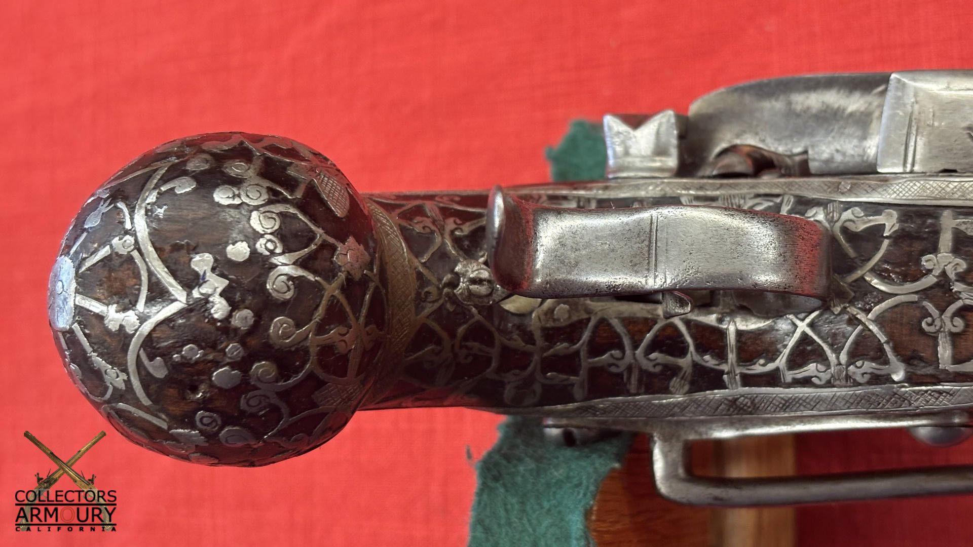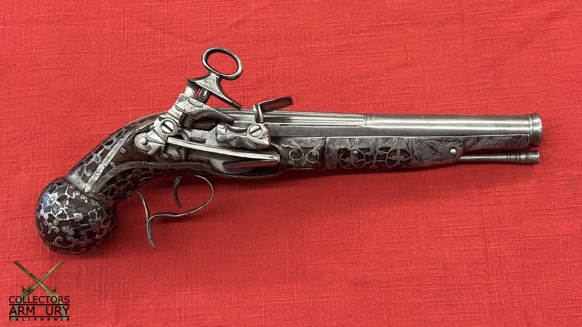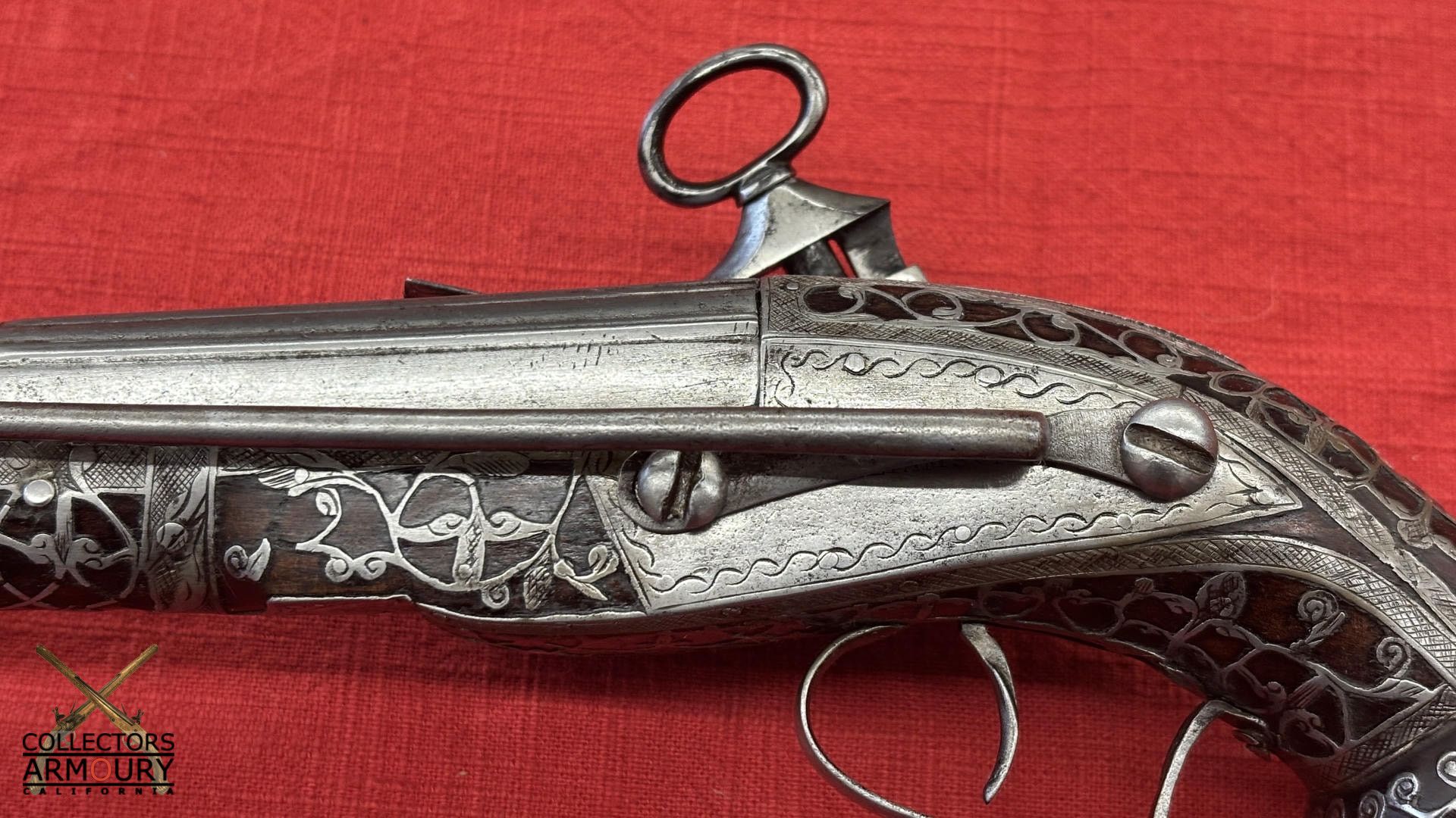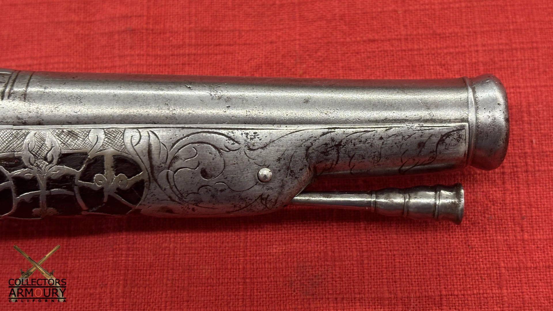 The pistols with expected wear but general fine condition. Steel ramrods are original to the pistols. Steel inlaid Ripoll pistols are so rare that the last similar pair was sold by Butterfield & Butterfield in October of 1996 as lot 3045 from the Smithsonian's deaccession of the Charles Bremner Hogg Jackson Collection. Actions are untested due to the incredibly strong mainsprings of miquelet locks. 11 and 1/2 inches overall.