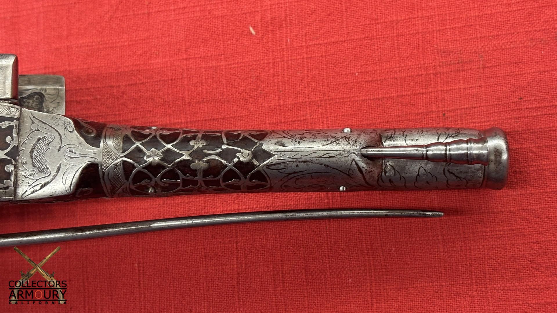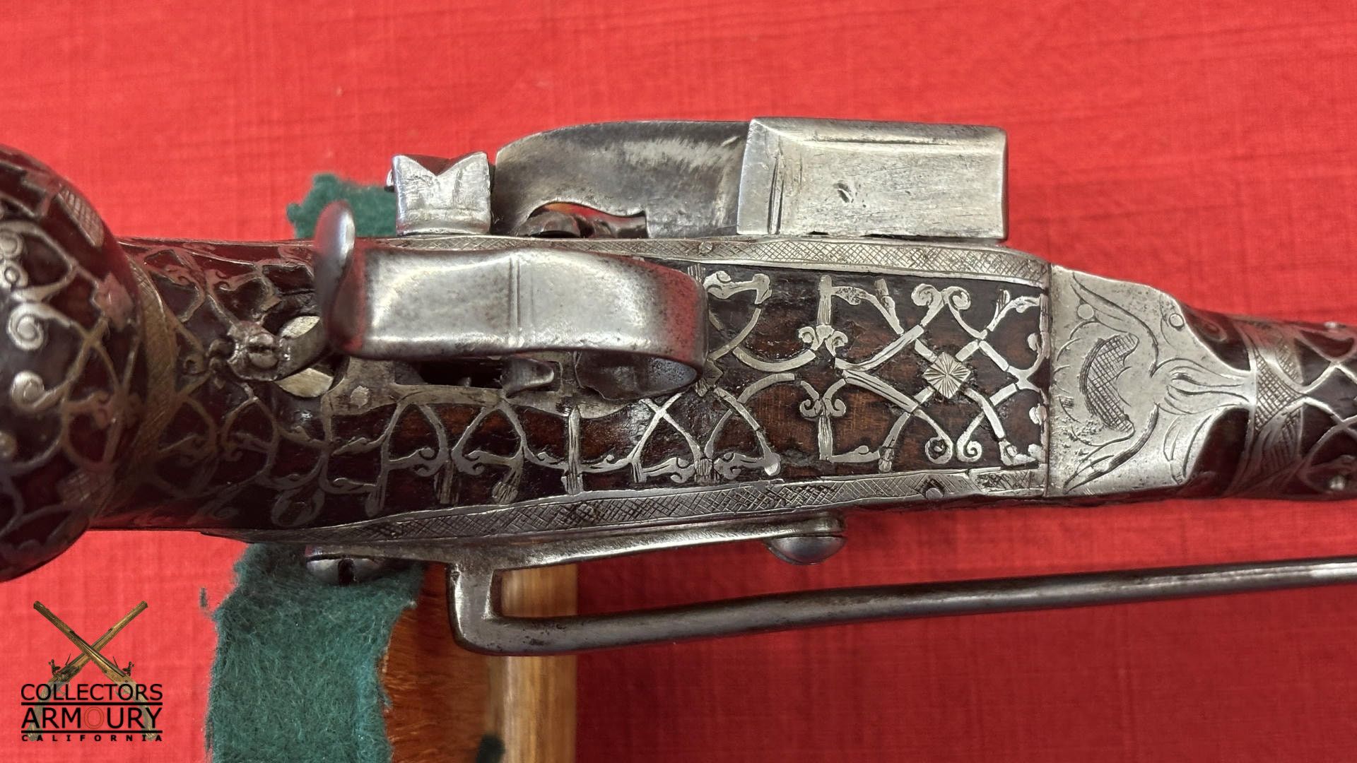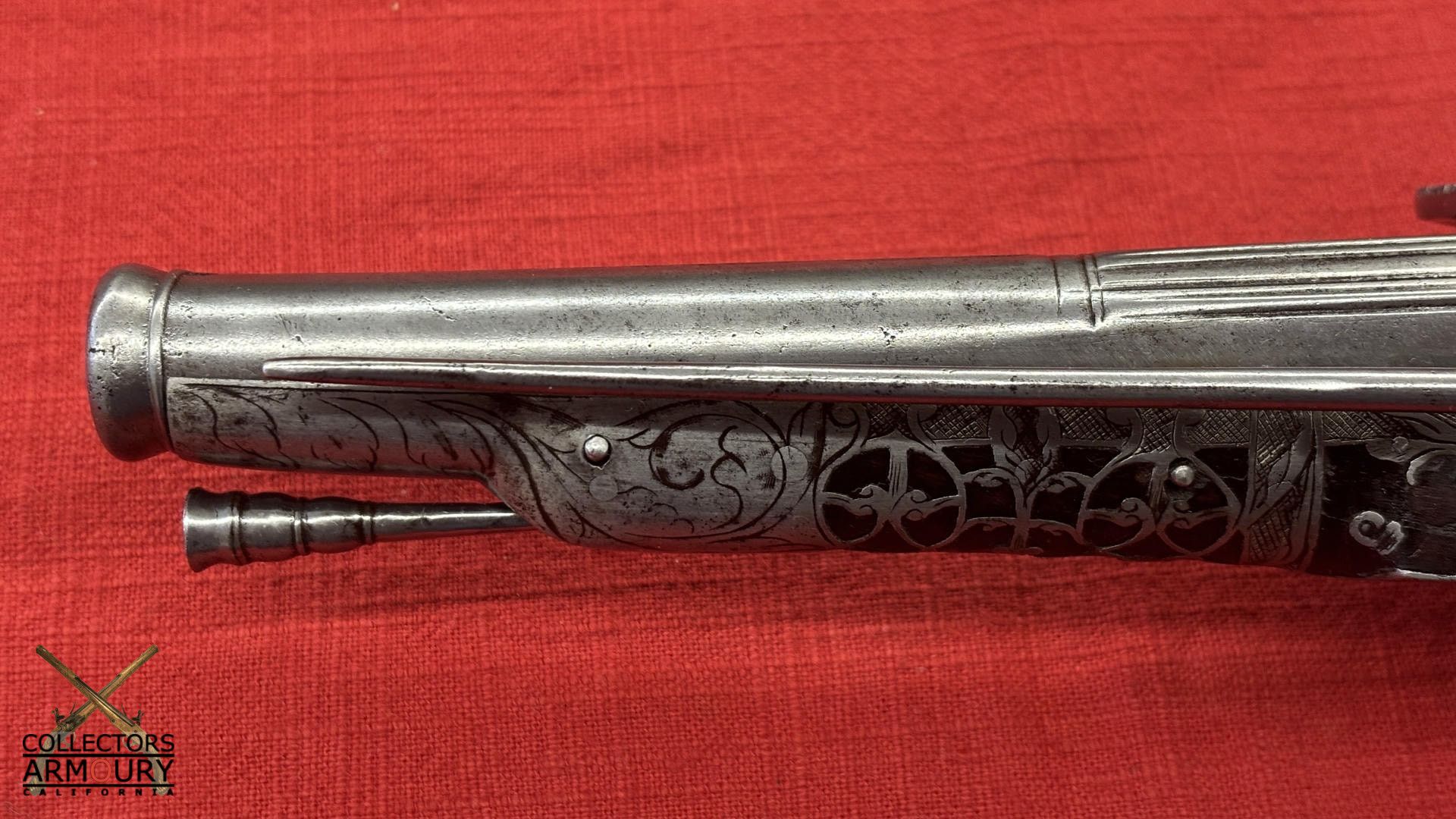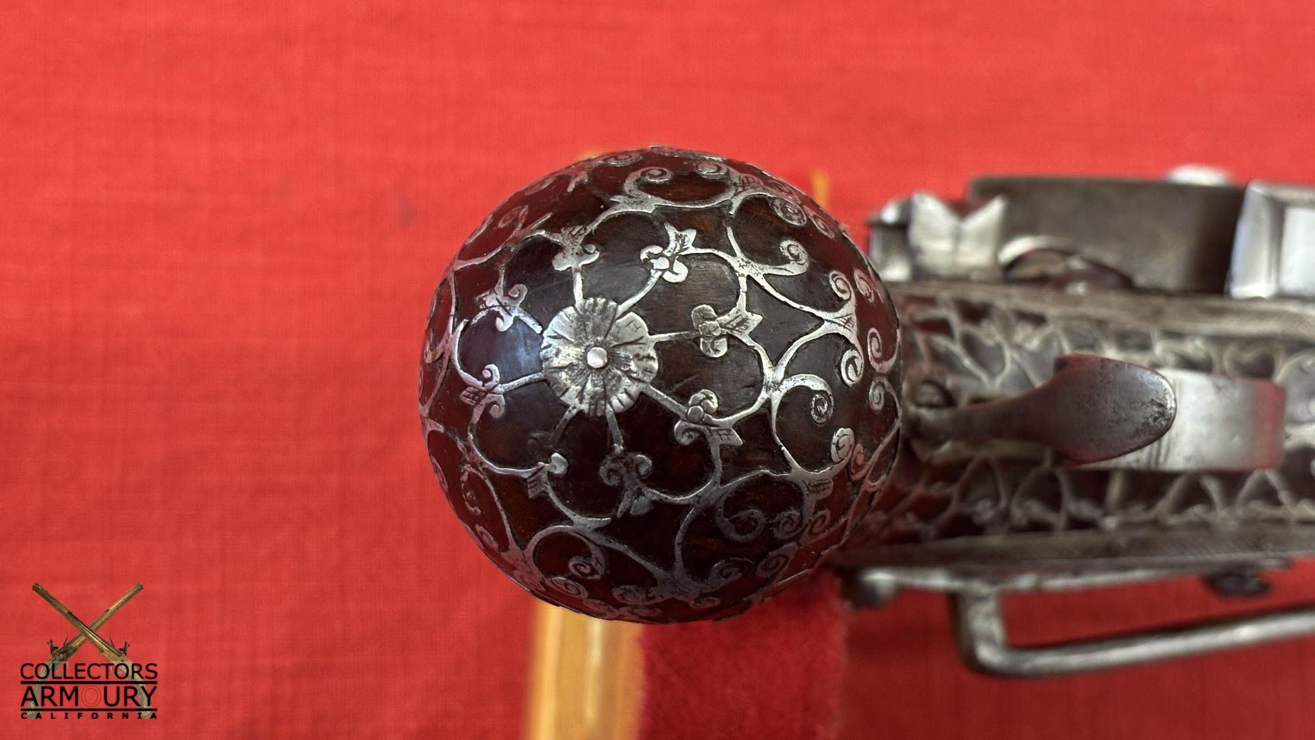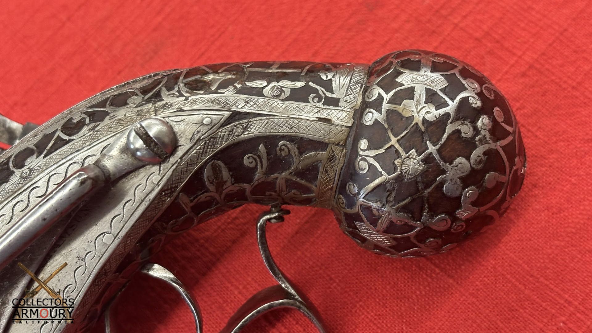 The pistols with expected wear but general fine condition. Steel ramrods are original to the pistols. Steel inlaid Ripoll pistols are so rare that the last similar pair was sold by Butterfield & Butterfield in October of 1996 as lot 3045 from the Smithsonian's deaccession of the Charles Bremner Hogg Jackson Collection. Actions are untested due to the incredibly strong mainsprings of miquelet locks. 11 and 1/2 inches overall.