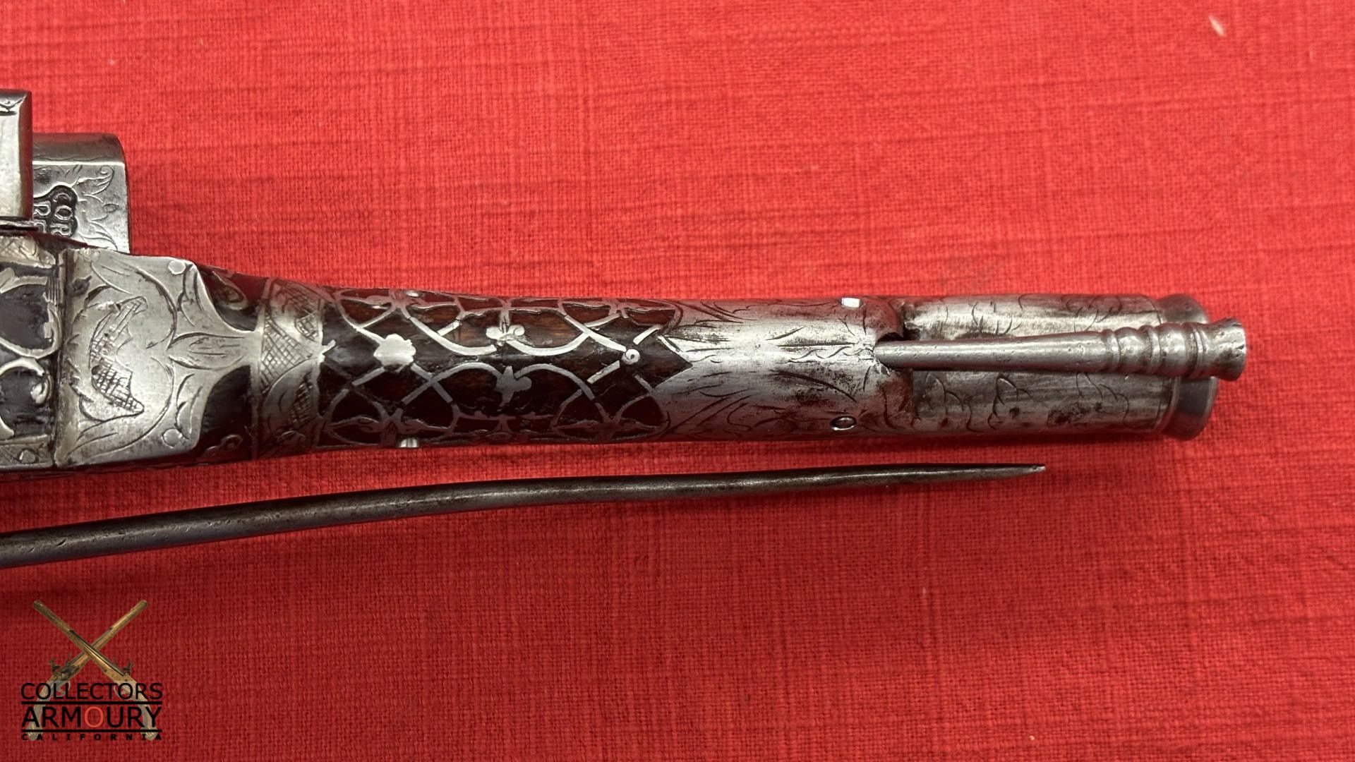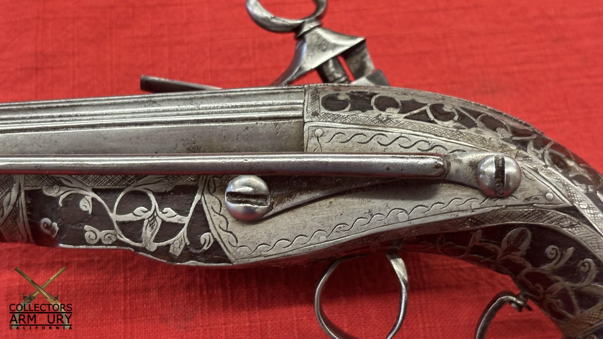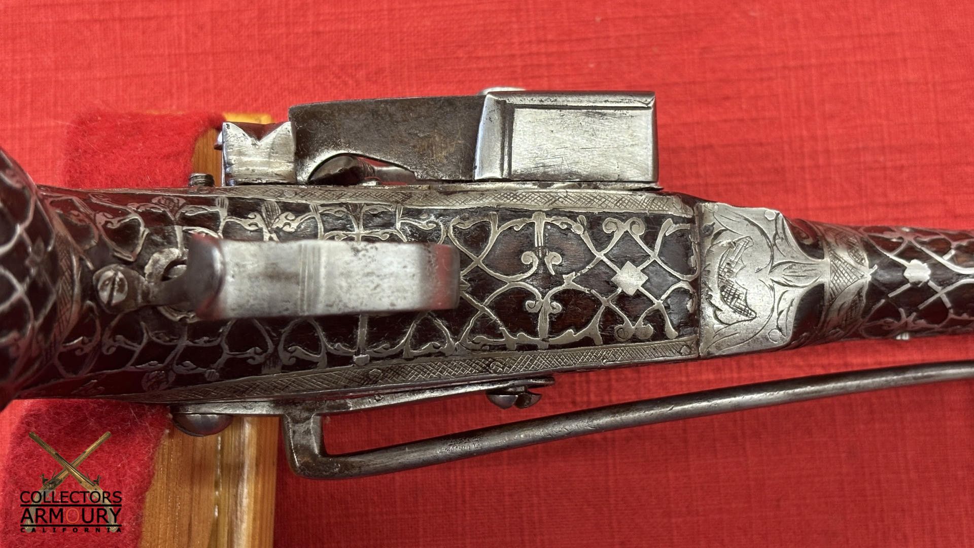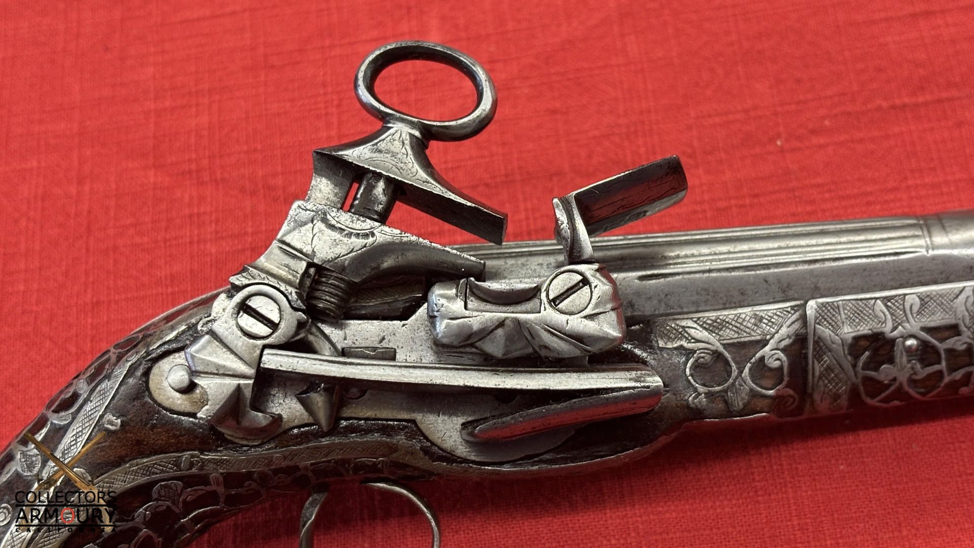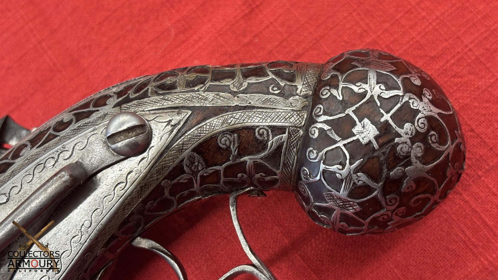 The pistols with expected wear but general fine condition. Steel ramrods are original to the pistols. Steel inlaid Ripoll pistols are so rare that the last similar pair was sold by Butterfield & Butterfield in October of 1996 as lot 3045 from the Smithsonian's deaccession of the Charles Bremner Hogg Jackson Collection. Actions are untested due to the incredibly strong mainsprings of miquelet locks. 11 and 1/2 inches overall.