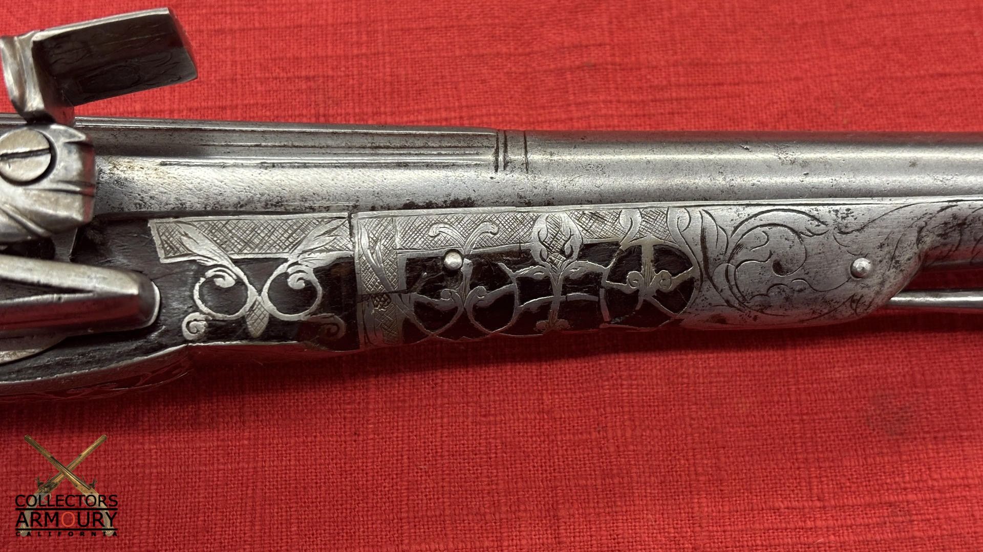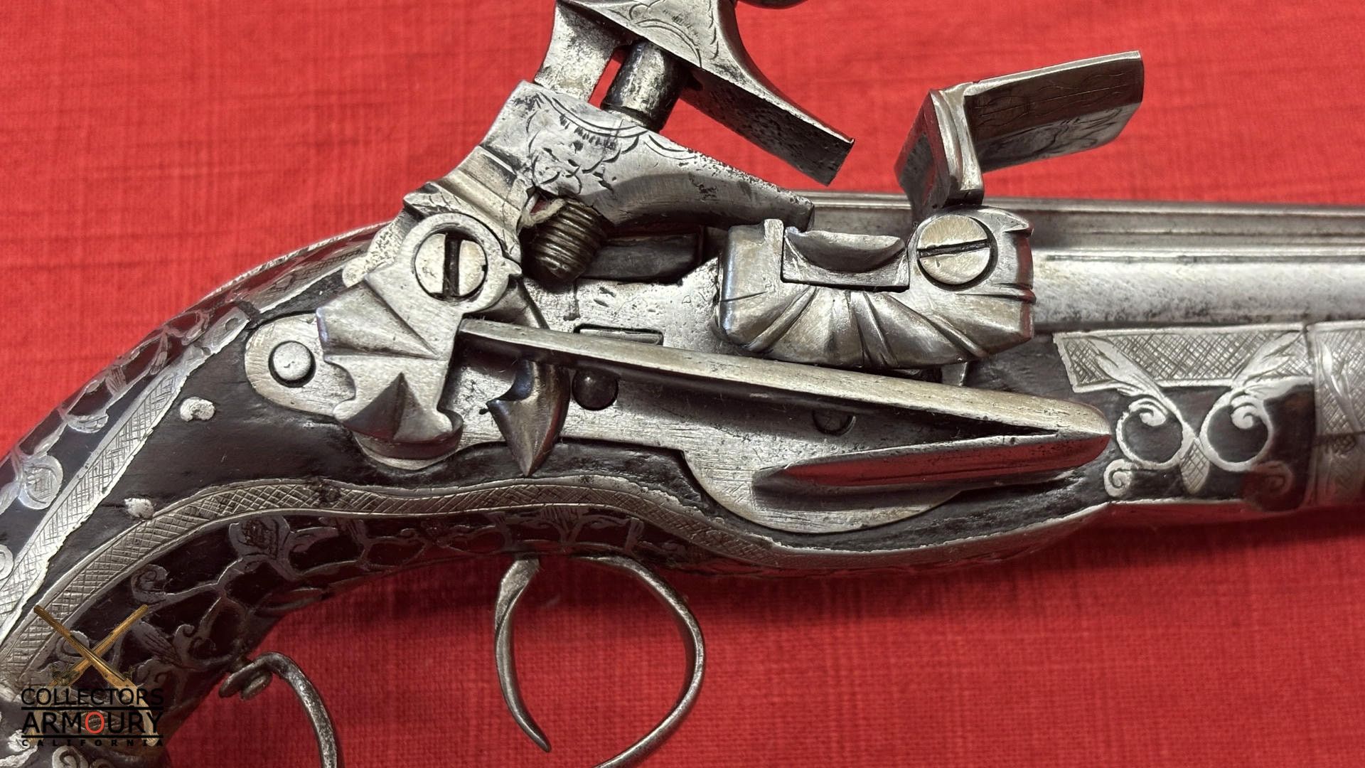 An Extremely Rare Matched Pair Of Engraved Steel Inlaid Spanish Ripoll Miquelet Belt Pistols Signed ‘CORBE’ On The Frizzens Circa 1710.