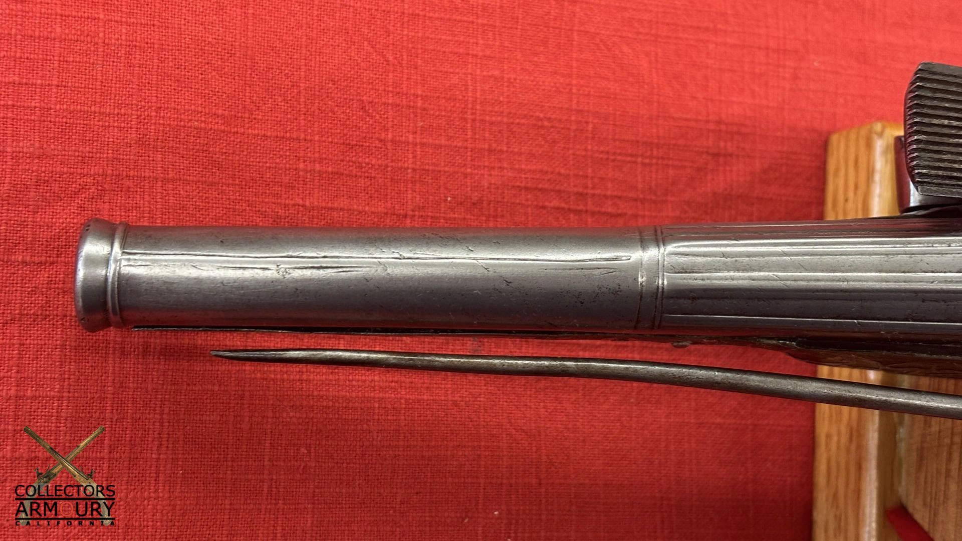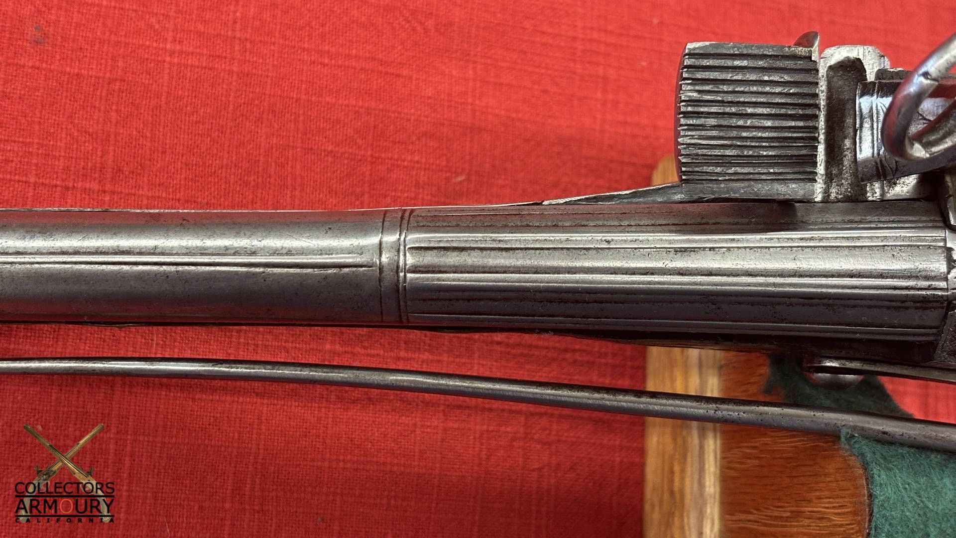 7 inch ‘Spanish’ form barrels with cannon muzzles, fluted for half of their length with raised rib. .50 caliber. The barrels unmarked.
