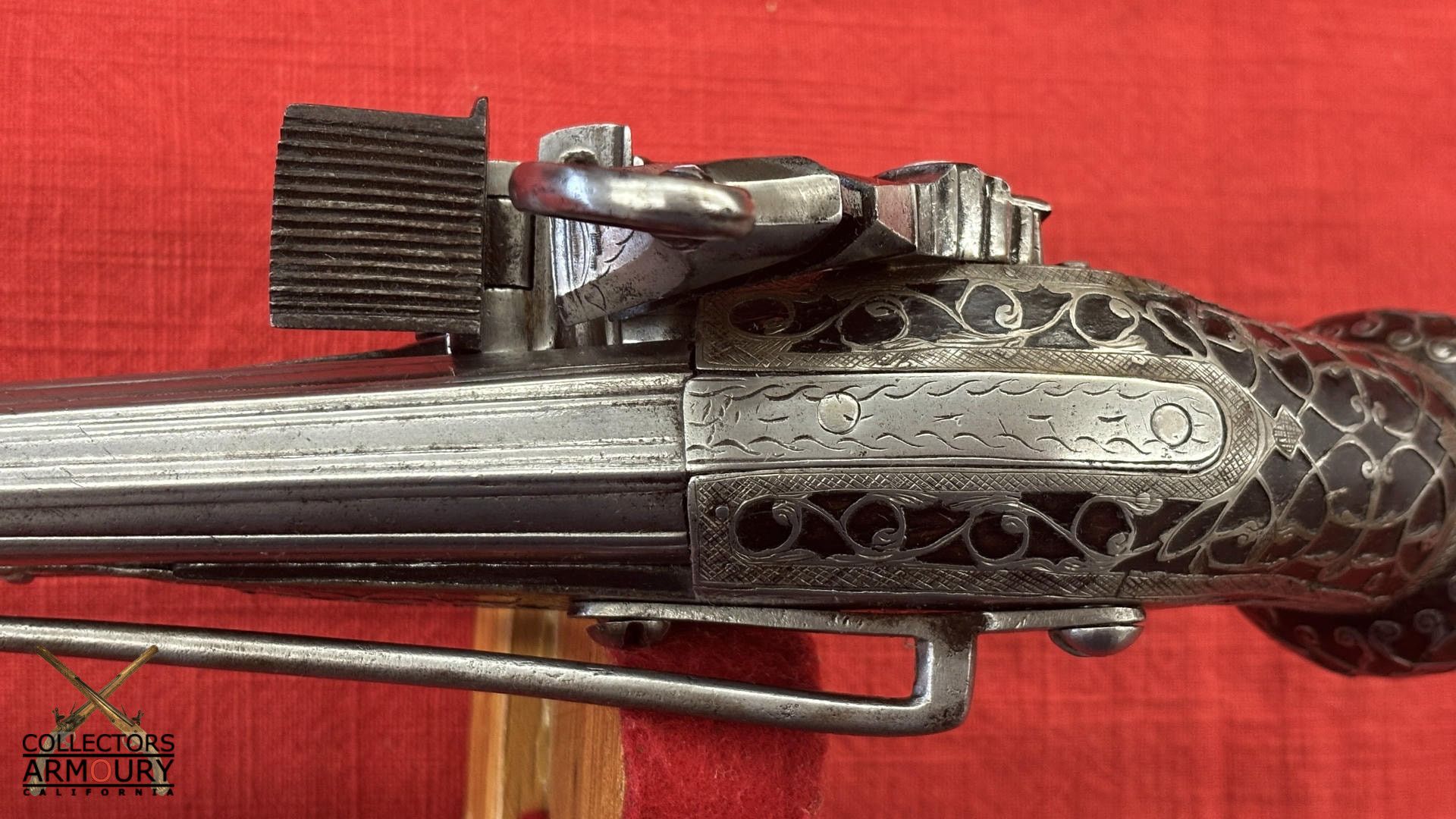 Beautiful patilla locks with engraved hammers and faceted frizzen retainers. The frizzens stamped with ‘CORBE’ signature. Engraved steel side plates with 7 and 1/2 inch steel belt hooks. Long engraved steel fore-end caps. Spurred trigger guards. Ball butt. The walnut stocks entirely encased in engraved steel throughout their length.
