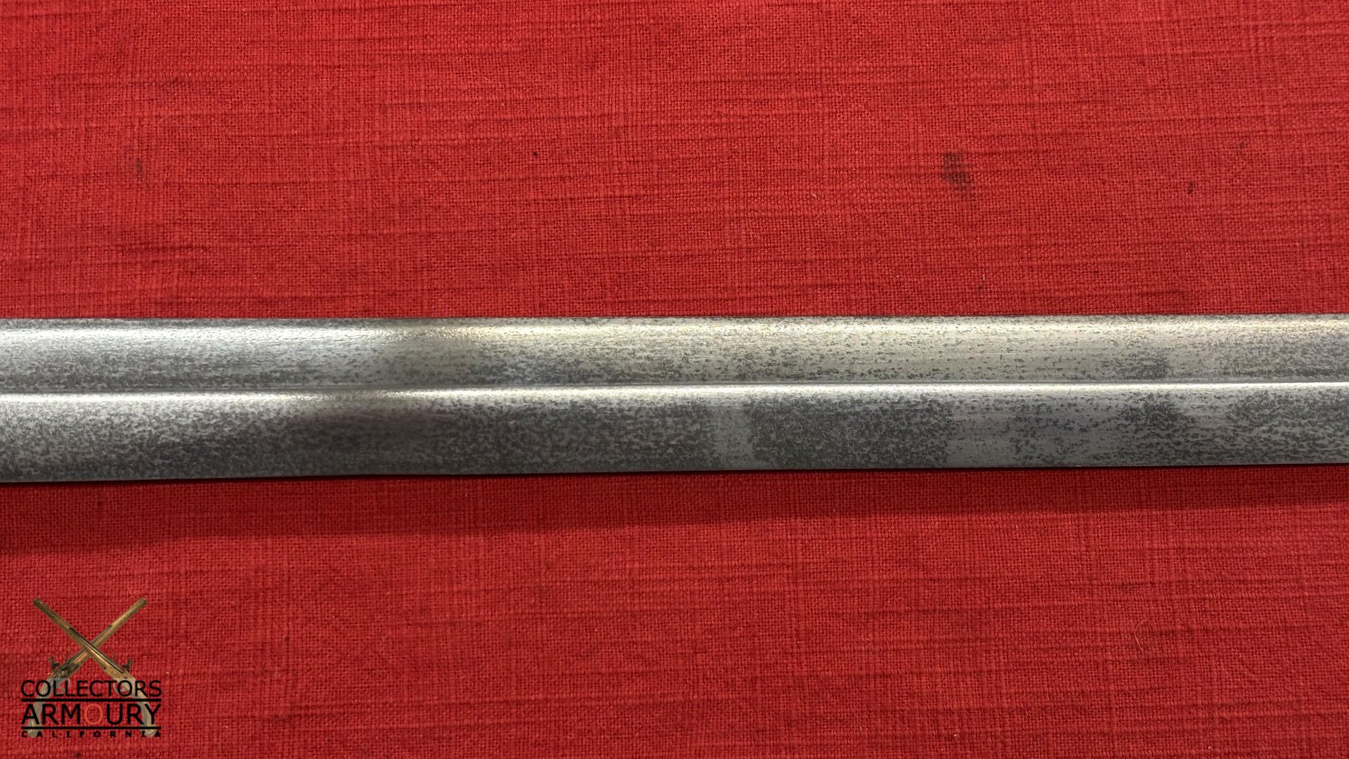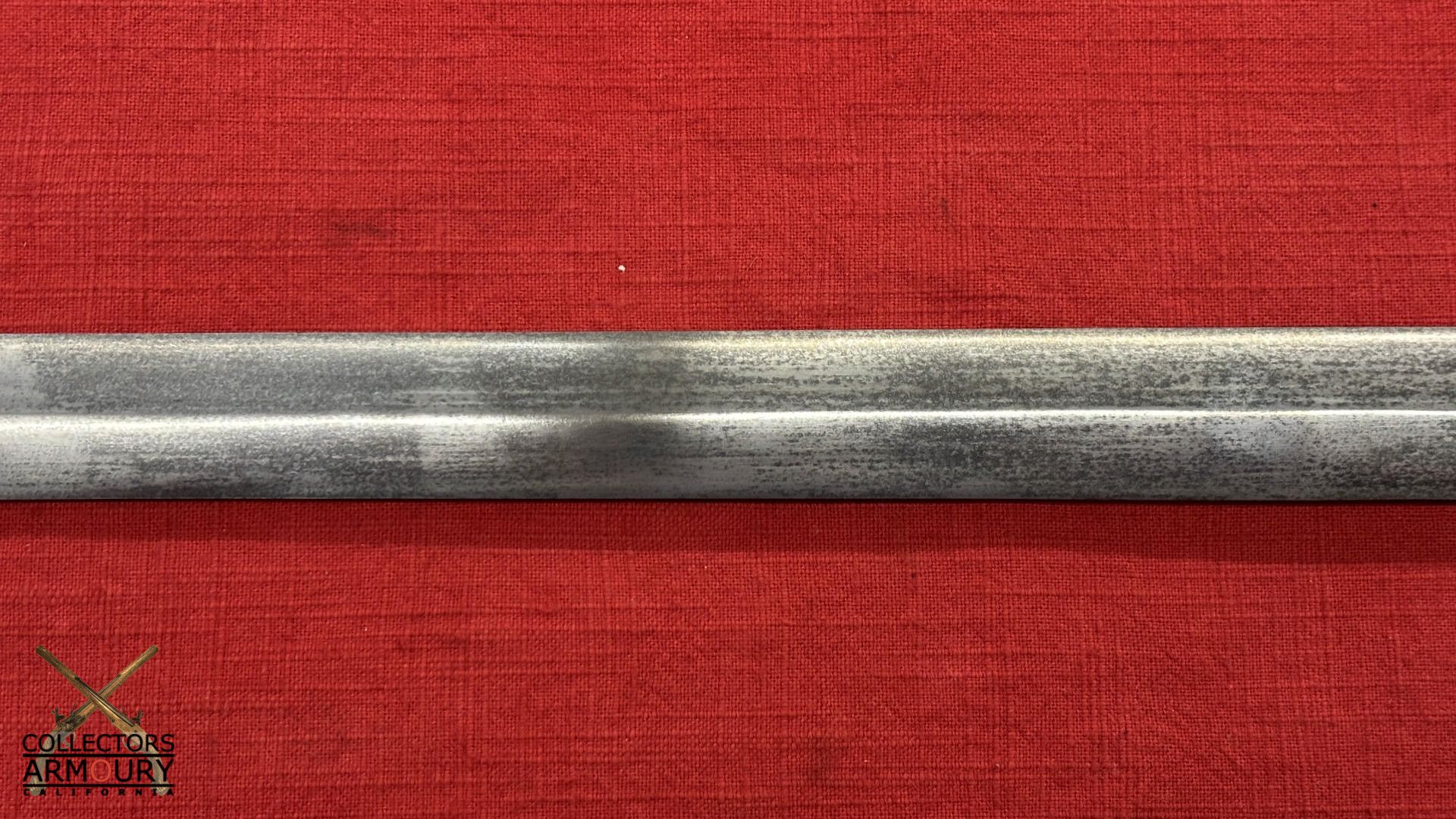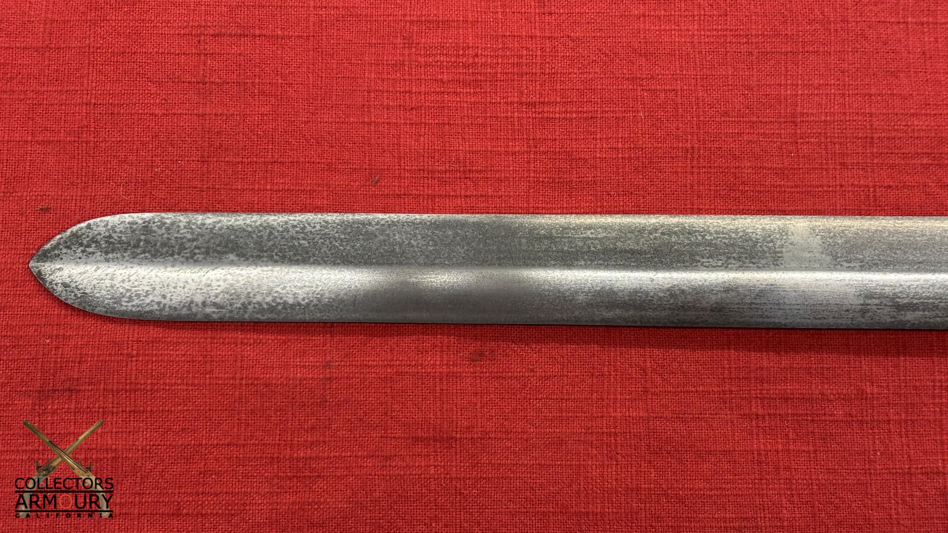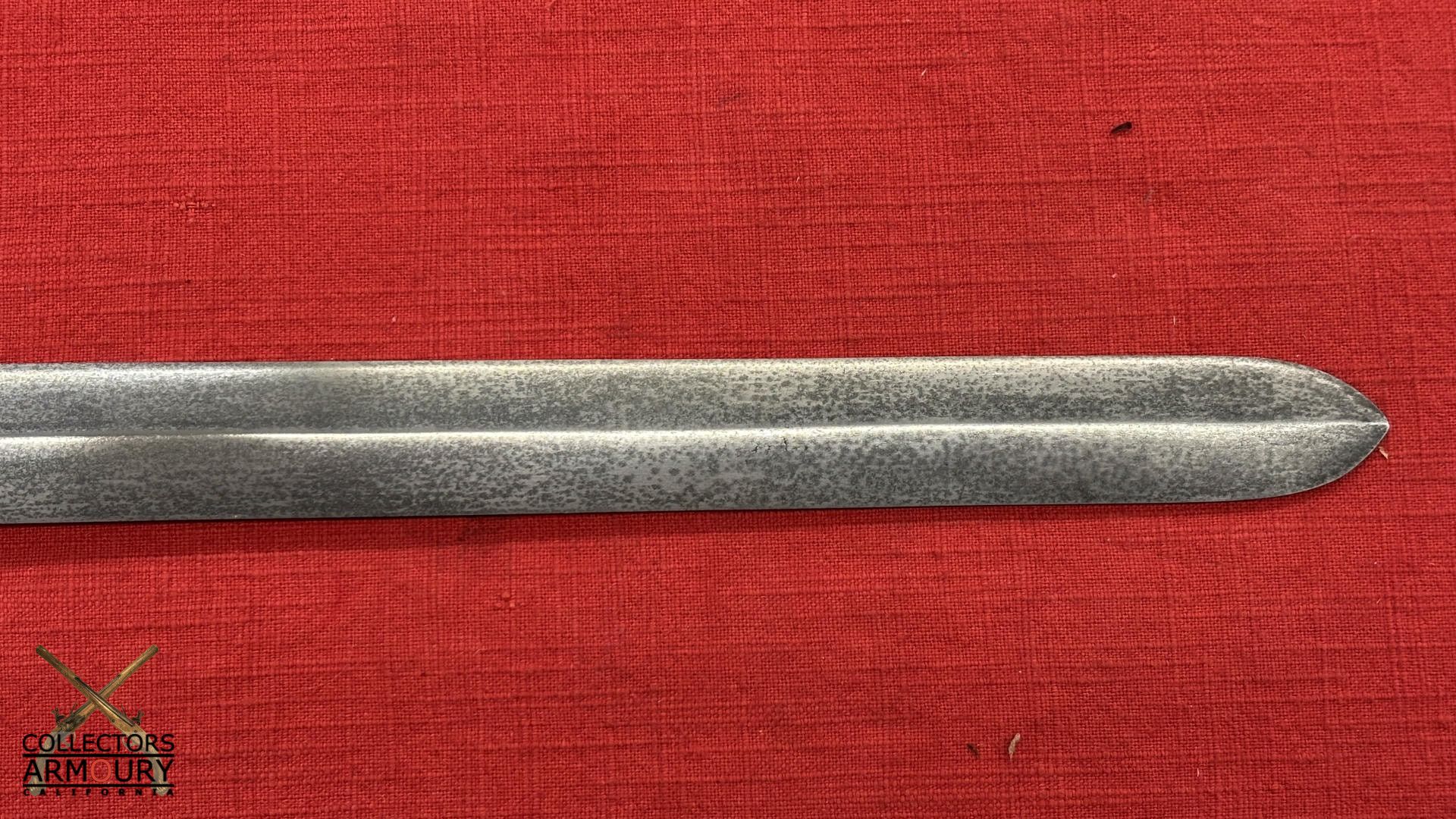 24 and 1/2 inch double edge blade of classic shape which inspired the Japanese ken blades. The steel of superb quality likely pattern welded.