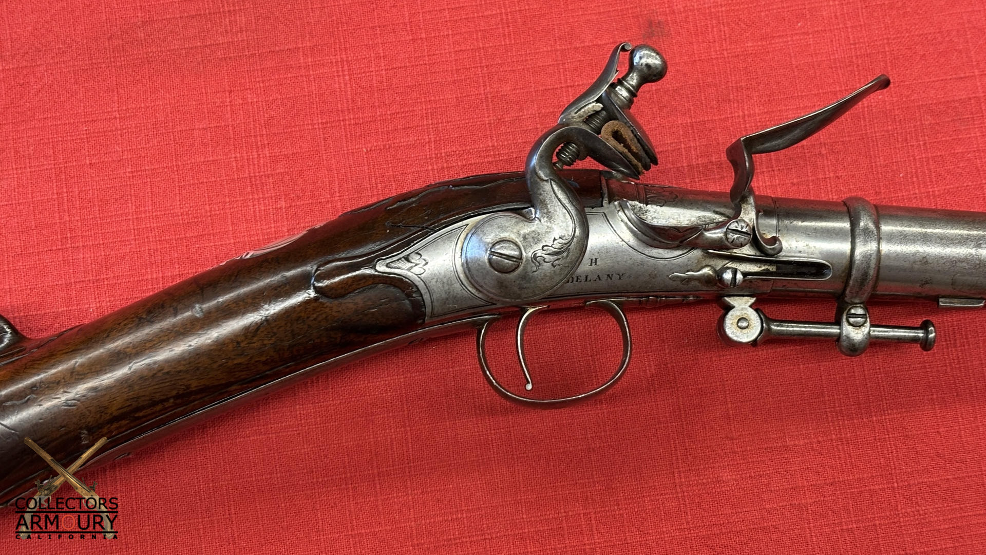 These are genuine dueling pistols and not officer’s pistols. The barrels are plain but the casehardened patent breeches have deeply sunken gold lined poincons with “Palmer” in relief and further enhanced with a gold line. Gold lined touch-holes. Engraved , stepped bolted locks of the best quality engraved signature in a flourish “Palmer” push on safeties. Blued trigger guards with pineapple finials.